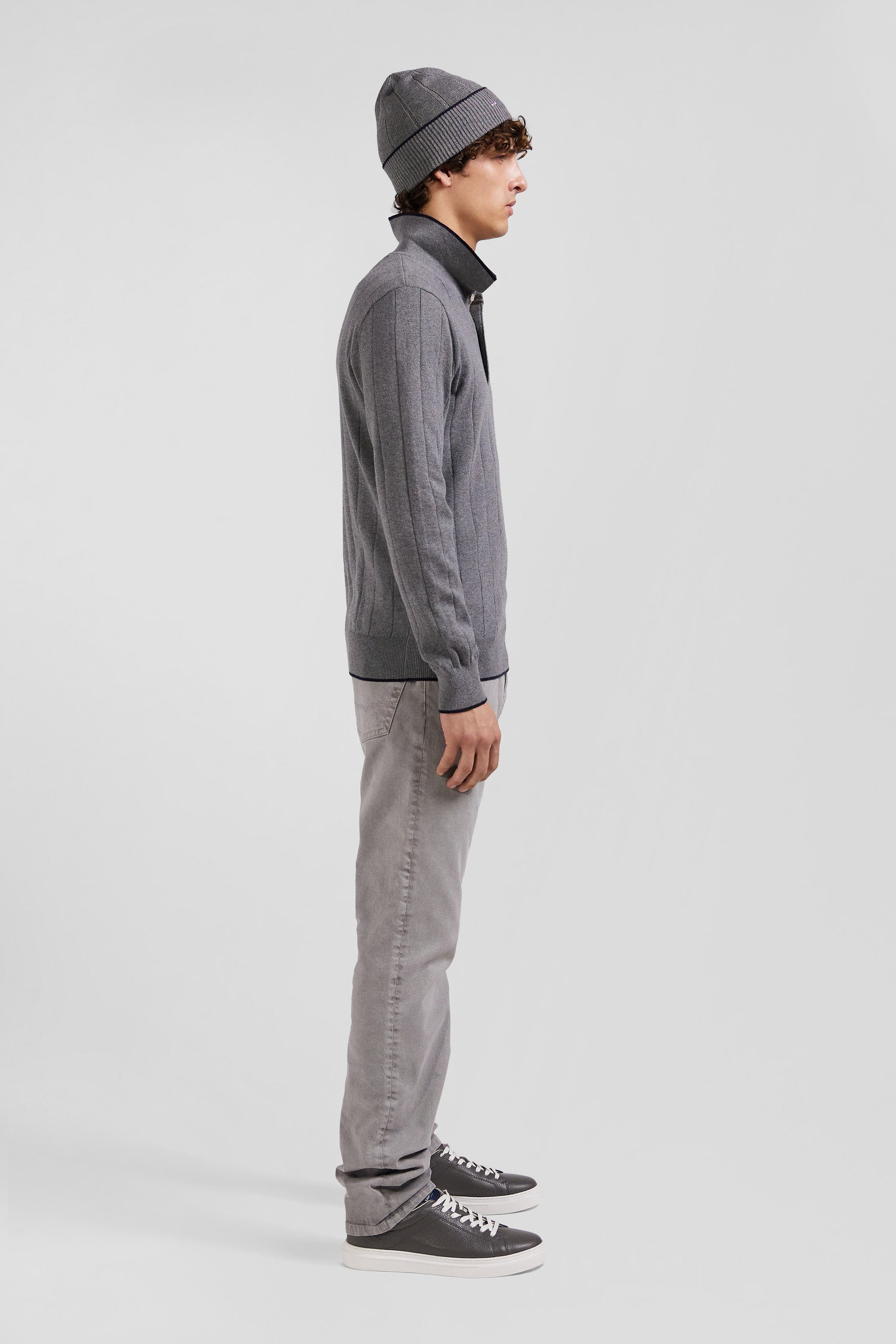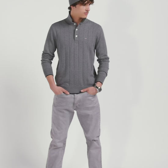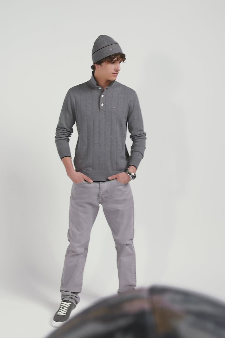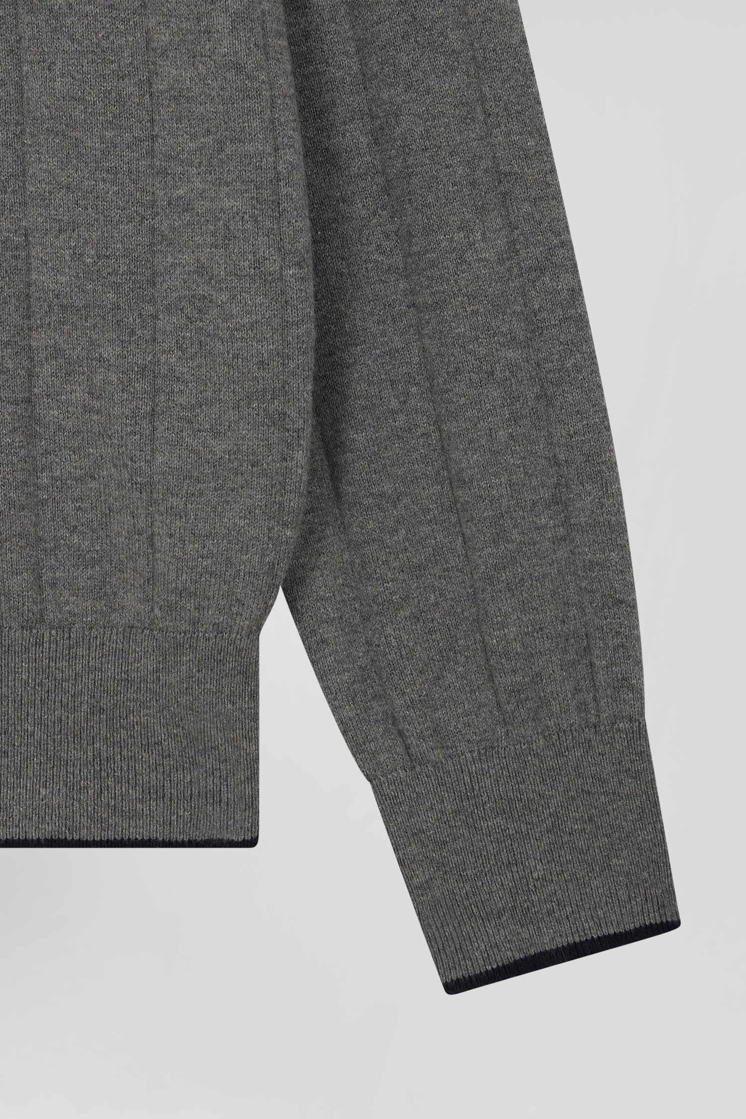 Ce pull col maillot, confectionné à partir d'un mélange de coton et cachemire, offre à la silhouette automne-hiver une touche d'élégance avec son fin liseré contrasté. Le tricotage en côtes plates rend hommage à notre emblématique rayure cerclée de rugby, réinterprétée ici de manière verticale pour une touche moderne. La plaquette de boutonnage, réalisée en ruban tricoté en côtes plates, ajoute une finition soignée à ce pull chaud. Parfait pour ceux qui cherchent à combiner confort et style sophistiqué, ce pull est un choix idéal pour une allure chic et décontractée.