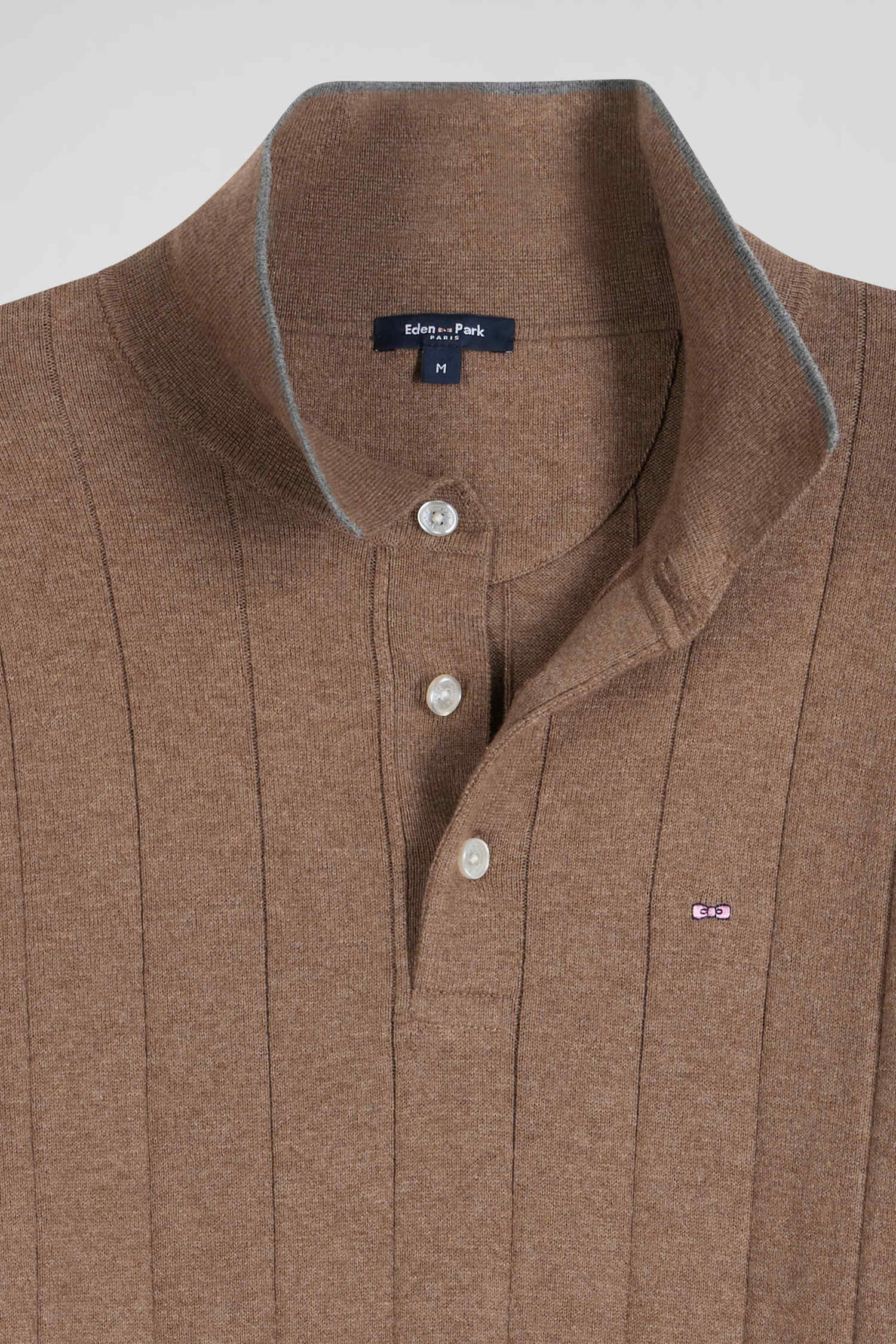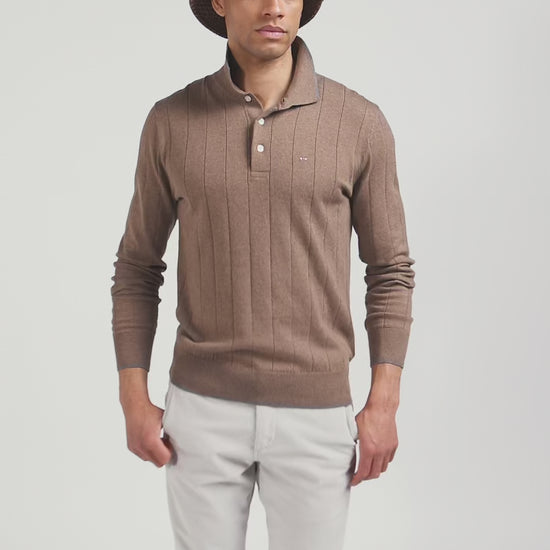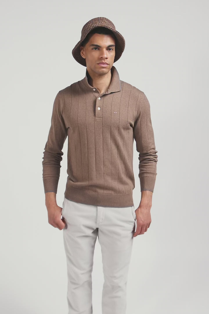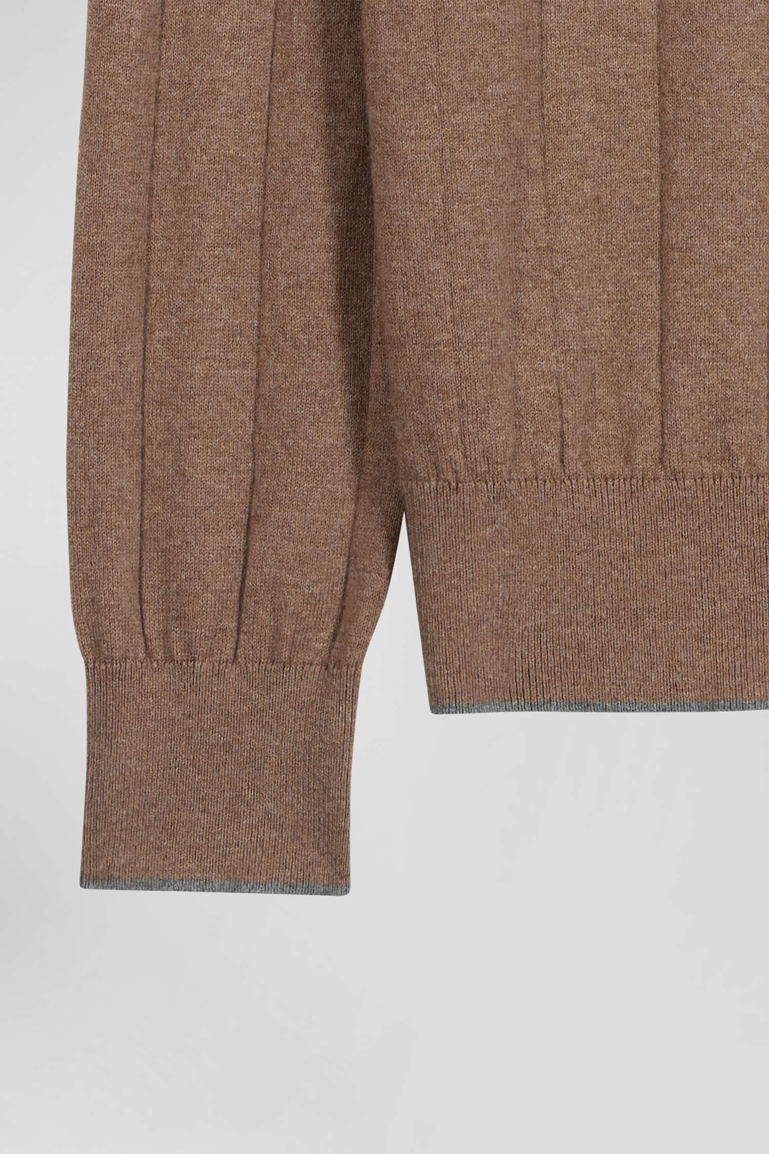 Ce pull col maillot, confectionné à partir d'un mélange de coton et cachemire, offre à la silhouette automne-hiver une touche d'élégance avec son fin liseré contrasté. Le tricotage en côtes plates rend hommage à notre emblématique rayure cerclée de rugby, réinterprétée ici de manière verticale pour une touche moderne. La plaquette de boutonnage, réalisée en ruban tricoté en côtes plates, ajoute une finition soignée à ce pull chaud. Parfait pour ceux qui cherchent à combiner confort et style sophistiqué, ce pull est un choix idéal pour une allure chic et décontractée.