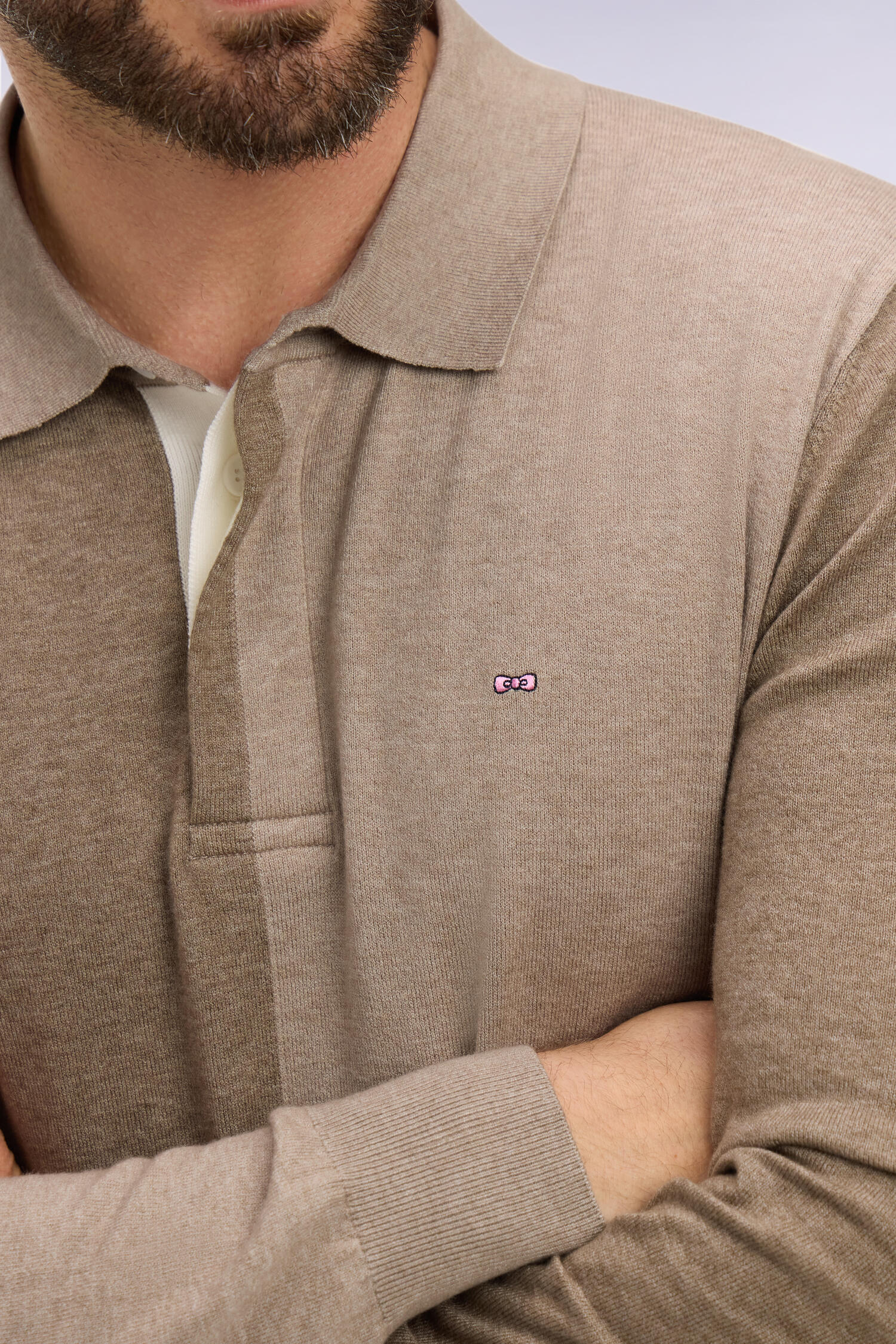 Ce pull à col maillot, tricoté en jersey et jersey envers, avec une élégante transition créant un effet de rayure verticale, revisite le maillot de rugby japonais avec une touche de raffinement. Cette pièce tendance et intemporelle à la fois se dote de bords-côtes ton sur ton et d'une patte de boutonnage en ruban chevron blanc.