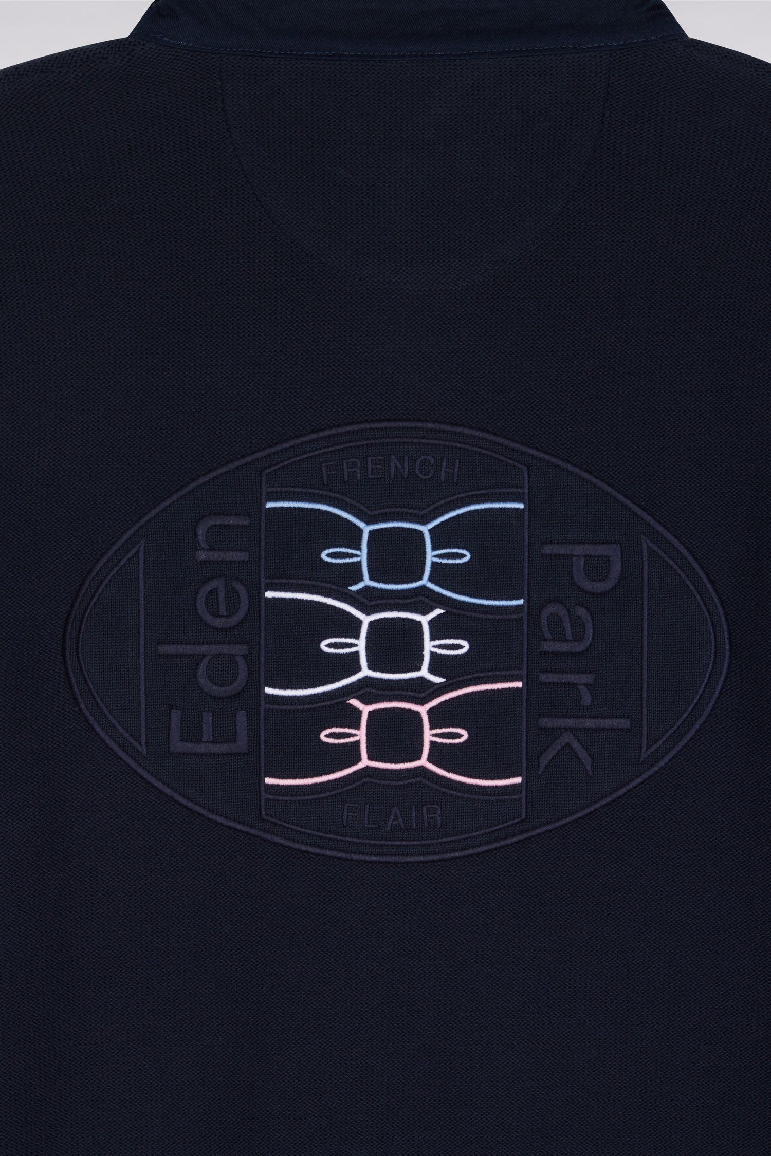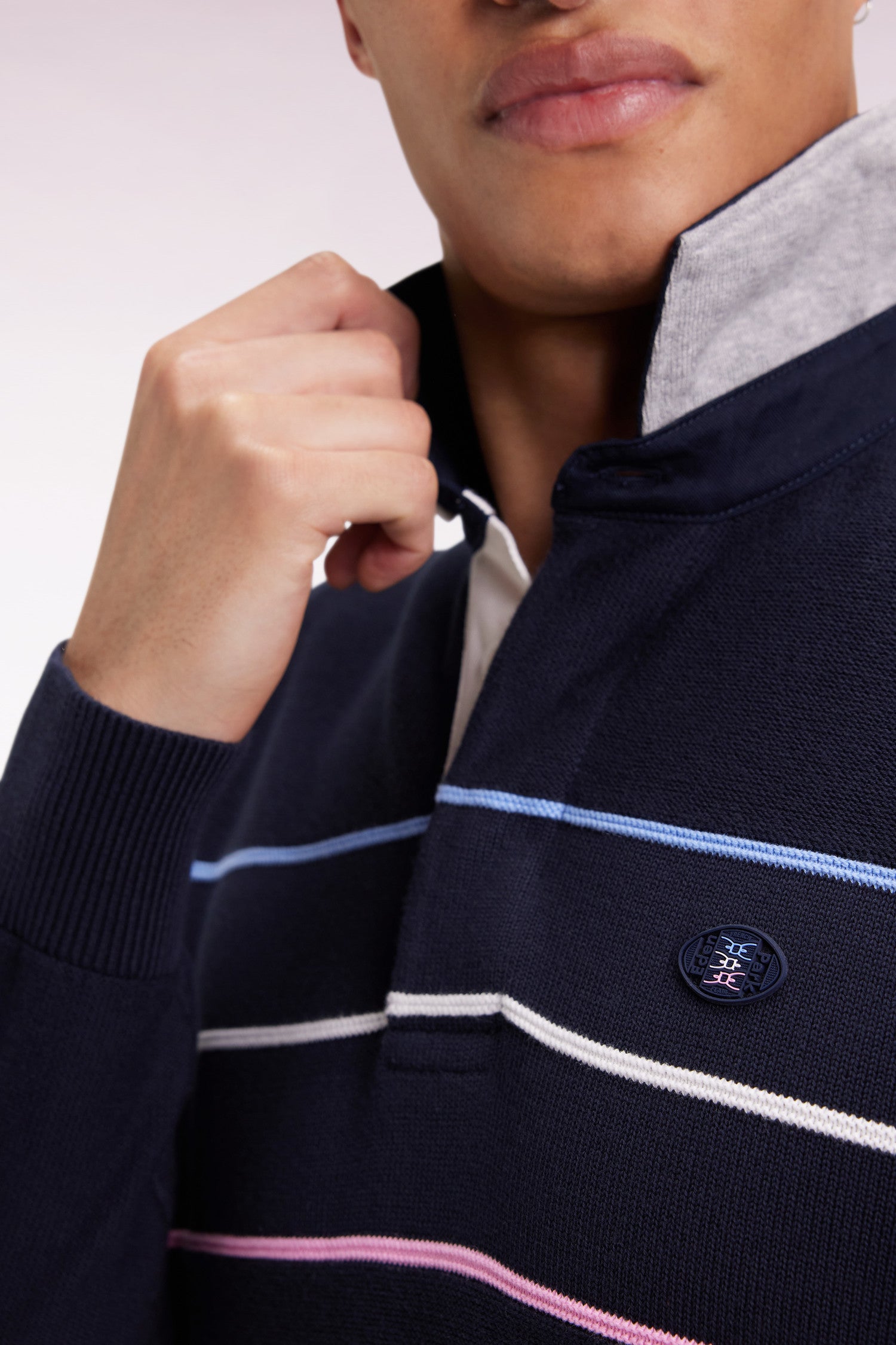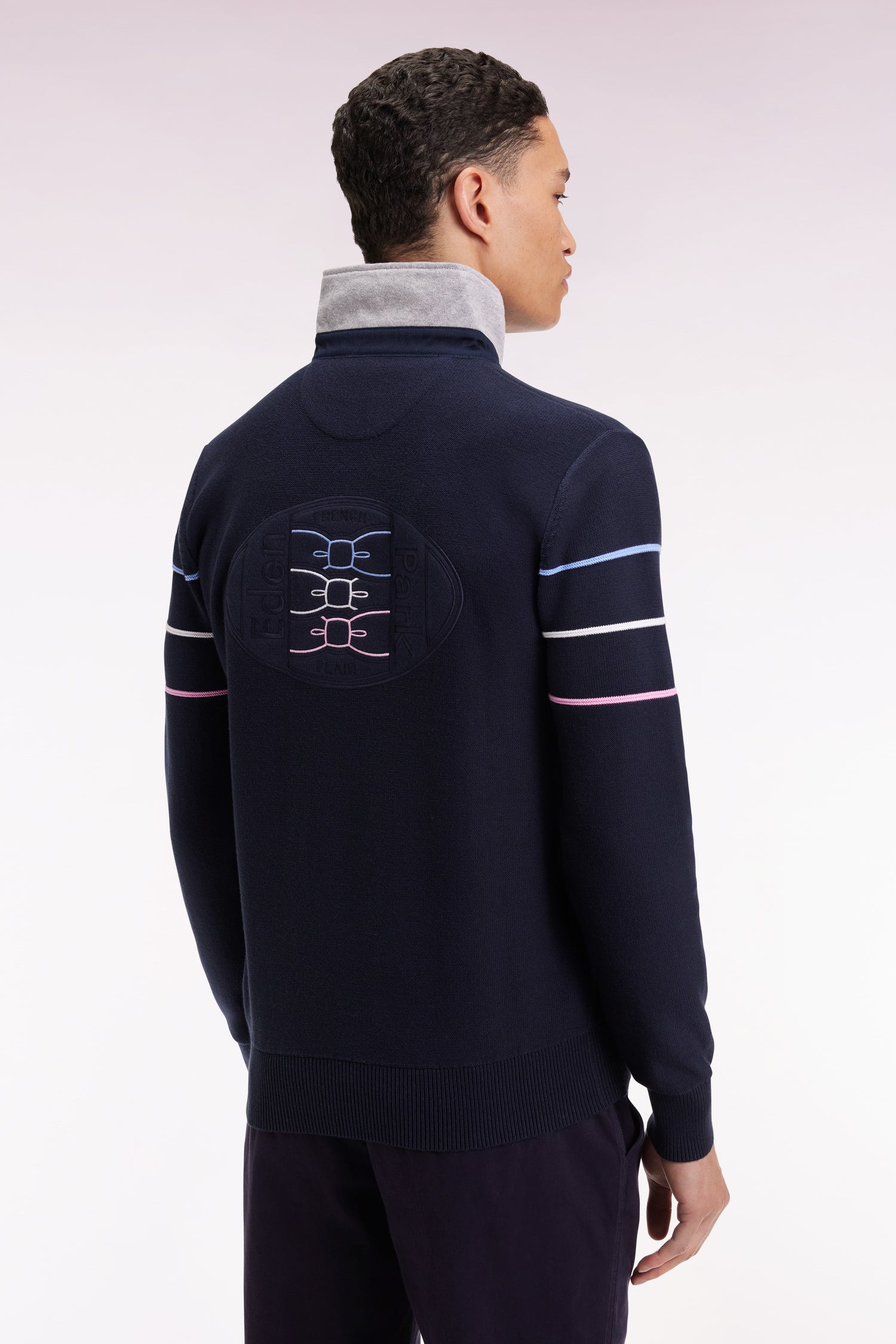Inspiré du vestiaire rugby, ce pull pour homme à col maillot réalisé en coton mise sur une construction soignée et des détails graphiques. Son dessous de col est tricoté en contraste, un détail visible porté ouvert. Son col dispose également d'une structure en twill pour un tombé impeccable. Son liseré tricolore raccordé entre la poitrine et les manches, son badge feutre et silicone sur la poitrine et sa large broderie ovale dans le dos signent cette pièce forte, à l’esprit sport-chic assumé