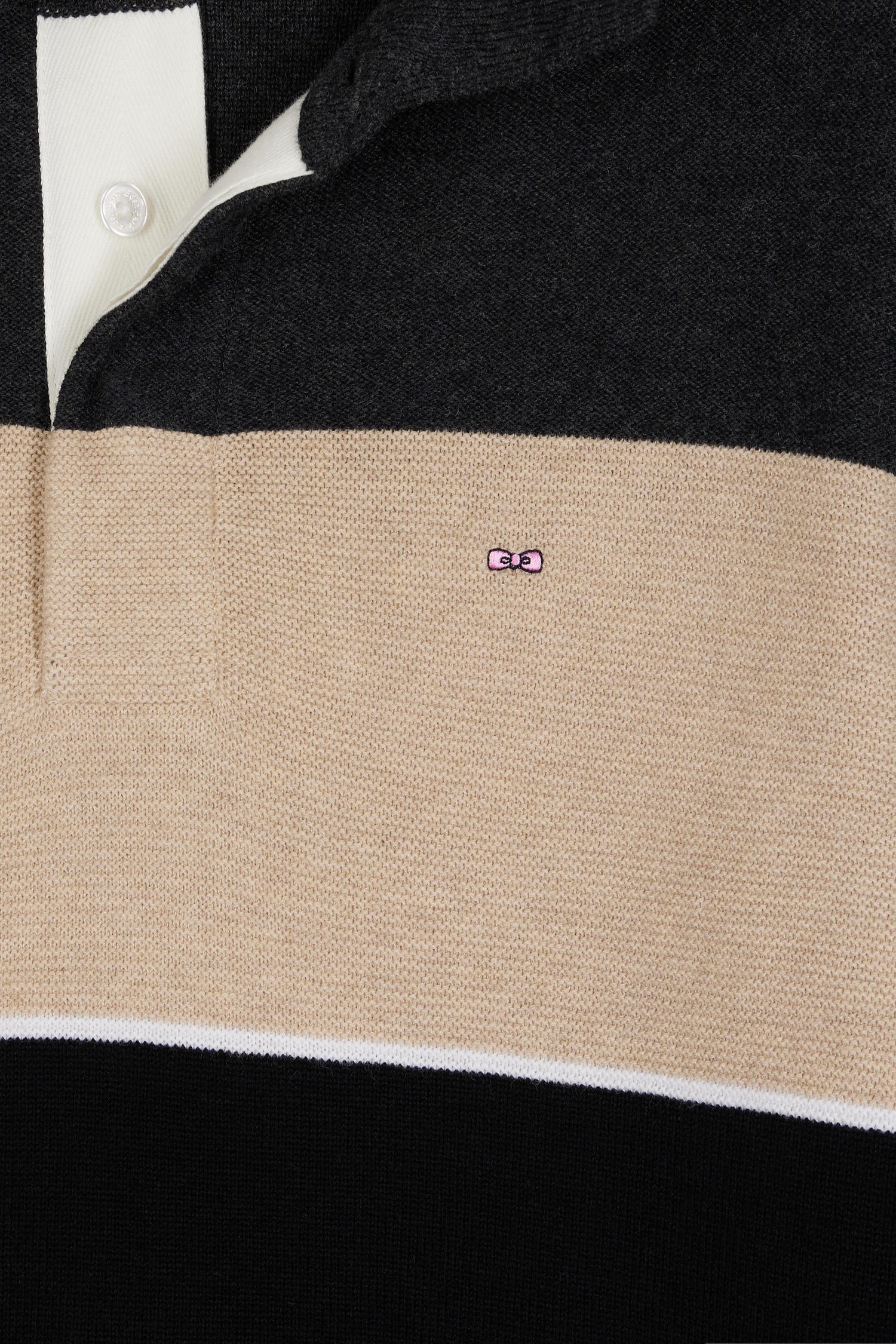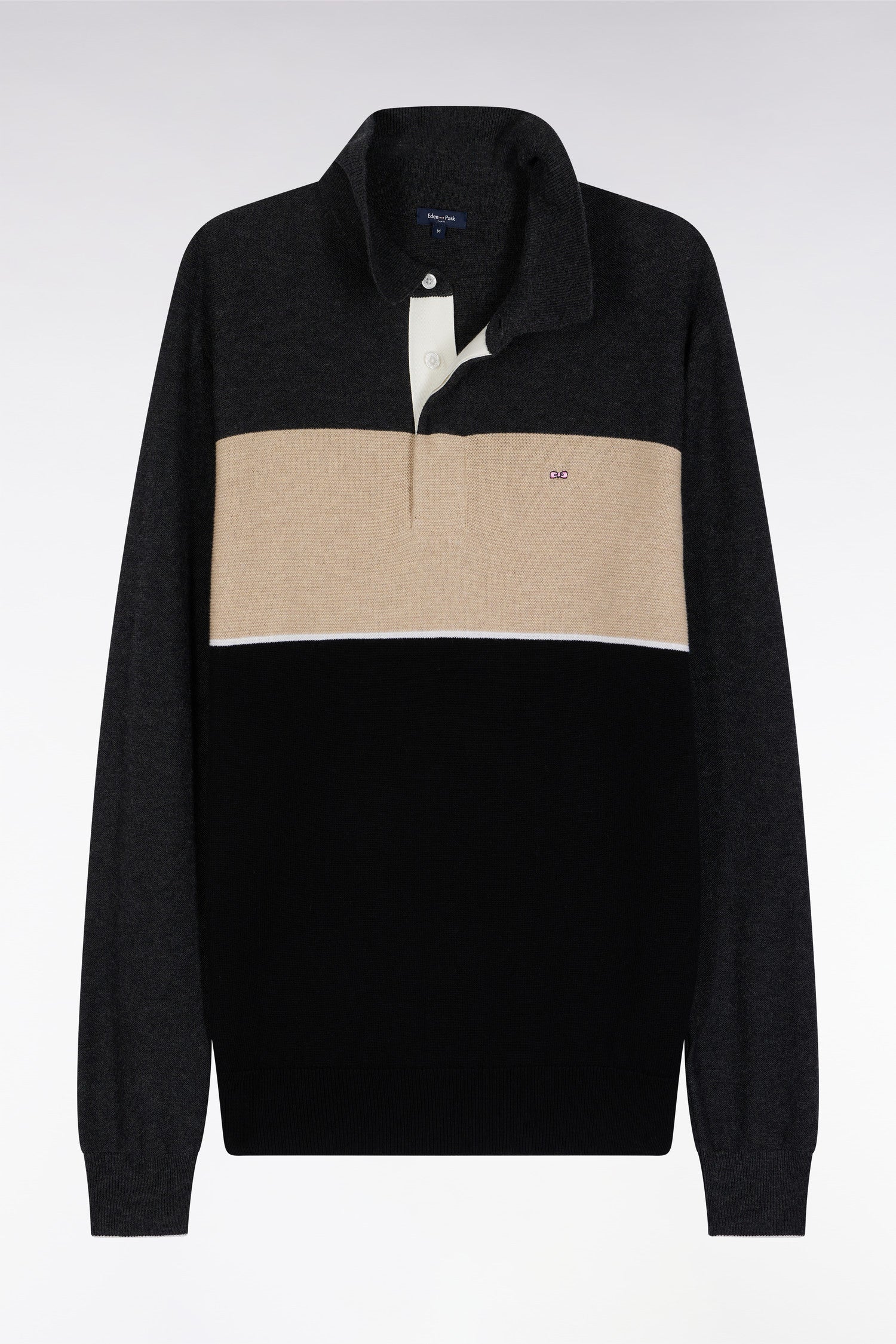 Ce pull col maillot mêle jeux de textures et finitions soignées. Disponible en deux coloris aux effets de contraste idéaux pour une allure sport-chic, il associe avec style plusieurs type de points, témoignant du savoir-faire de notre maison française dans le travail de la maille