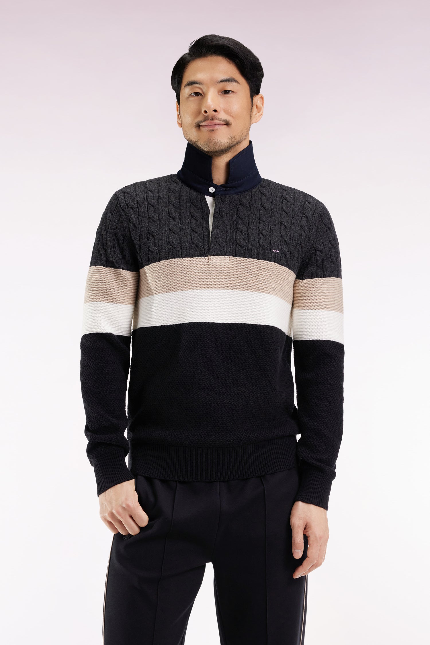 Ce pull doté d'un col maillot en twill se distingue par son travail de maille alliant torsades, point Ottoman et point piqué. Un subtil jeu de textures qui souligne le savoir-faire Eden Park et donne du relief à la silhouette masculine. Un essentiel aux couleurs soigneusement assemblées dans une palette automnale pour une allure travaillée même au cœur de l'hiver. Jean ou pantalon en velours côtelé s'y associeront parfaitement quelle que soit l'occasion