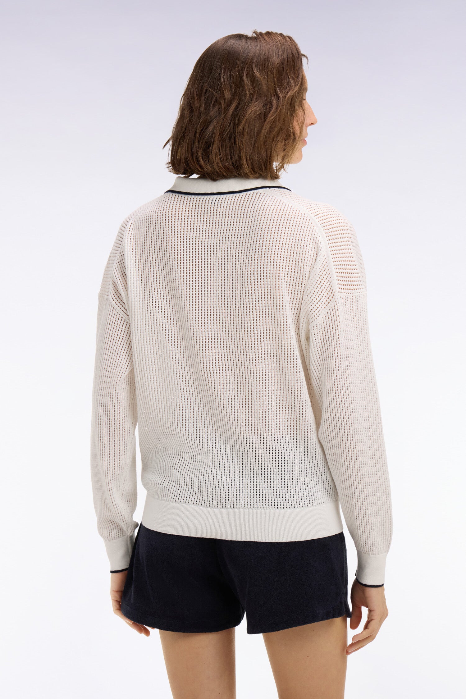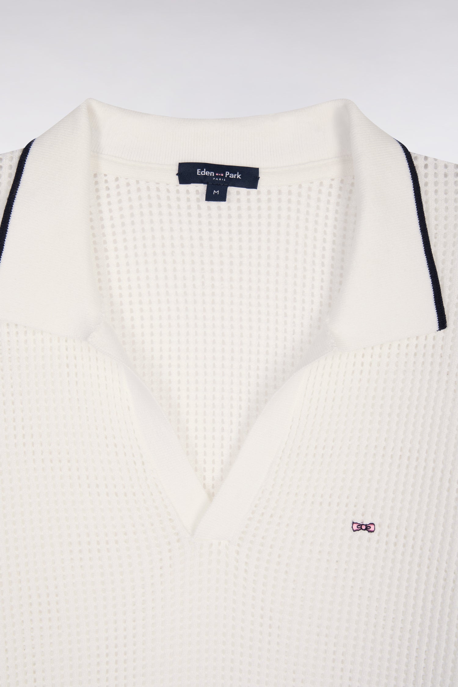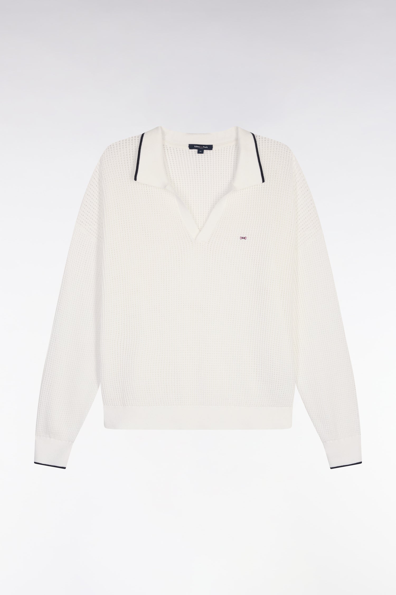 Notre pull col polo à manches longues, proposé en marine ou en blanc, se distingue par sa maille mesh légère qui apporte fraîcheur, relief et modernité. Son caractère est rehaussé par un liseré contrasté au col et aux poignets, ainsi que par le nœud papillon brodé sur la poitrine, emblème de notre Maison. À porter avec un jean clair, un pantalon large ou un short d’été pour une silhouette élégante et effortless quoi que vous réserve le moment.