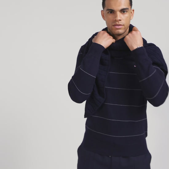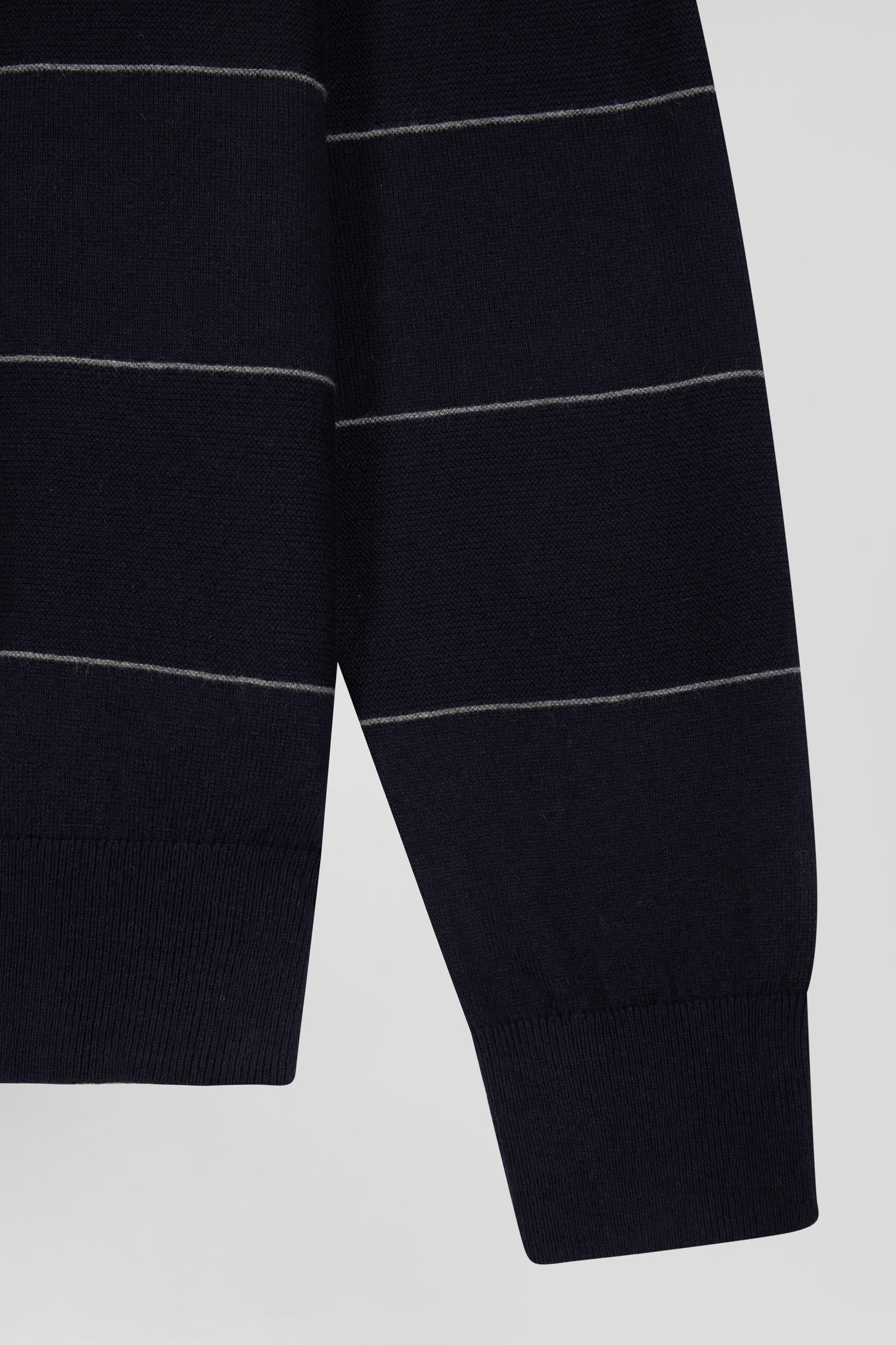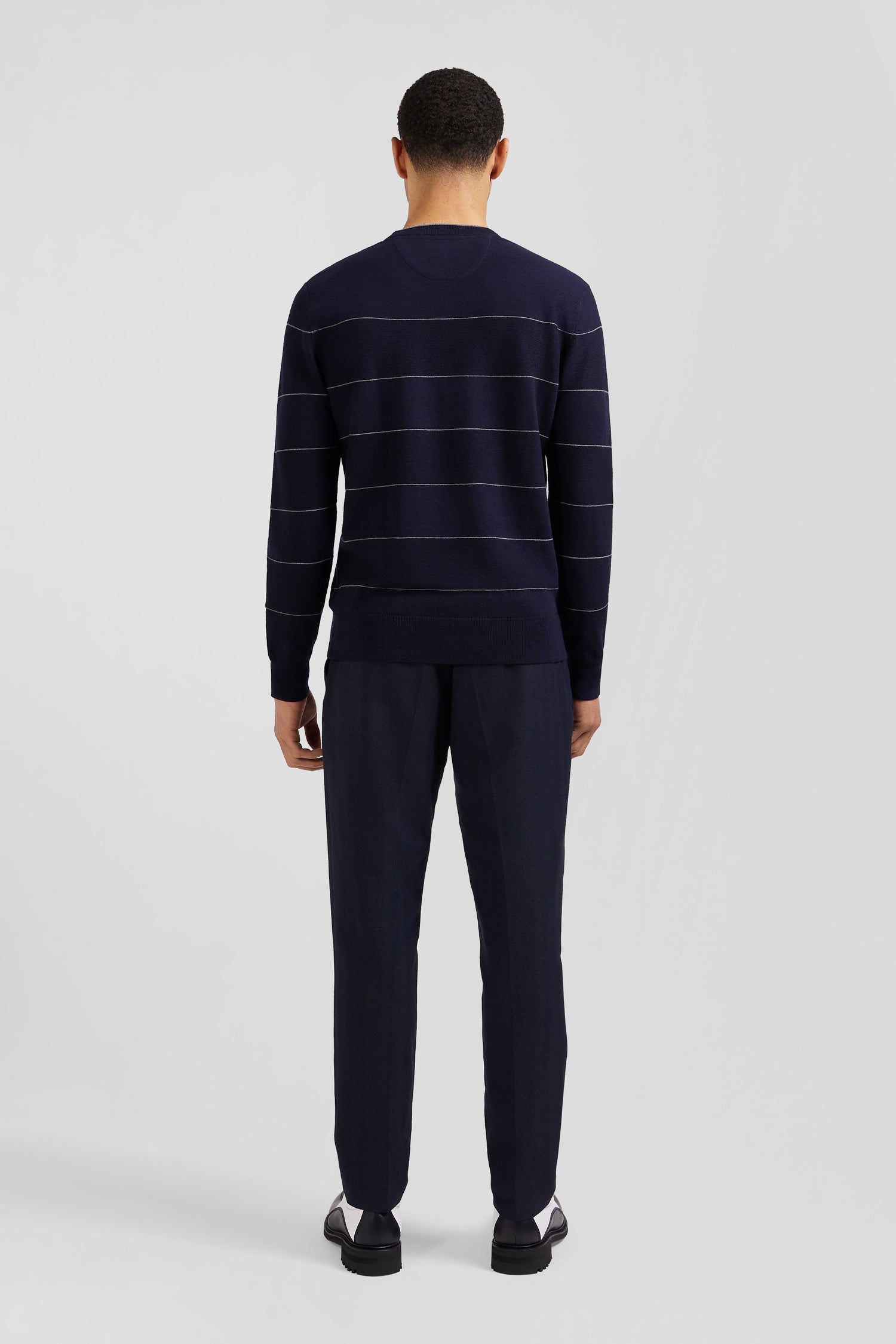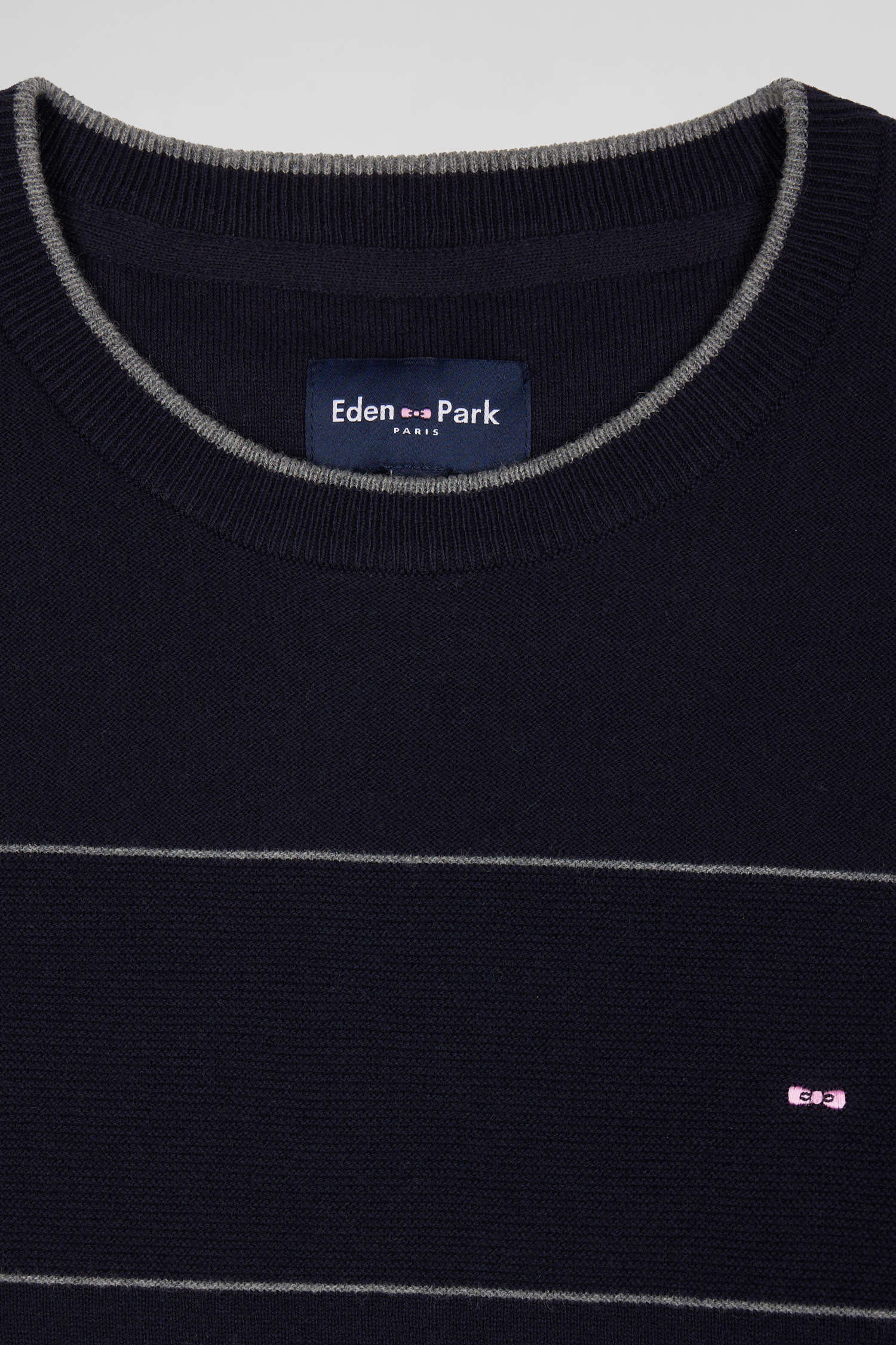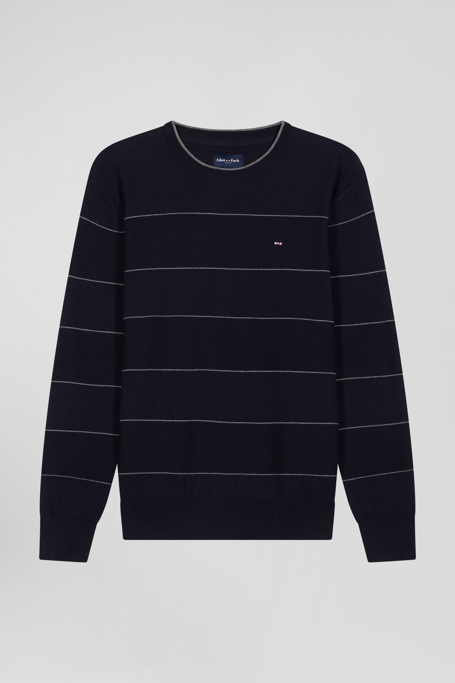 Pull col rond rayé en coton et cachemire bleu marine coupe Regular
