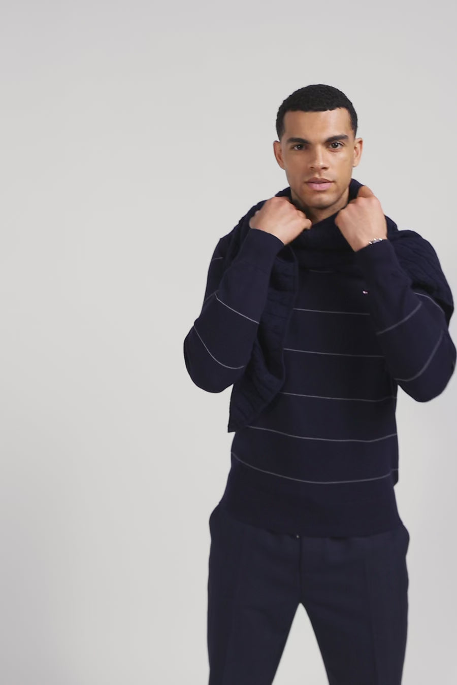 Ce pull col rond, disponible en nuances de marine, gris ou marron, se distingue par un fin liseré contrasté élégant au col. Son design unique est caractérisé par un tricotage alterné de points et de jersey, créant un effet de rayures dynamiques, chaque rayure étant délimitée par un fin liseré contrasté.