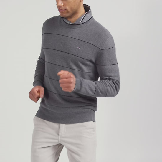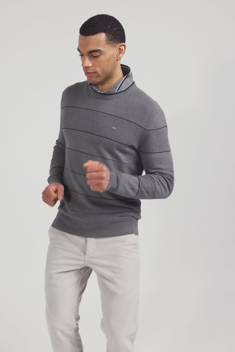 Ce pull col rond, disponible en nuances de marine, gris ou marron, se distingue par un fin liseré contrasté élégant au col. Son design unique est caractérisé par un tricotage alterné de points et de jersey, créant un effet de rayures dynamiques, chaque rayure étant délimitée par un fin liseré contrasté.