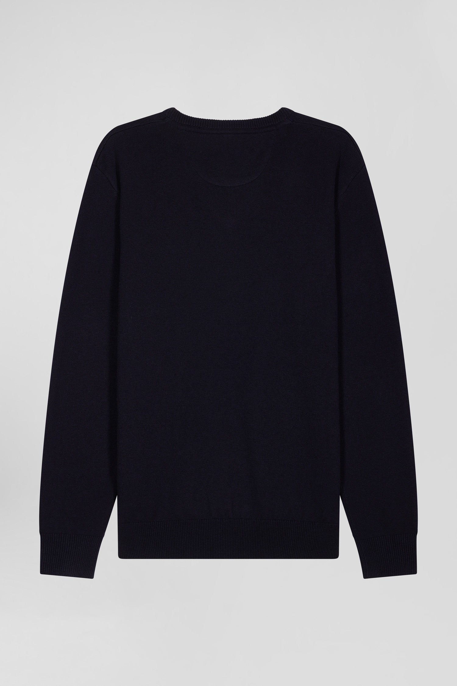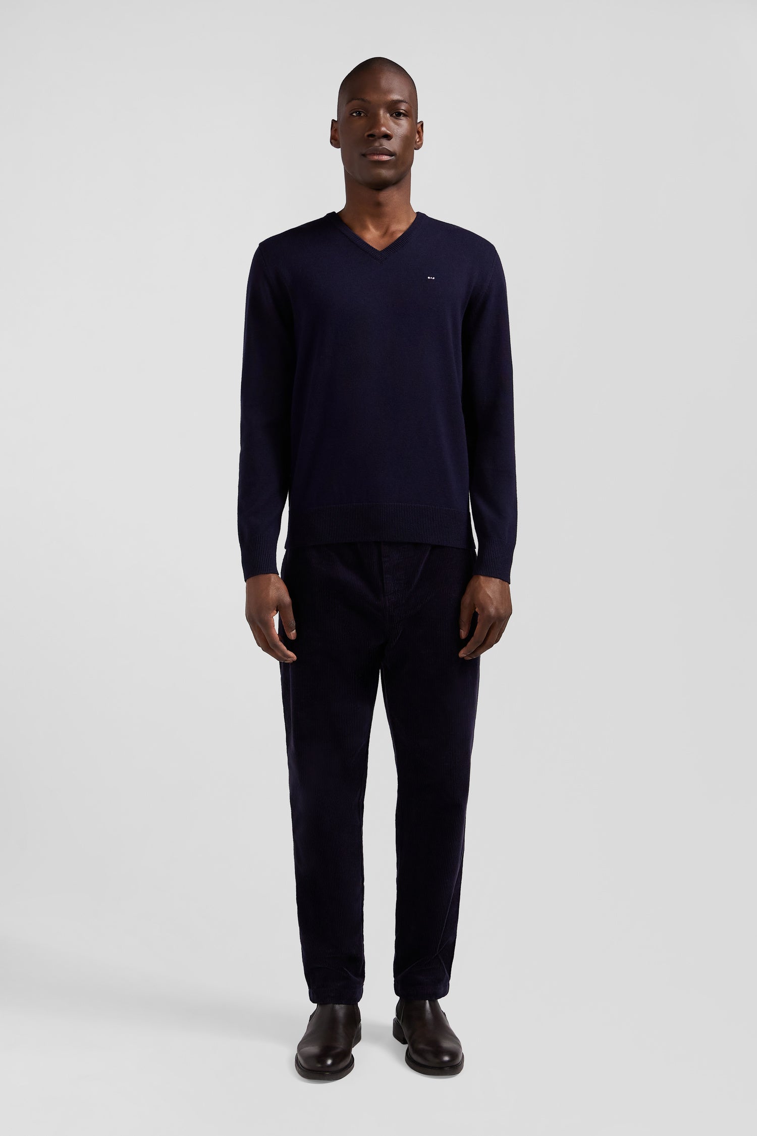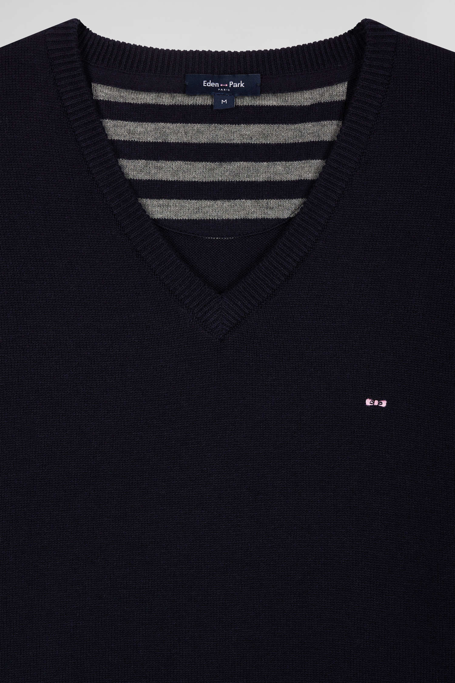 Pull col V en laine et coton bleu marine demi-lune cerclée coupe Regular