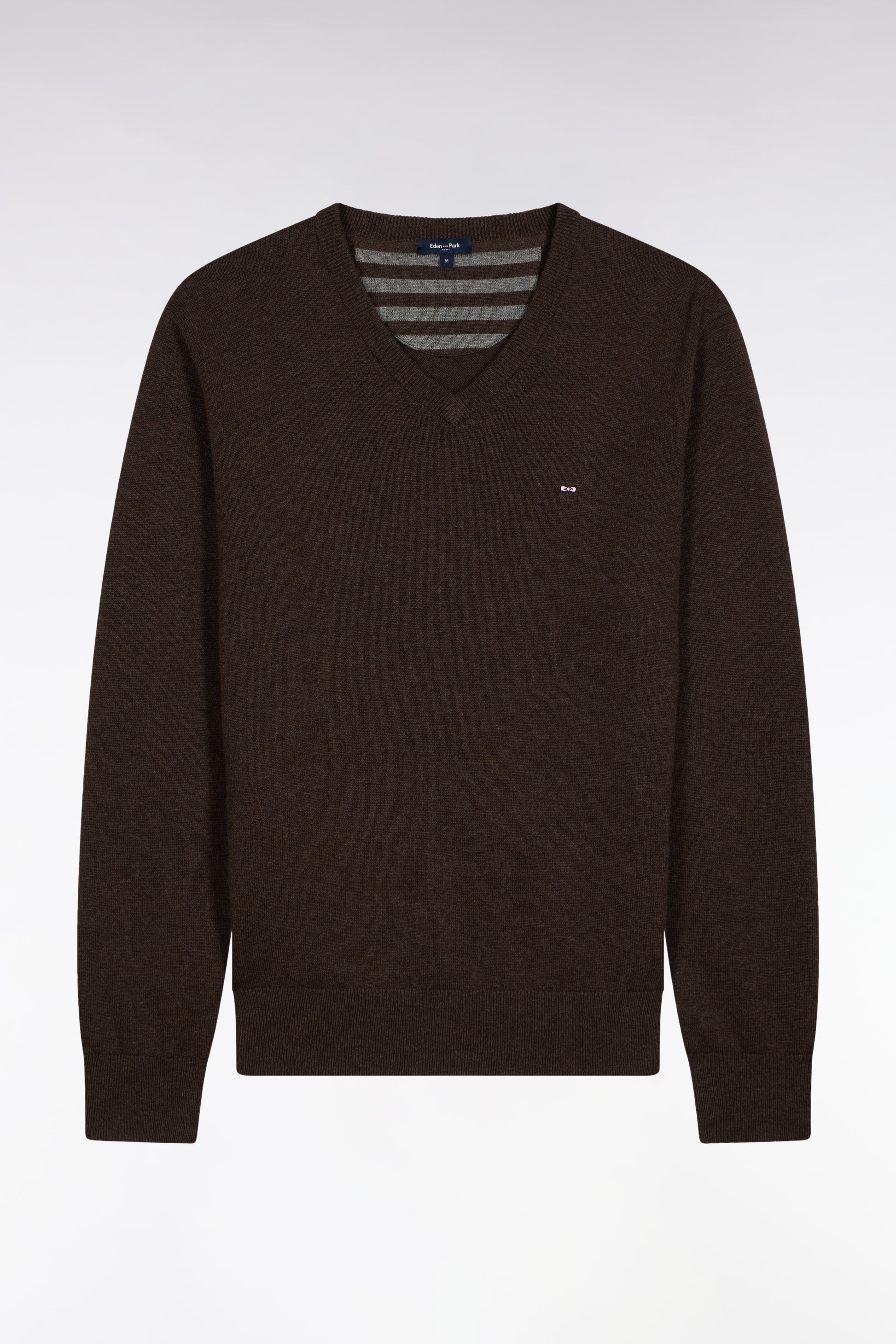 Cet élégant pull col V en laine et coton mélangés reprend la coupe droite confortable et polyvalente de notre pull classique décliné dans plusieurs propositions se distinguant par leur encolure. Ce modèle se pare de notre emblématique broderie nœud papillon sur la poitrine et d'une demi-lune intérieure à rayures rugby. Parfait pour dynamiser une silhouette avec une touche de couleur maîtrisée grâce au large choix de coloris proposés ici
