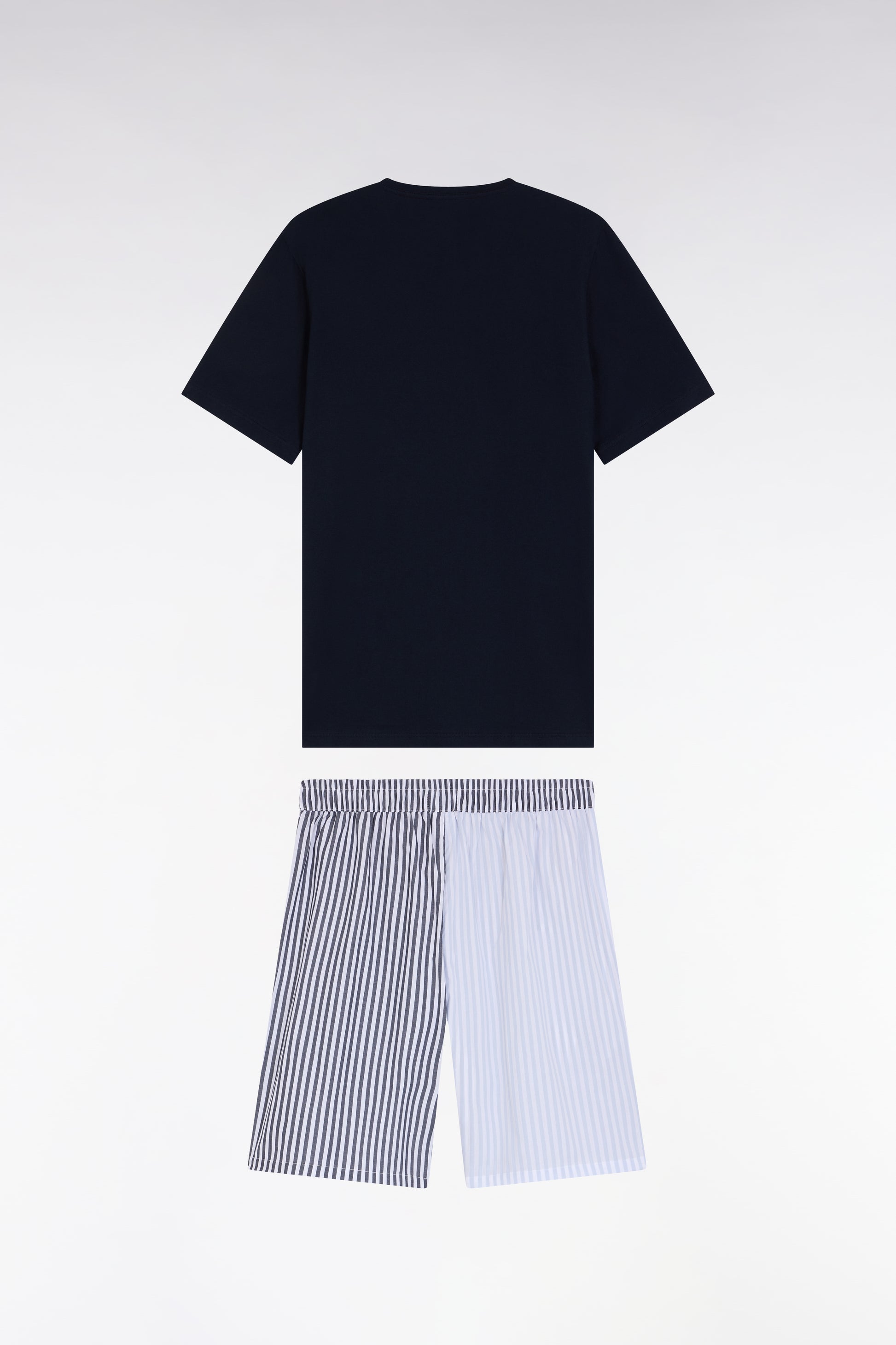 Ce pyjama court se compose d'un t-shirt à manches courtes marine au col rond et d'un short en coton à la taille élastiquée rehaussé de rayures. Ce pyjama masculin offre un confort optimal et une allure sport-chic à vos moments de relaxation. Proposé dans une déclinaison marine et ciel ou marine et rose, nos couleurs signature