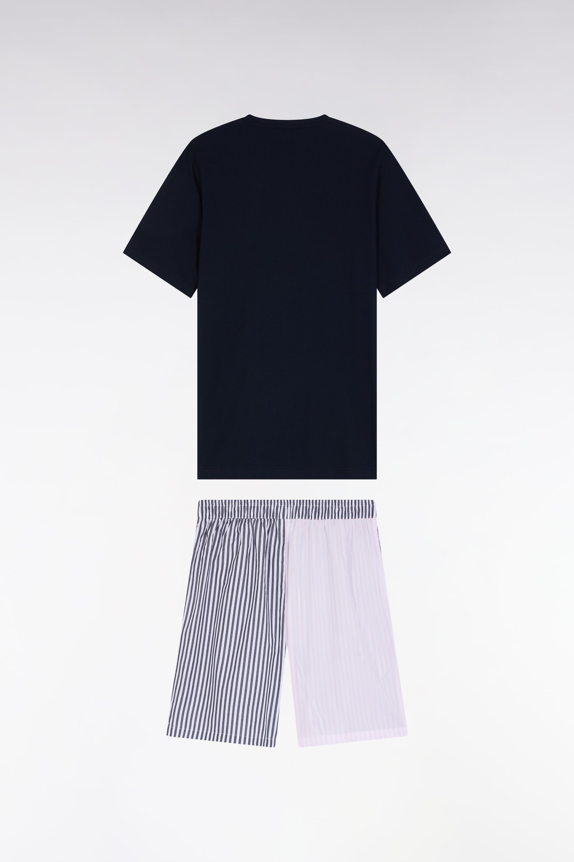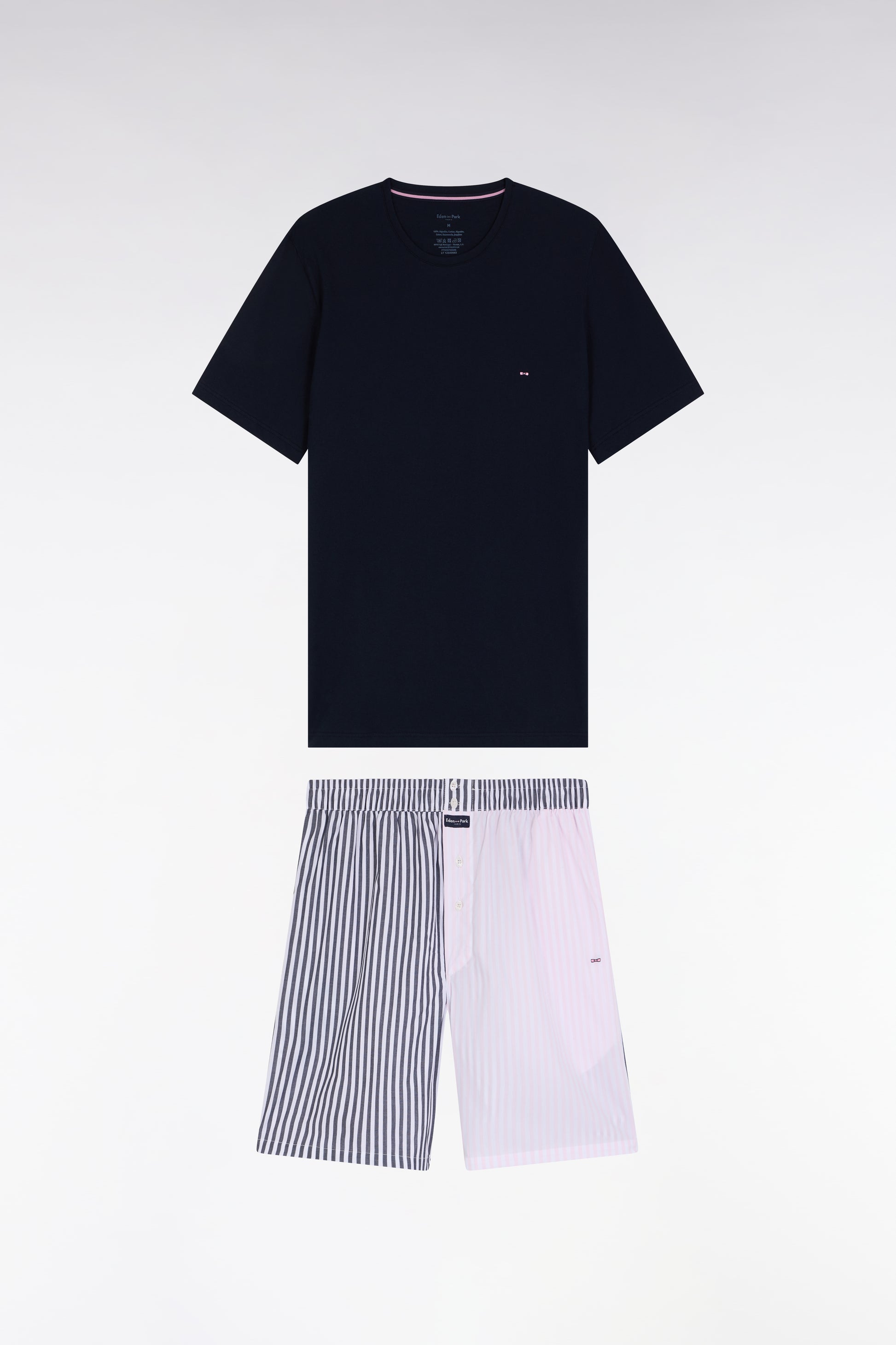 Ce pyjama court se compose d'un t-shirt à manches courtes marine au col rond et d'un short en coton à la taille élastiquée rehaussé de rayures. Ce pyjama masculin offre un confort optimal et une allure sport-chic à vos moments de relaxation. Proposé dans une déclinaison marine et ciel ou marine et rose, nos couleurs signature