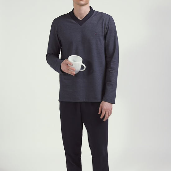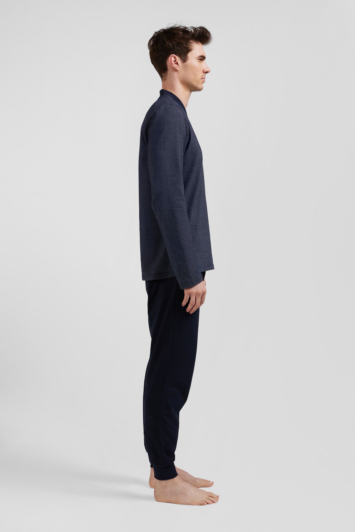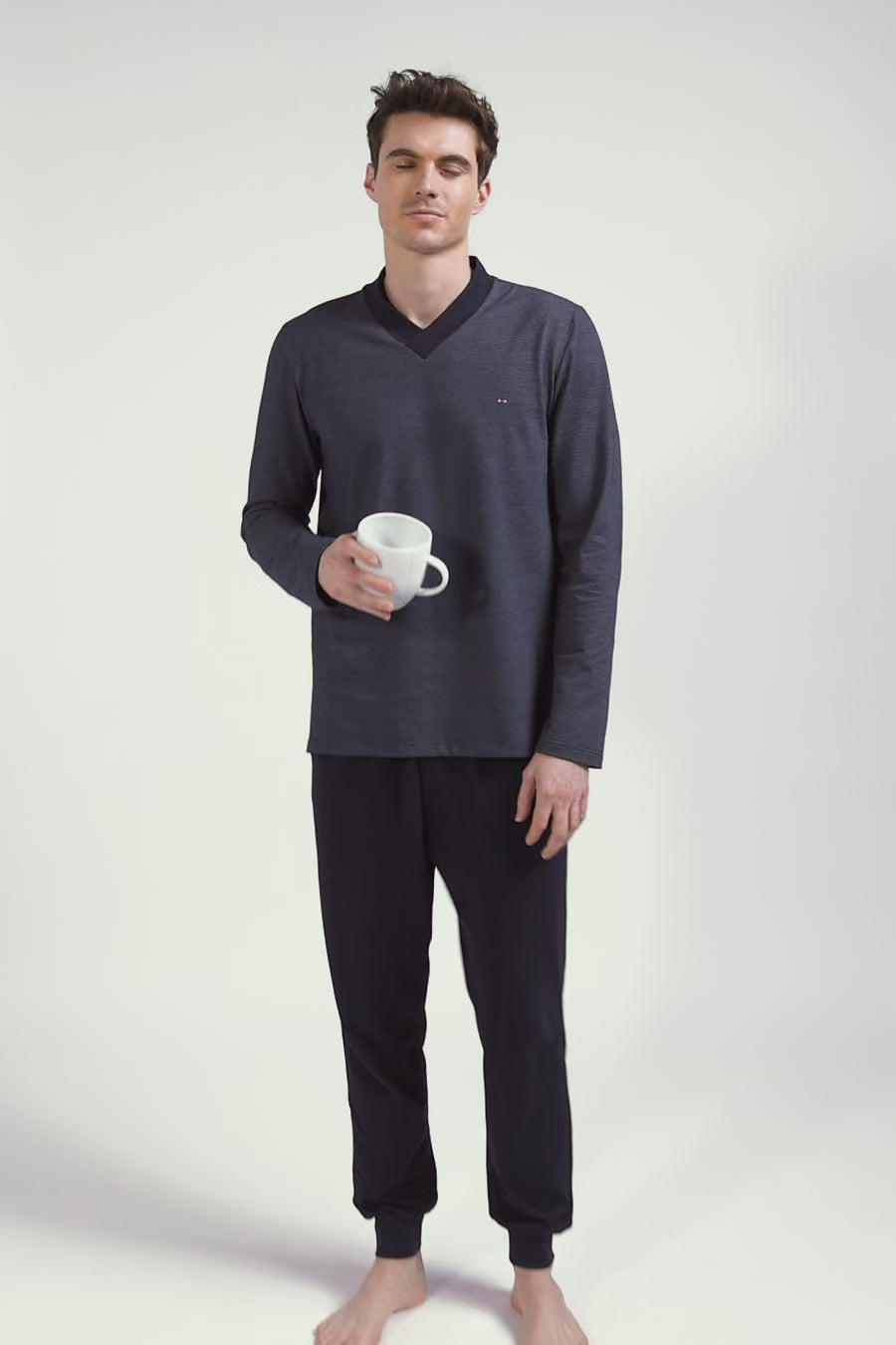 Optez pour notre ensemble pyjama pour homme, combinant un T-shirt manches longues bleu à col V contrasté marine à un caleçon marine à chevilles resserrées. Confectionné en jersey de coton mélangé, cet ensemble de nuit assure confort et style pour vos nuits comme pour vos moments de détente à la maison le week-end ou le soir venus.