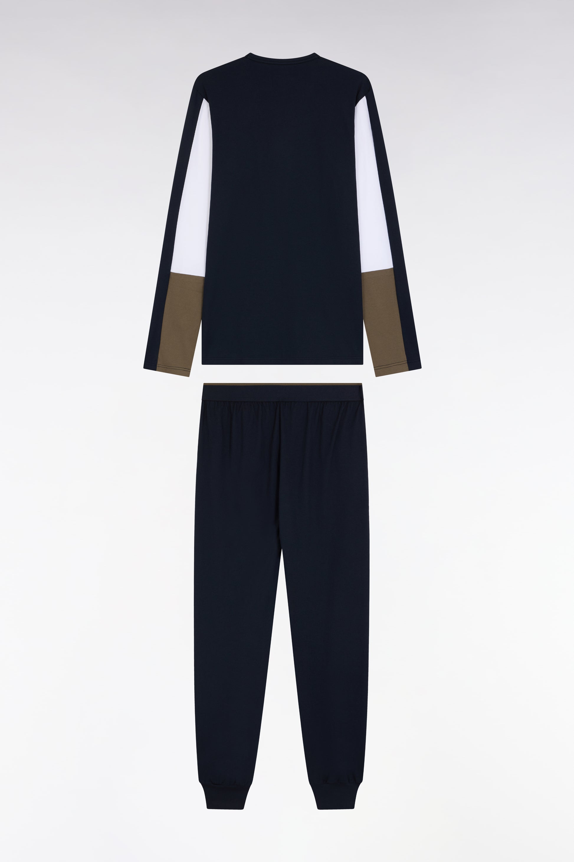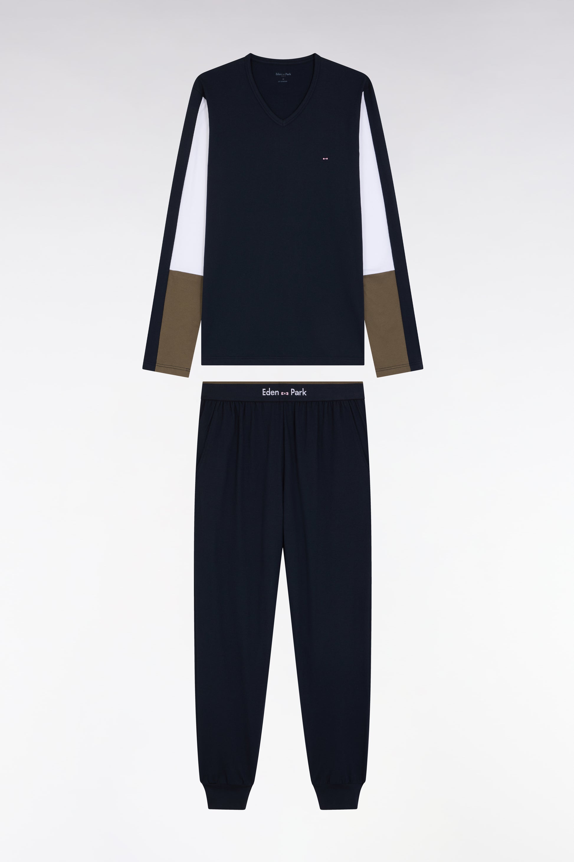 Ce pyjama long mise sur un style graphique avec son t-shirt à col V animé de manches à découpes colorblock dans le pur style des collections sport-chic de notre maison. Son design tricolore s’associe à un pantalon uni resserré aux chevilles, doté d’une taille à bande élastiquée au logo d'Eden Park. Une silhouette moderne et confortable, idéale pour des soirées et week-ends de détente sans compromis sur le style