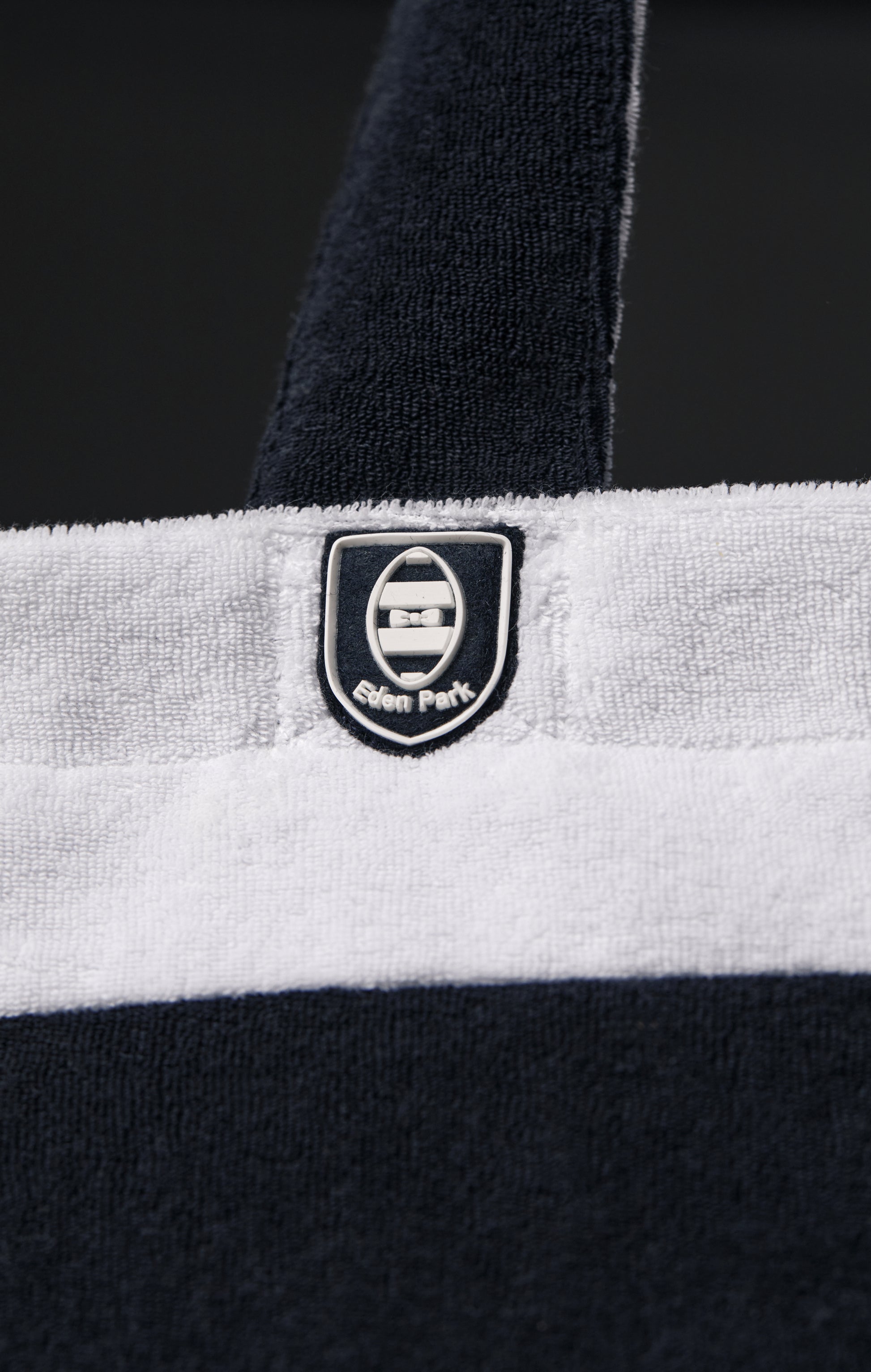 Ce tote bag exclusif a été intégralement imaginé et confectionné à partir de pièces emblématiques de notre Maison sélectionnées dans nos archives féminines. Deux maillots femme en éponge, l’un bleu marine et l’autre blanc, ont été découpés à la main puis assemblés pour former de larges rayures, clin d’œil à l’esthétique graphique de nos collections de mode. Pour la doublure, notre atelier a choisi une chute de tissu rayé issue elle aussi du stock dormant Eden Park, à laquelle s’ajoute une poche intérieure zippée, dont le zip provient d’une pièce historique. Chaque détail de ce cabas pratique et léger, comme son discret blason upcyclé apposé près de ses anses, illustre notre engagement à réemployer les ressources existantes pour donner naissance à un accessoire unique, à la fois fonctionnel, durable et original. Ce sac en éponge à rayures marine et blanche est disponible en un seul exemplaire dans la capsule Pap'Atelier proposée sur notre site internet pour une durée limitée. Dimensions : 35cm x 39cm