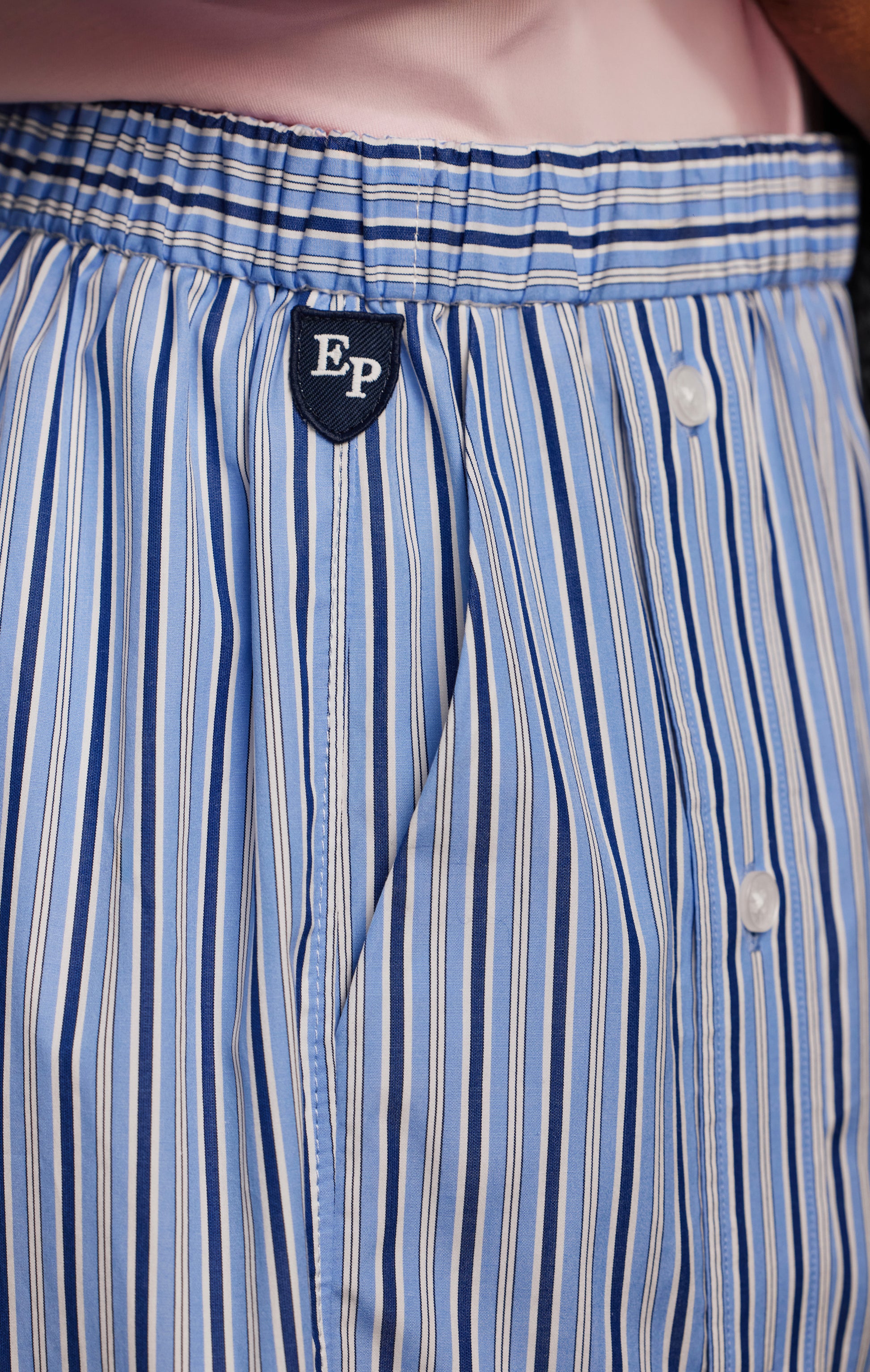 Ce petit short d'été en popeline de coton rayée provient d'une chemise masculine de nos anciennes collections entièrement revalorisée par notre cheffe d'atelier. La patte de boutonnage d'origine et ses élégants boutons rugby siglés ont été conservés et placés sur le côté, conférant à ce short une note d'originalité raffinée. Grâce à sa taille élastiquée, ce short en coton taille M s'adapte à différentes morphologies. Un petit écusson Eden Park, lui aussi recyclé, est soigneusement brodé près des poches latérales. Avec cette pièce au chic décontracté inimitable proposée en un unique exemplaire, notre Maison témoigne de son engagement pour le style et une mode plus responsable. Confectionnée à Paris de manière artisanale, la collection capsule Pap'Atelier est disponible en exclusivité sur notre site internet pour une durée limitée.