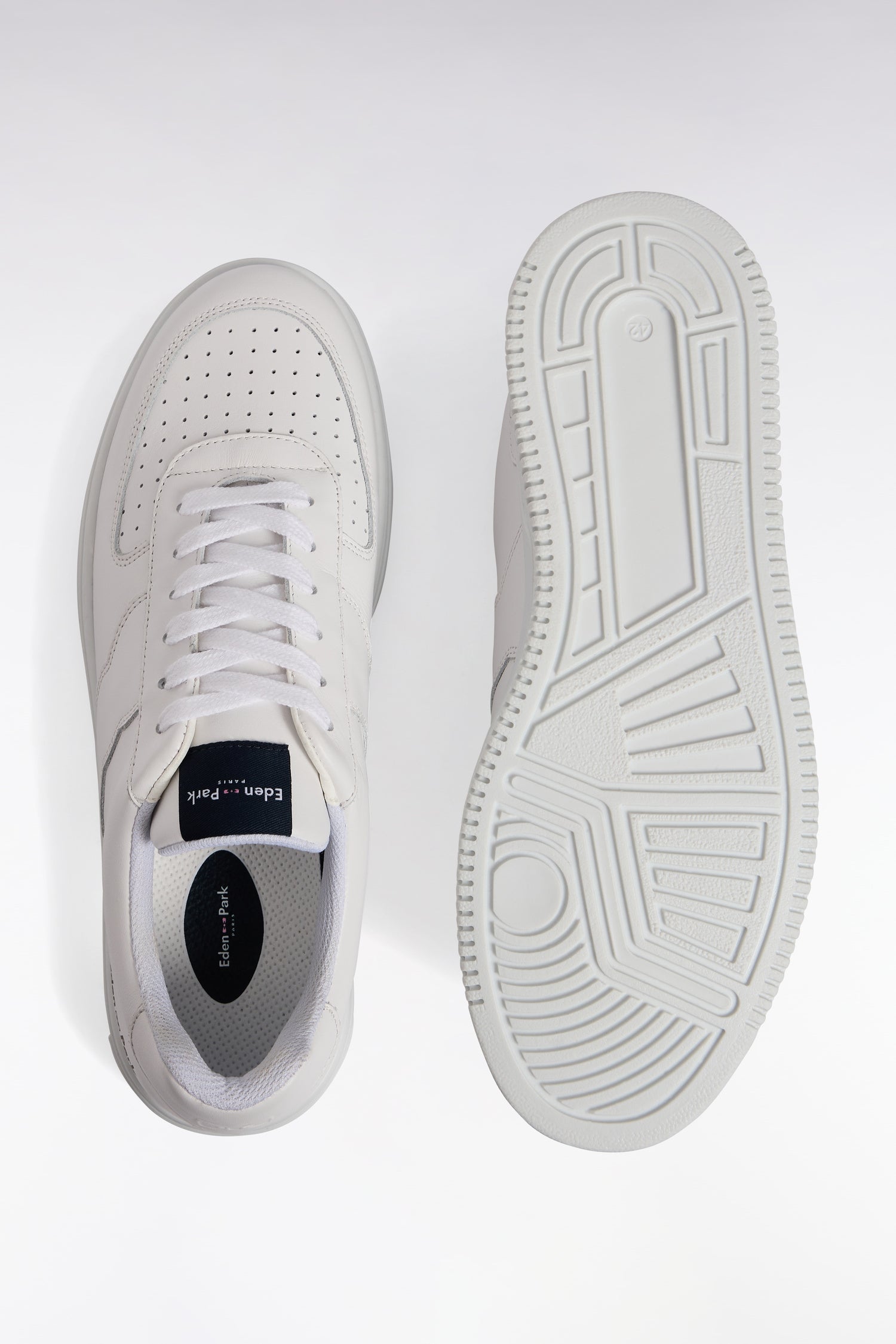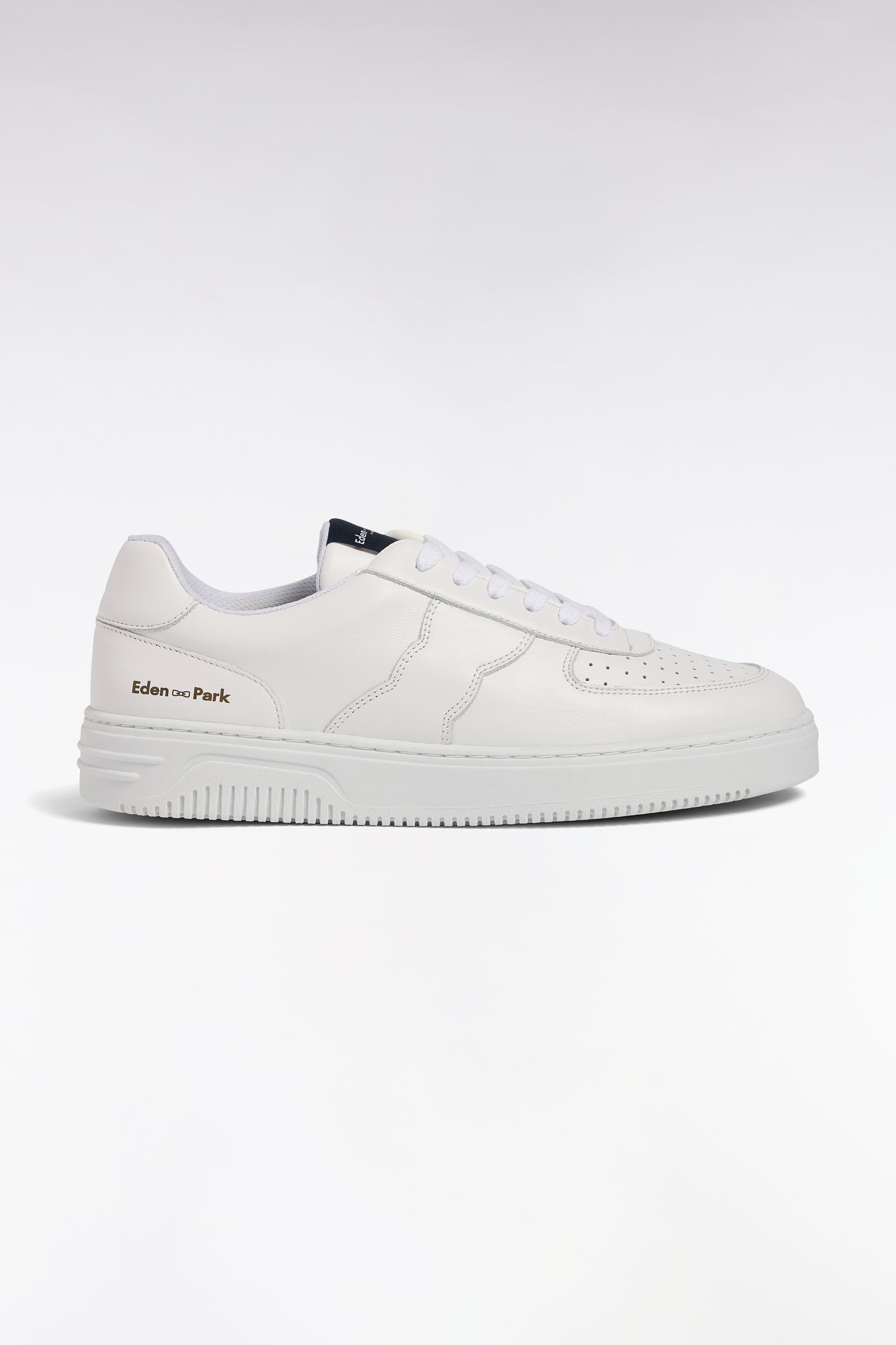 Intégralement confectionnées en cuir blanc pour un style sobre et moderne, ces baskets basses se distinguent par leurs finitions discrètes mais soignées. La languette marine siglée et l’embossage nœud papillon à l’arrière ajoutent une signature élégante, tandis que la semelle intérieure camel perforée garantit un confort optimal au quotidien et une respirabilité performante