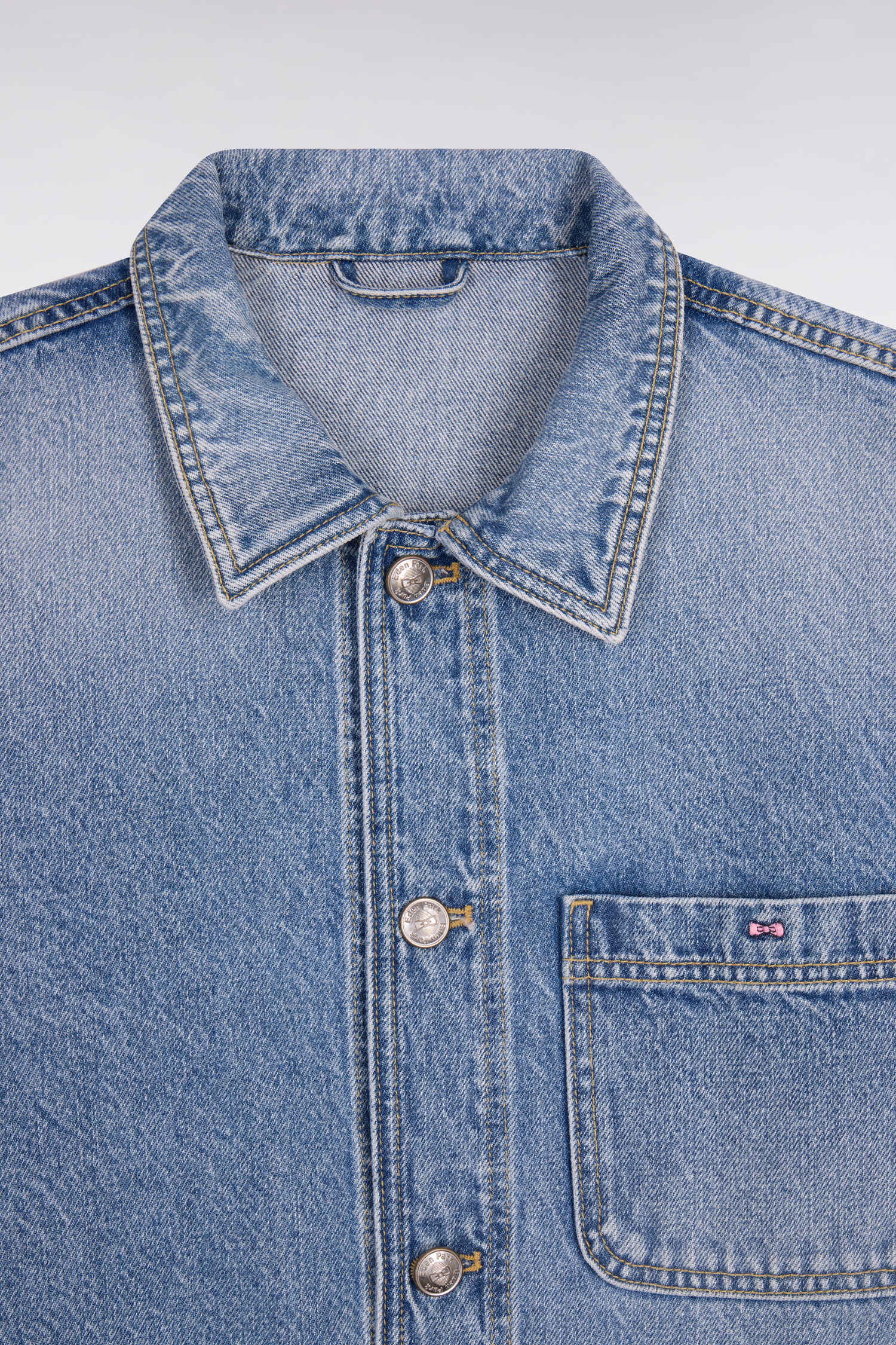 Inspirée du vestiaire workwear, la surchemise en denim fait partie des piliers du vestiaire masculin que l'on prend plaisir à retrouver. Ce modèle façonné en denim bleu délavé non doublé arbore trois poches plaquées accentuant sa silhouette utilitaire. Poignets et pattes de boutonnage sont accessoirisés de boutons en métal siglés tandis que notre emblématique broderie nœud papillon rose s'appose discrètement sur sa poche poitrine. Un essentiel masculin à porter en veste de mi saison ou sous un blouson. Pour compléter votre tenue, plusieurs jeans aux coupes flatteuses sont proposés dans la même toile denim au délavage coordonné à cette surchemise en jean.