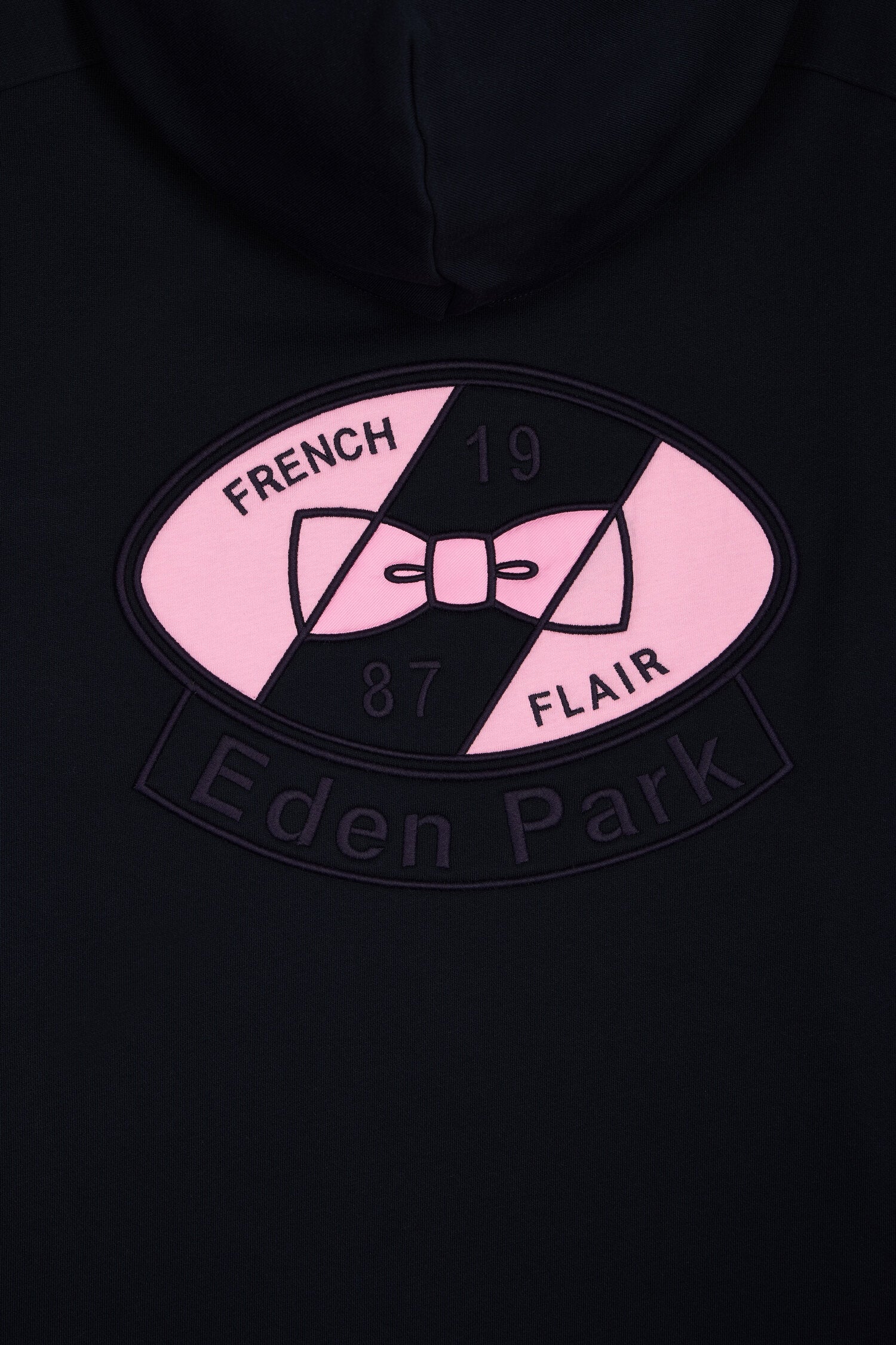 Pensé pour le quotidien, ce sweatshirt homme à capuche, d'ailleurs doublé de notre rose signature, combine confort et style. En molleton de coton souple, il présente notre broderie emblématique sur la poitrine et une broderie dos qui rappelle l’héritage rugby de la Maison. Une pièce urbaine et moderne, facile à associer au jogging coordonné dans sa teinte marine aux découpes roses et blanches. I Capuche doublée bicolore