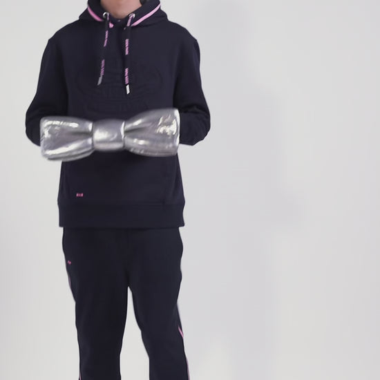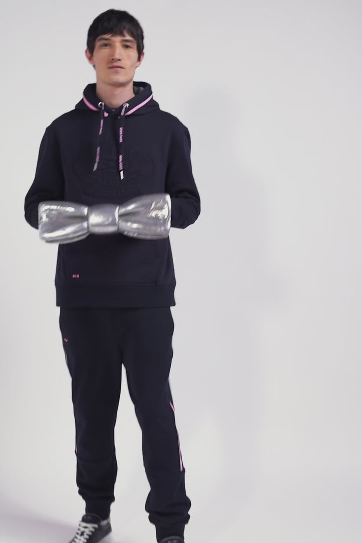 Invitez la douceur et le style dans votre vestiaire automne-hiver avec ce sweatshirt à capuche en molleton gratté. Il arbore une broderie matelassée à l’avant et une poche kangourou pratique. Un ruban tricoté marine et rose souligne élégamment sa capuche, tandis que les cordons siglés aux finitions métalliques ajoutent une touche de distinction. Les bandes de propreté tricolores reflètent un savoir-faire attentionné, pour un confort haut de gamme et une allure sportive-chic.