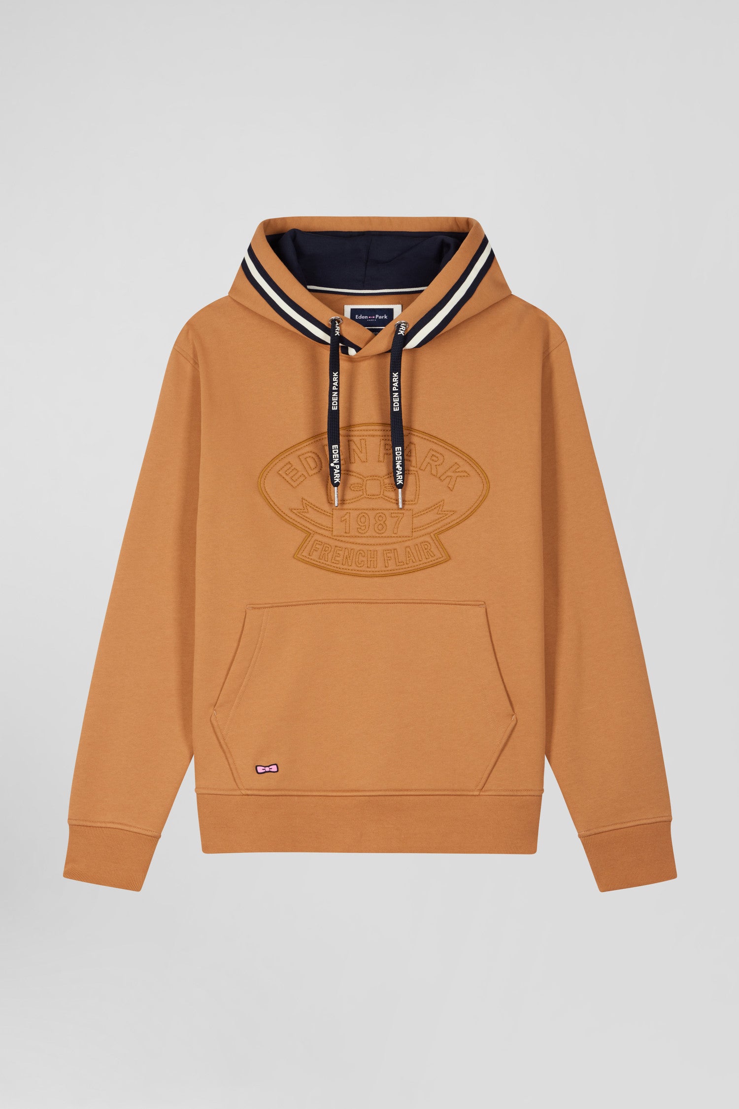 Invitez la douceur et le style dans votre vestiaire automne-hiver avec ce sweatshirt à capuche en molleton gratté. Il arbore une broderie matelassée à l’avant et une poche kangourou pratique. Un ruban tricoté marine et rose souligne élégamment sa capuche, tandis que les cordons siglés aux finitions métalliques ajoutent une touche de distinction. Les bandes de propreté tricolores reflètent un savoir-faire attentionné, pour un confort haut de gamme et une allure sportive-chic.