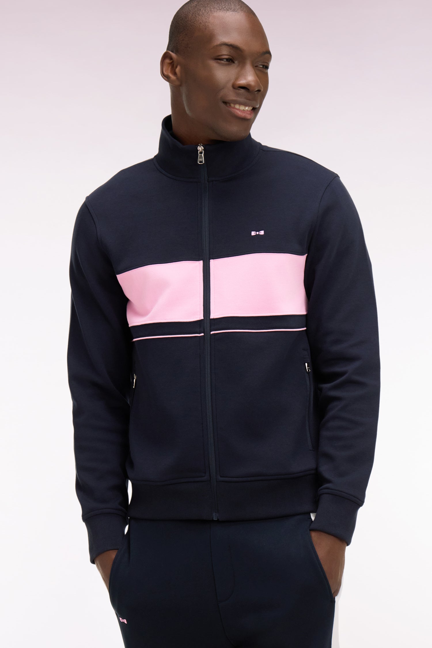 Sport chic par essence, ce sweatshirt zippé s’impose par sa large bande rose soulignée d'un passepoil assorti qui évoquent les codes de notre Maison. Confortable et polyvalent, ce sweatshirt se porte est réalisé dans un molleton doux dans une coupe droite facilitant vos jeux de superposition.