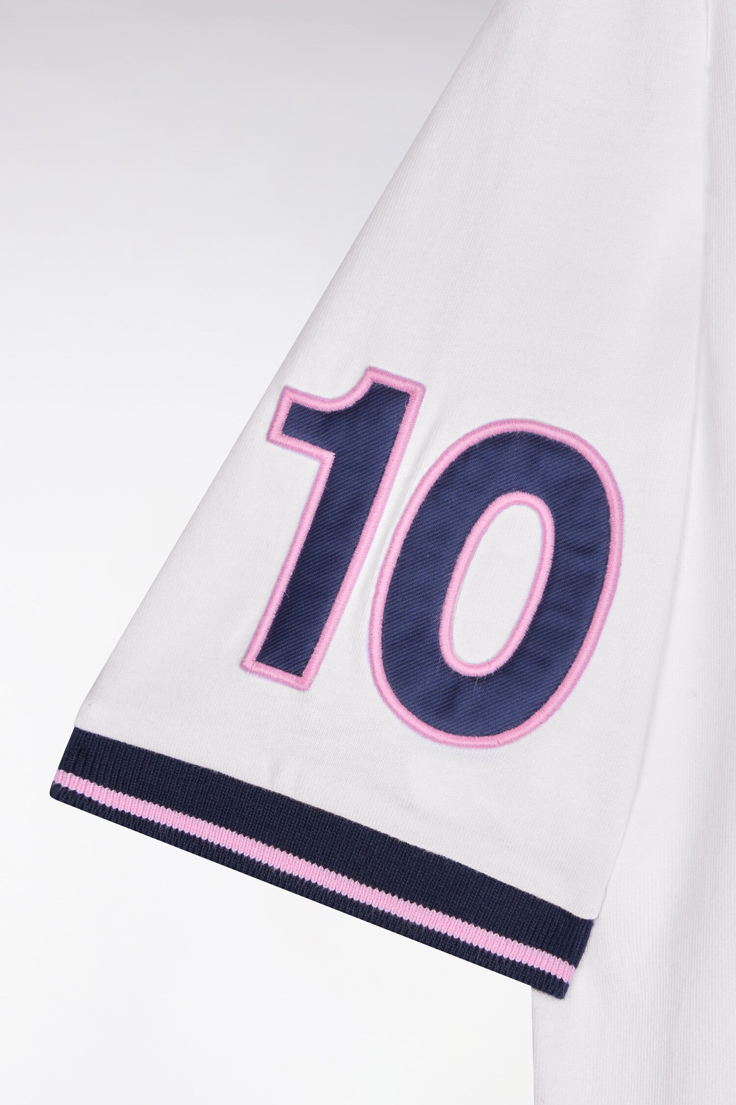 Ce T-shirt homme en jersey de coton revisite un essentiel du vestiaire masculin avec une approche graphique et des codes rugby subtils. Sa coupe droite confortable et ses finitions soignées, broderie 10 hommage au maillot de notre fondateur et bords-côtes rayés, en font une pièce facile à porter au quotidien, idéale pour composer une tenue sport chic décontractée.