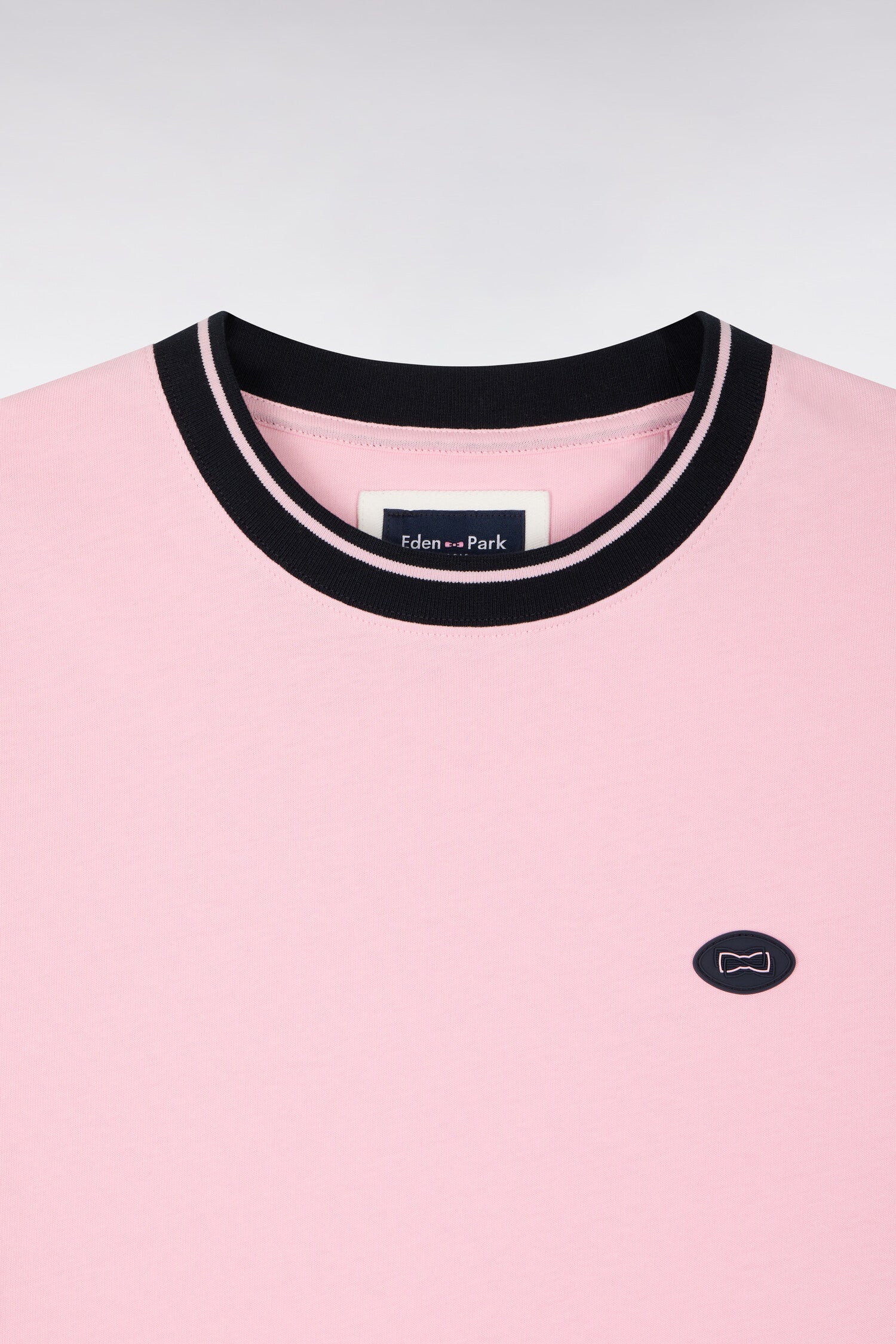 Ce T-shirt en jersey coton adopte une coupe regular droite confortable et se décline en noir ou en rose pour s’adapter à votre style. Le badge poitrine personnalisé d'un nœud papillon signe l’identité de la Maison, tandis que le col et les bas de manches en bords-côtes rayés apportent une touche graphique. Le jacquard EDEN PARK sur la manche droite parachève ce modèle sport chic facile à associer.