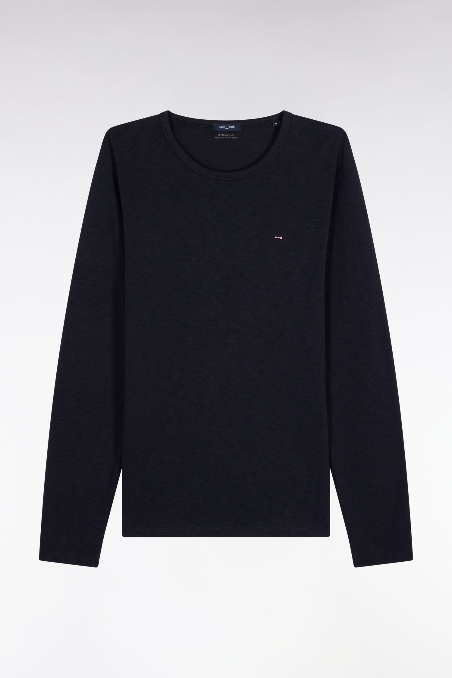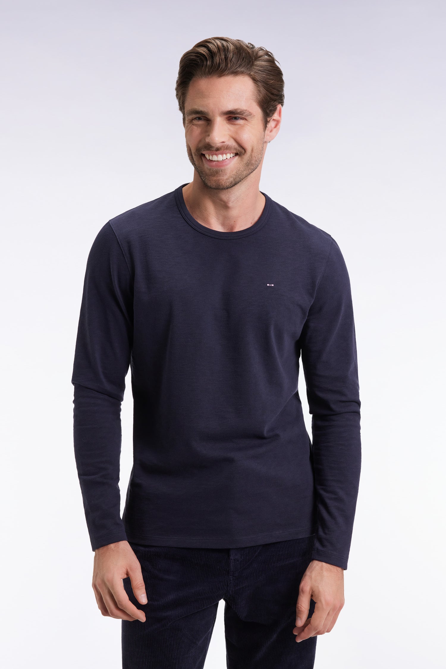 Ce T-shirt à manches longues est confectionné dans un jersey de coton slub pour un effet texturé naturel décliné dans une large palette de coloris. L’encolure en bords-côtes lui apporte tenue et confort. Un basique du vestiaire de tous les jours, à porter seul ou en superposition