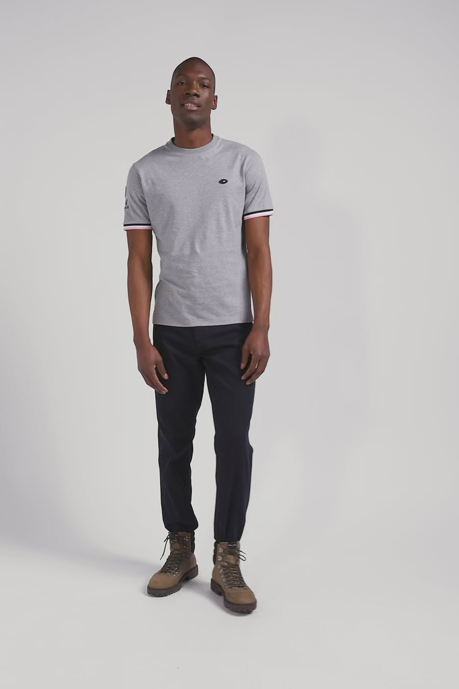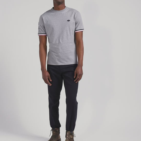 Aux côtés, du XV de France, Eden Park imagine des pièces sport-chic pour le quotidien en s'inspirant du terrain. Avec ses bords-côtes tricolores, son patch manche et sa broderie dos figurant le coq français, ce T-shirt en coton gris ne passe pas inaperçu.