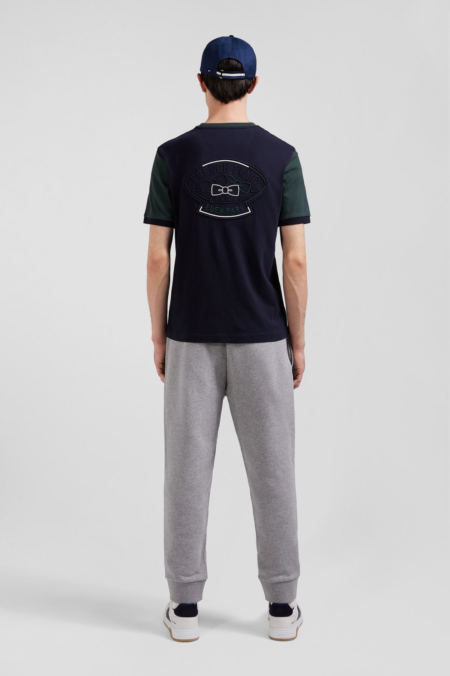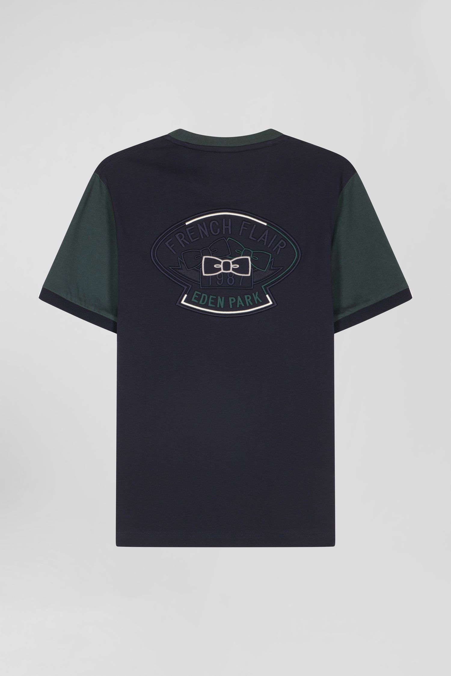 Notre T-shirt homme en coton haut de gamme est rehaussé des éléments iconiques de notre Maison assemblés dans une broderie dos travaillée. Pour une touche graphique ce T-shirt bicolore présente des manches contrastées s'inspirant du vestiaire sportif.