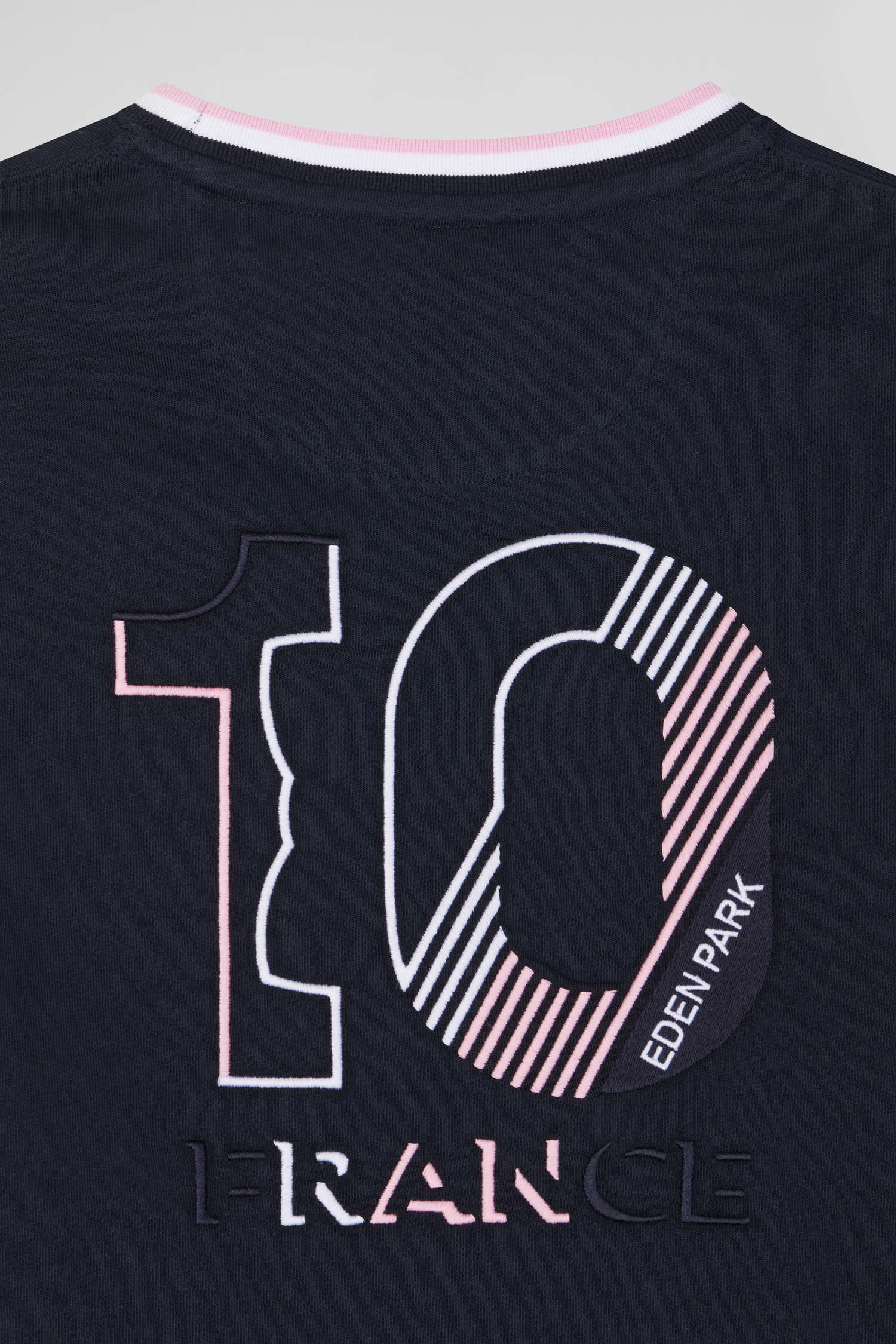 Aux côtés du XV de France, Eden Park conçoit des vêtements imprégnés de l'esprit du jeu pour une élégance quotidienne. Ce T-shirt en coton bleu marine doté de détails subtils arbore une broderie dos mettant en valeur le symbole du coq français. Son col rond et sa coupe droite offrent un confort intemporel, parfait pour toutes les occasions.