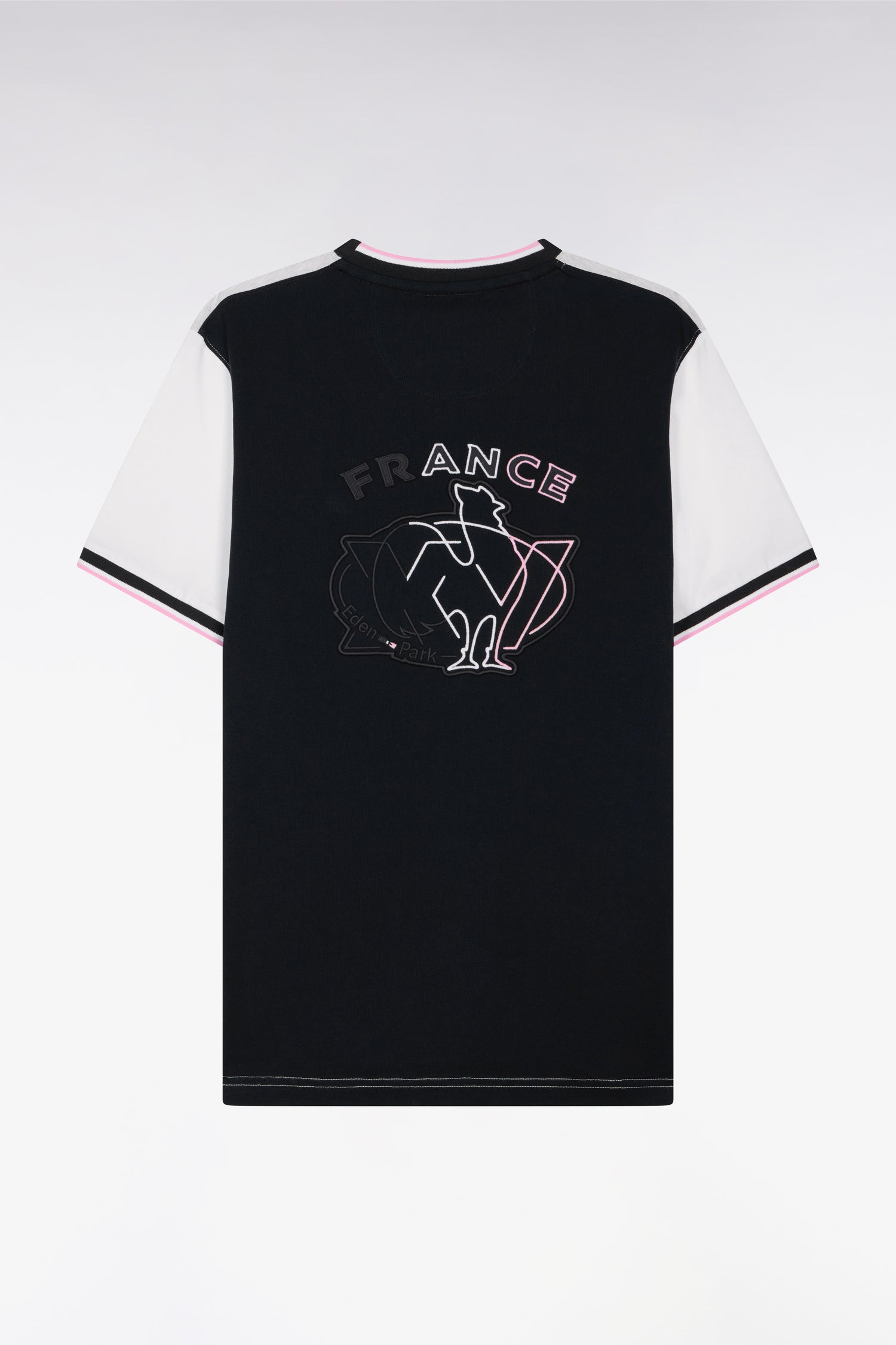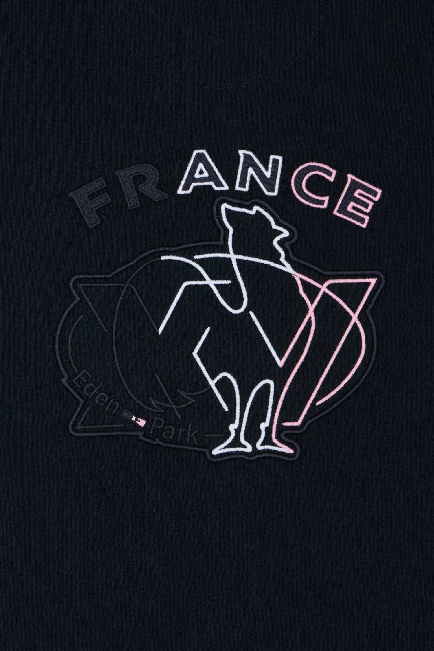 Ce T-shirt en jersey de coton adopte une coupe regular confortable et met à l’honneur les codes emblématiques du rugby français dans une interprétation contemporaine. Le devant gris contraste élégamment avec le dos marine et les manches blanches, créant une silhouette graphique et équilibrée. Au dos, une broderie figurant le coq hexagonal travaillée dans notre association tricolore est rehaussée d’une application de tissu cravate, signature emblématique de la Maison, qui apporte relief et caractère. L’encolure dos et le bas de manches sont soulignés par un bord-côtes rayé en maille plate. Sur la poitrine, le logo FFR est mis en valeur par un jeu de broderie et de badge personnalisé. Un modèle identitaire, pensé pour l’après-match comme pour le quotidien, entre héritage rugby et élégance décontractée.