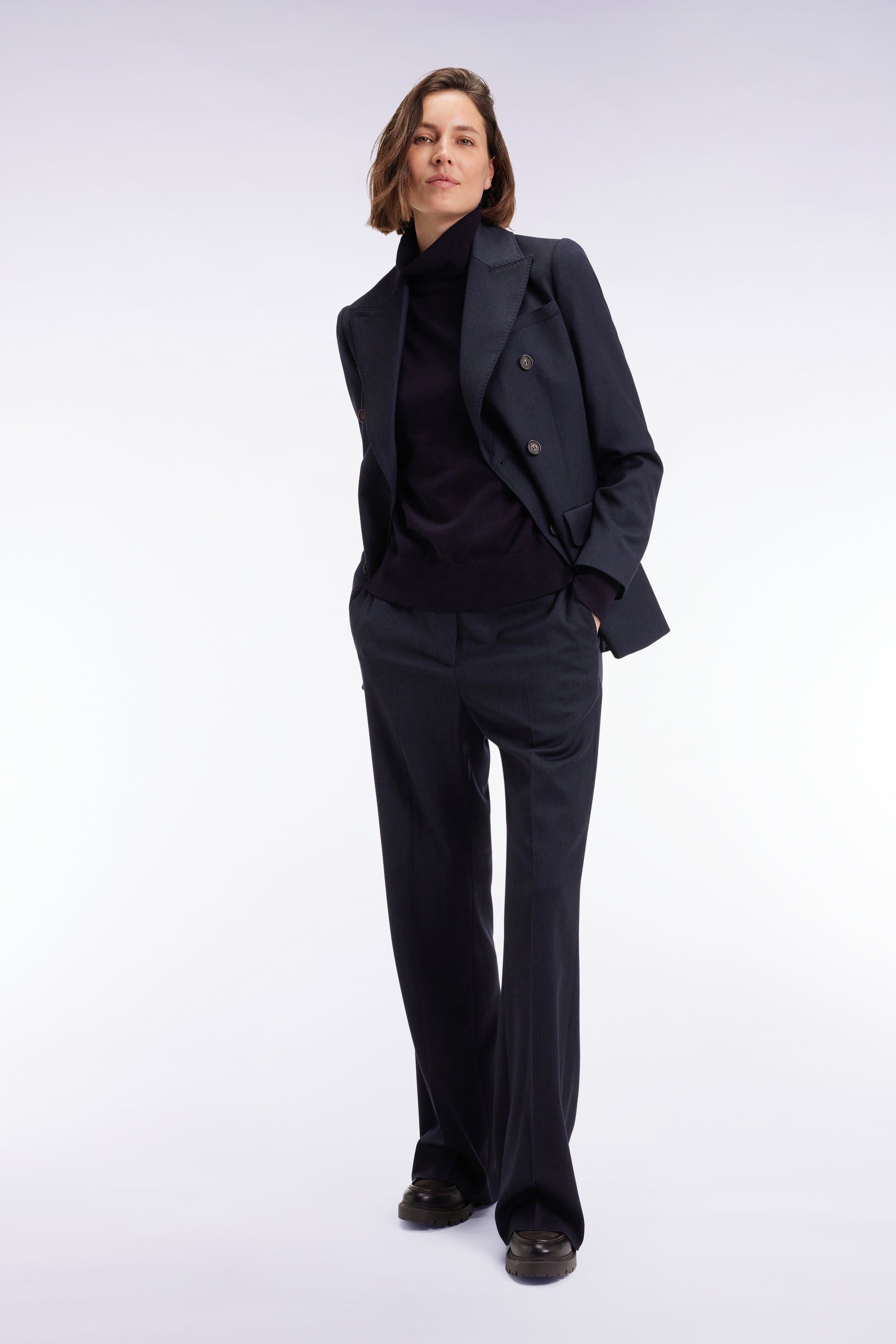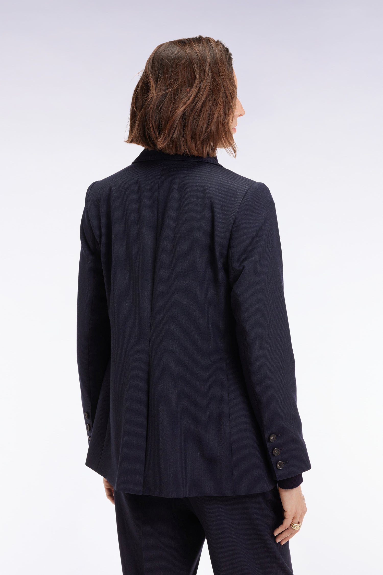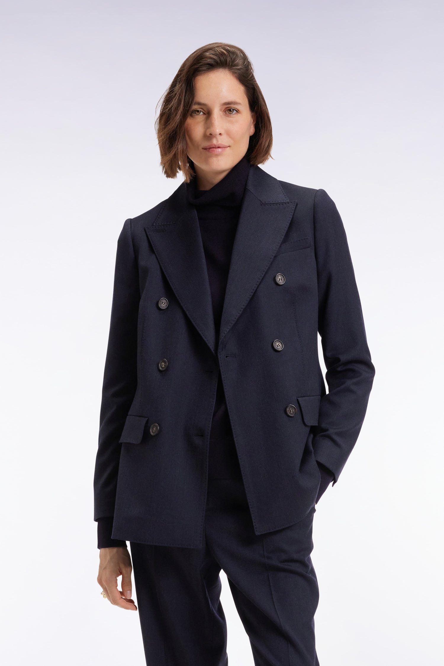 Ce blazer cintré revisite les codes du tailoring féminin dans une flanelle subtilement rayée au tombé parfait. Son étoffe en laine stretch mélangée offre confort et souplesse au porter, sans rien céder au raffinement. Dotée d’un col smoking et d’un double boutonnage ton sur ton, cette veste de costume femme structure la silhouette. Les poches à rabat viennent parfaire l’allure. À associer au pantalon flare assorti ou à détourner en l'associant à un jean large