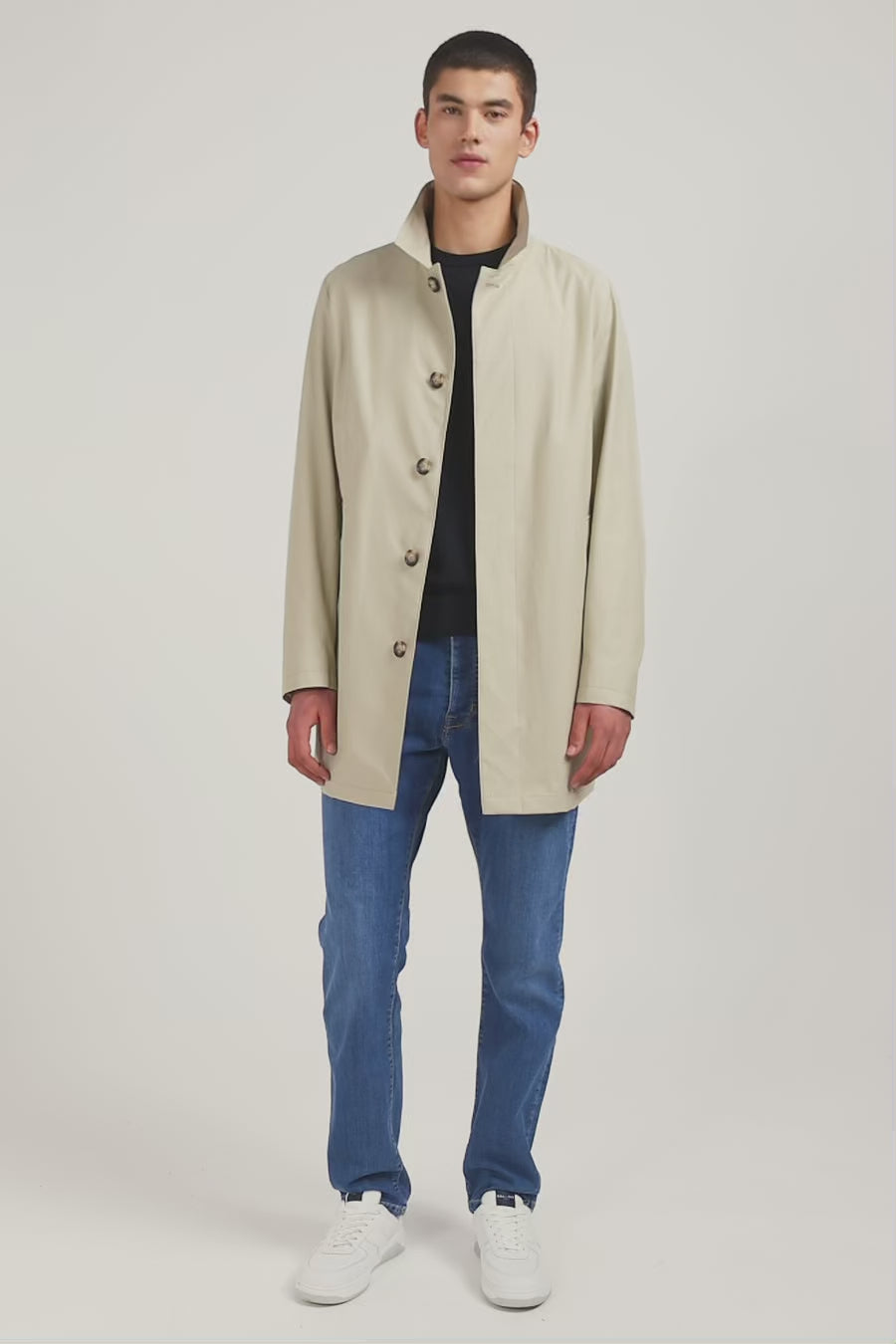 Designed in soft cotton and polyamide with a water-repellent finish, this raincoat features a totally plain color scheme. It features an unbuttoned collar and a loose, straight fit. This raincoat has two front raglan pockets and a buttoned placket closure.