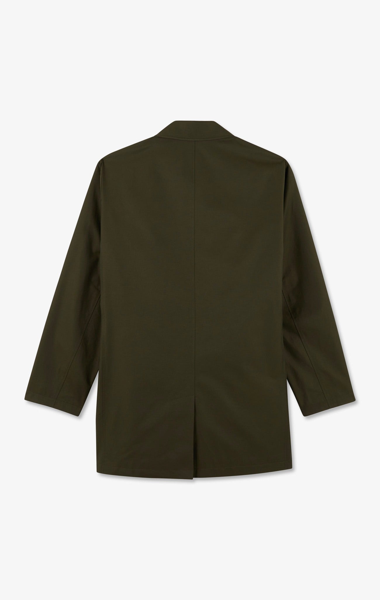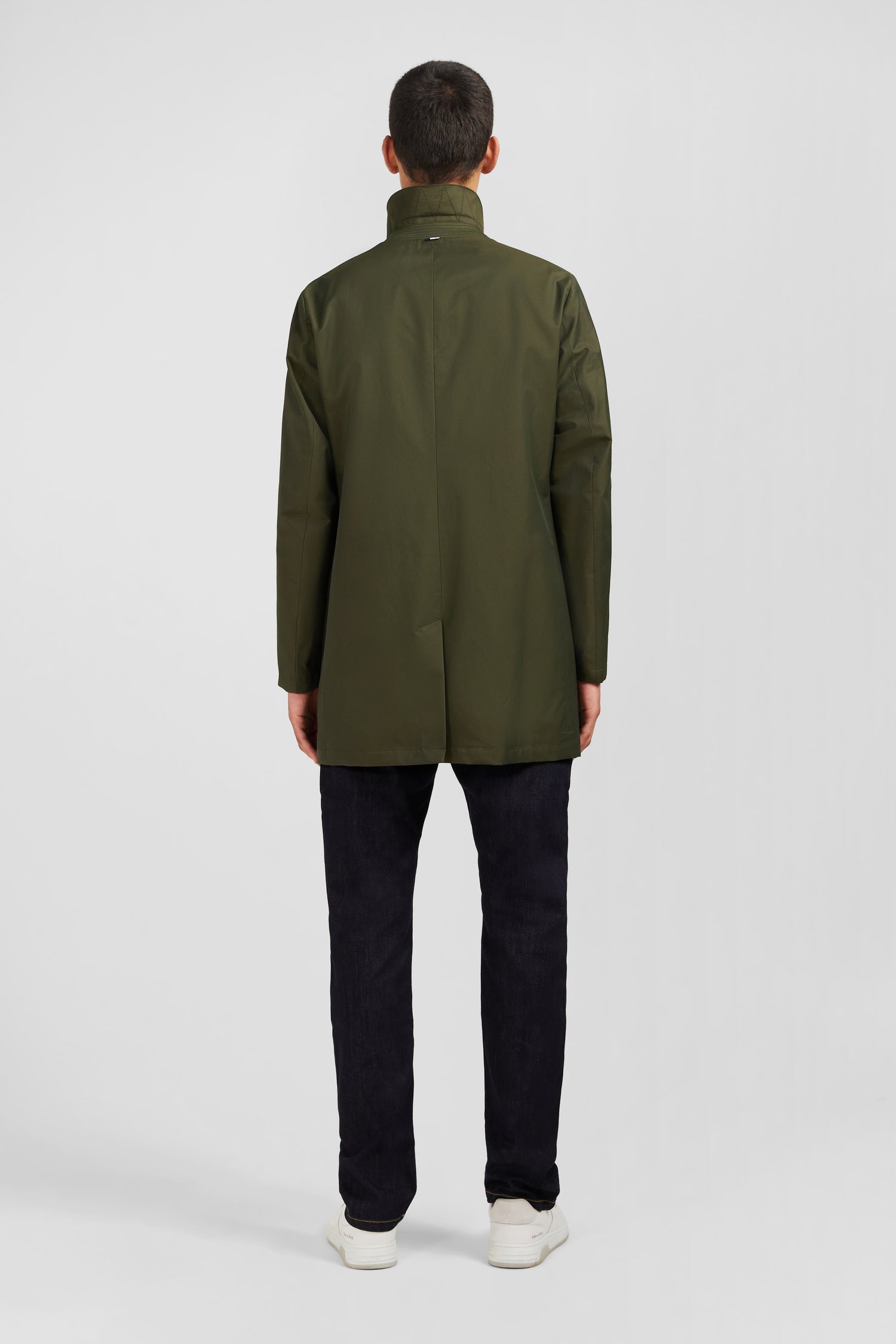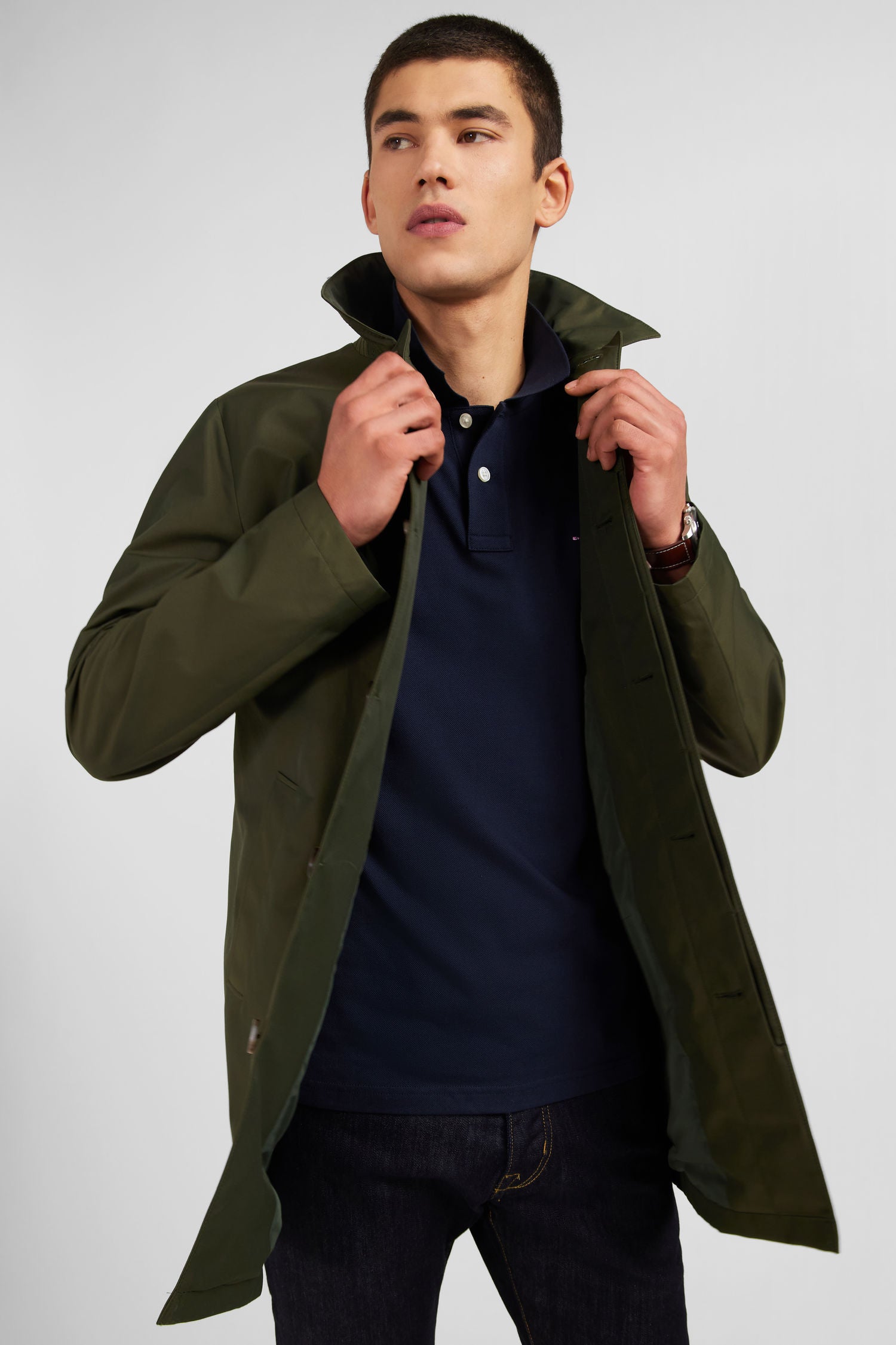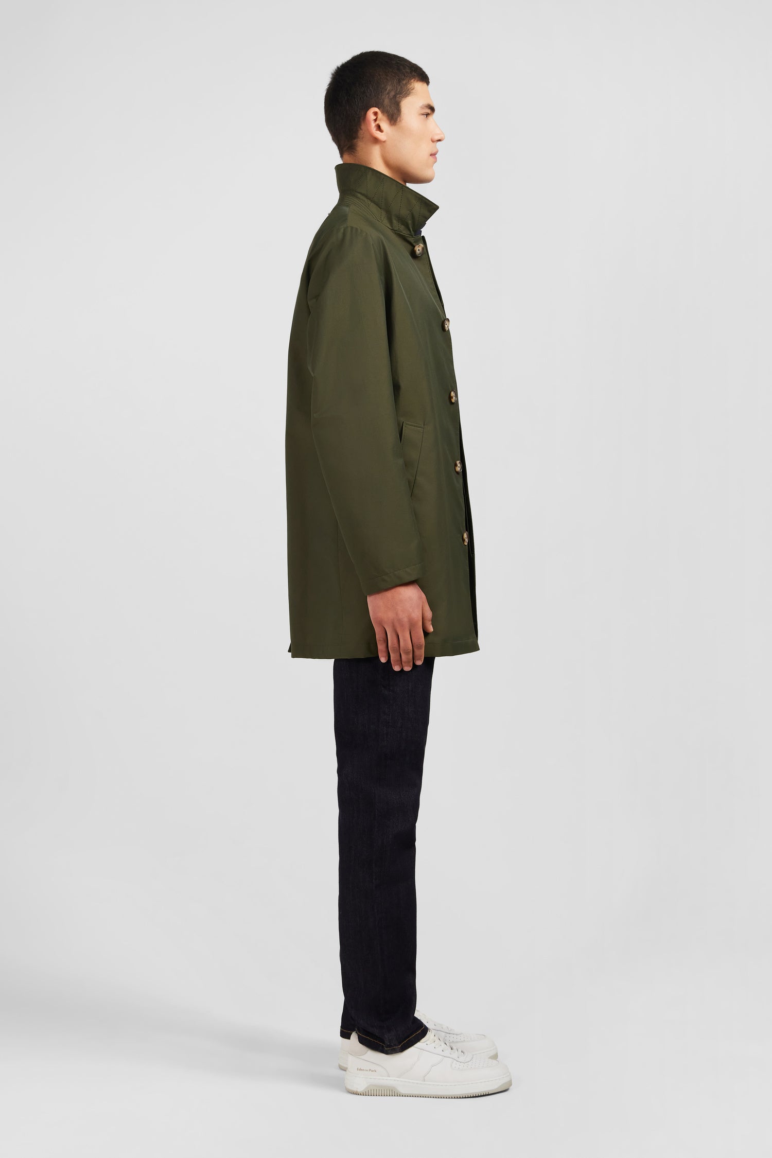 Designed in soft cotton and polyamide with a water-repellent finish, this raincoat features a totally plain color scheme. It features an unbuttoned collar and a loose, straight fit. This raincoat has two front raglan pockets and a buttoned placket closure.
