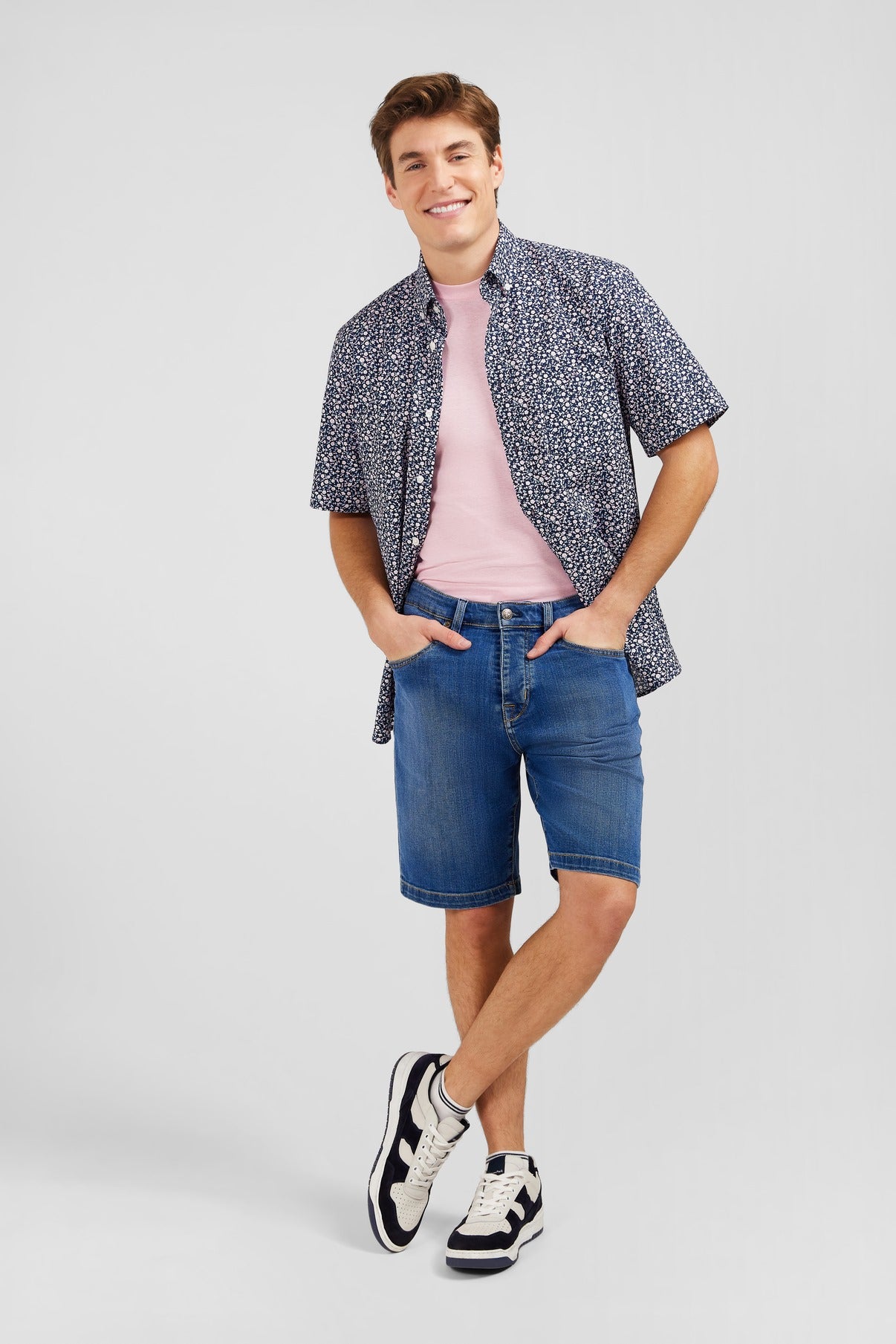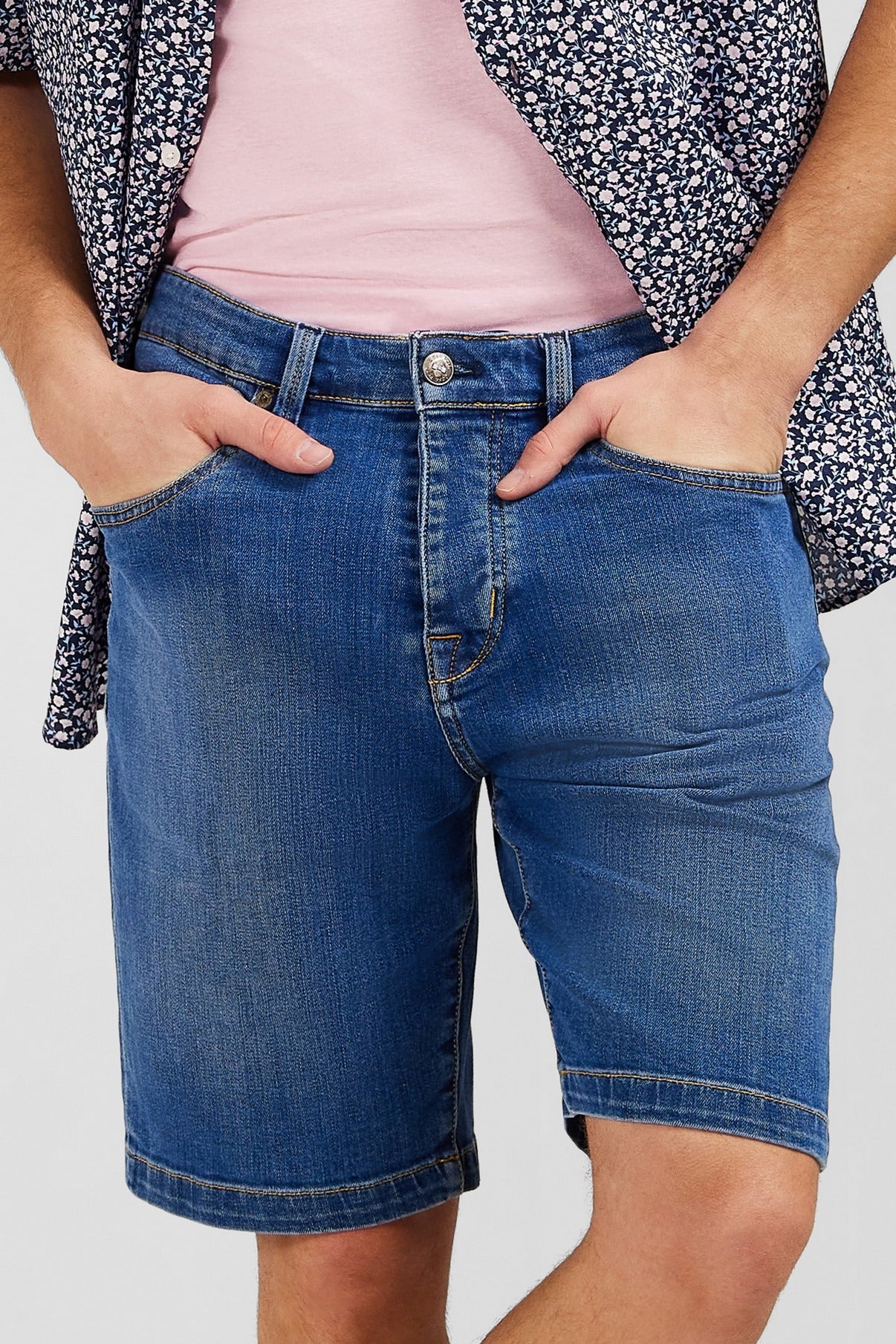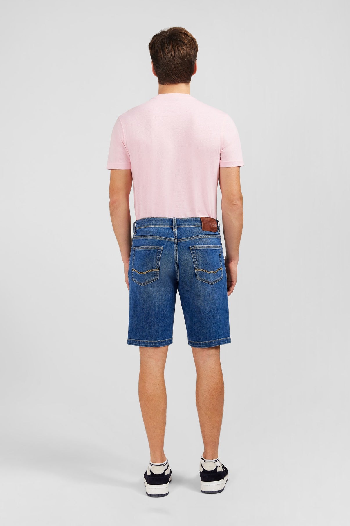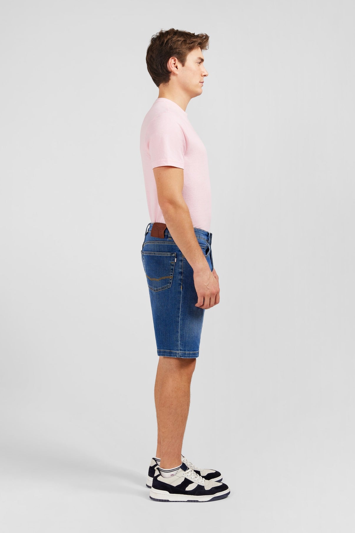 These denim Bermuda shorts feature a beautiful raw colour, highlighted by contrast stitching. Note the embroidered logo in the form of a crest at the ticket pocket