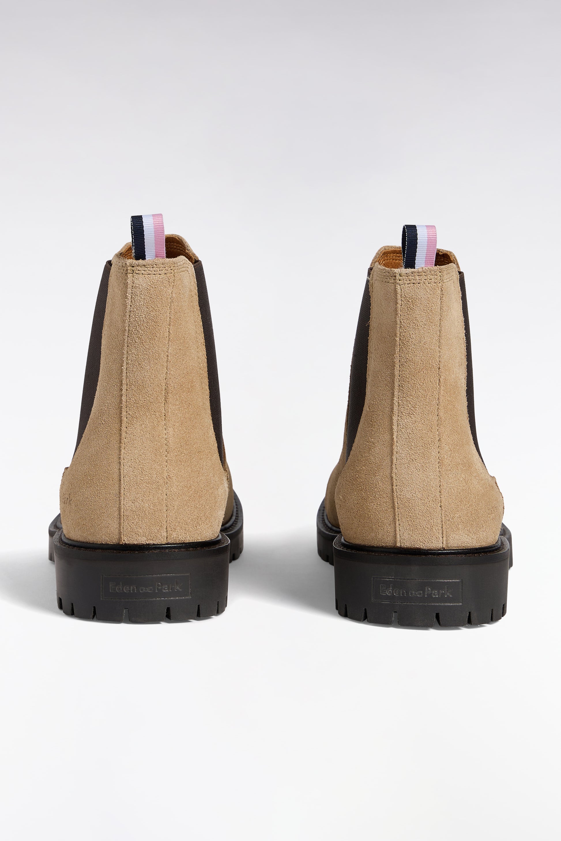 Designed to face winter with style, our Chelsea boots revisit a great classic of the men's wardrobe. Made from beige, black or grey suede leather, they combine city style with everyday comfort. Their notched soles ensure good grip on the ground, while side elastic bands make them easy to put on and adapt naturally to your feet. Wear with raw denim jeans or dressier pants for a casual chic silhouette from morning to night. On the back, a tricolor ribbon displays Eden Park's French Flair DNA.