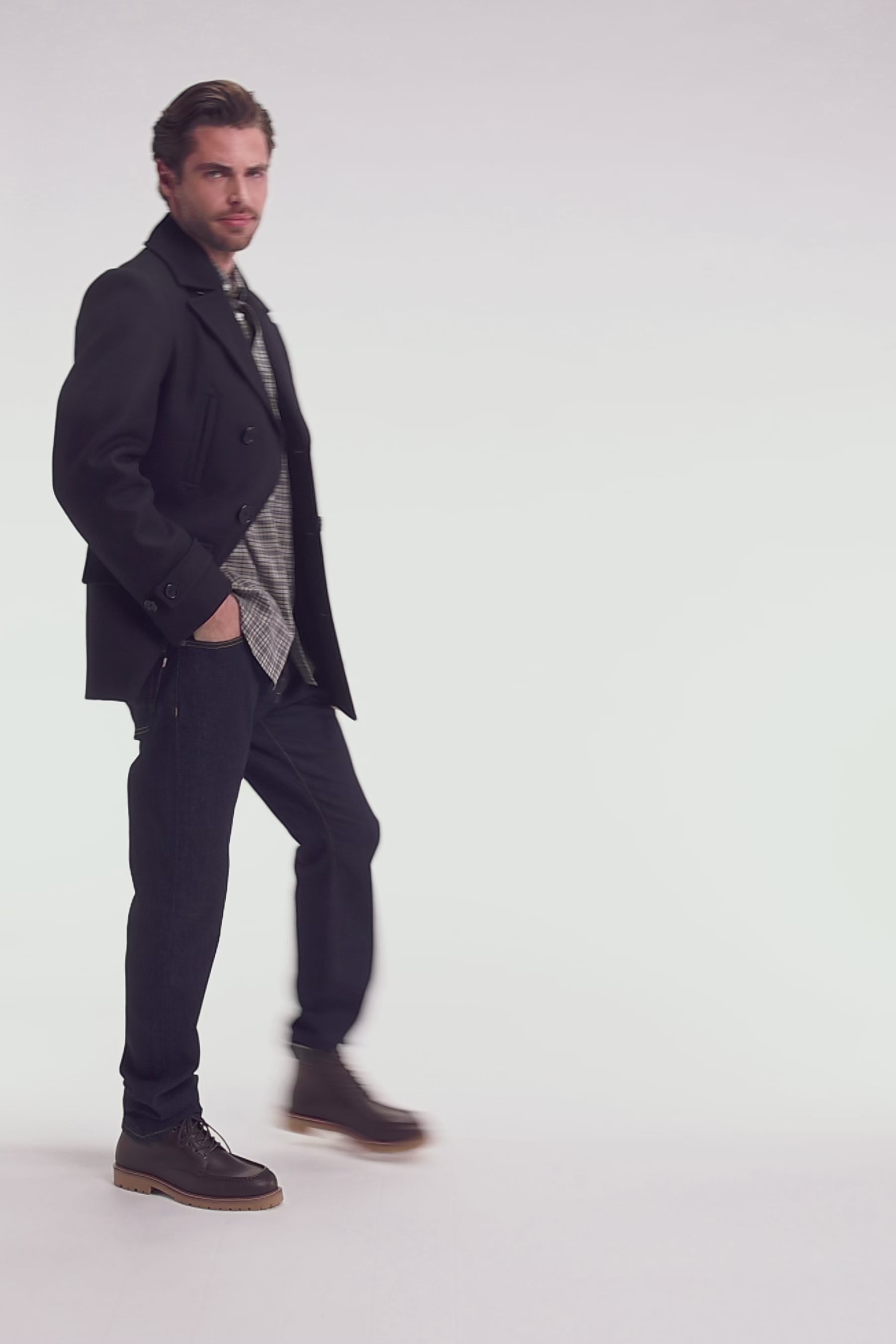 A men's wardrobe classic revisited by the Eden Park studio, this navy wool-blend coat combines warmth, urban elegance and refinement. Its structured cut is enhanced by double-breasted buttoning, a notched collar with a Milanese slit inspired by men's suits, and a striped lining, a nod to our House's rugby heritage. Double welt pockets and an embroidered crest under the collar underline a masterful sense of detail.