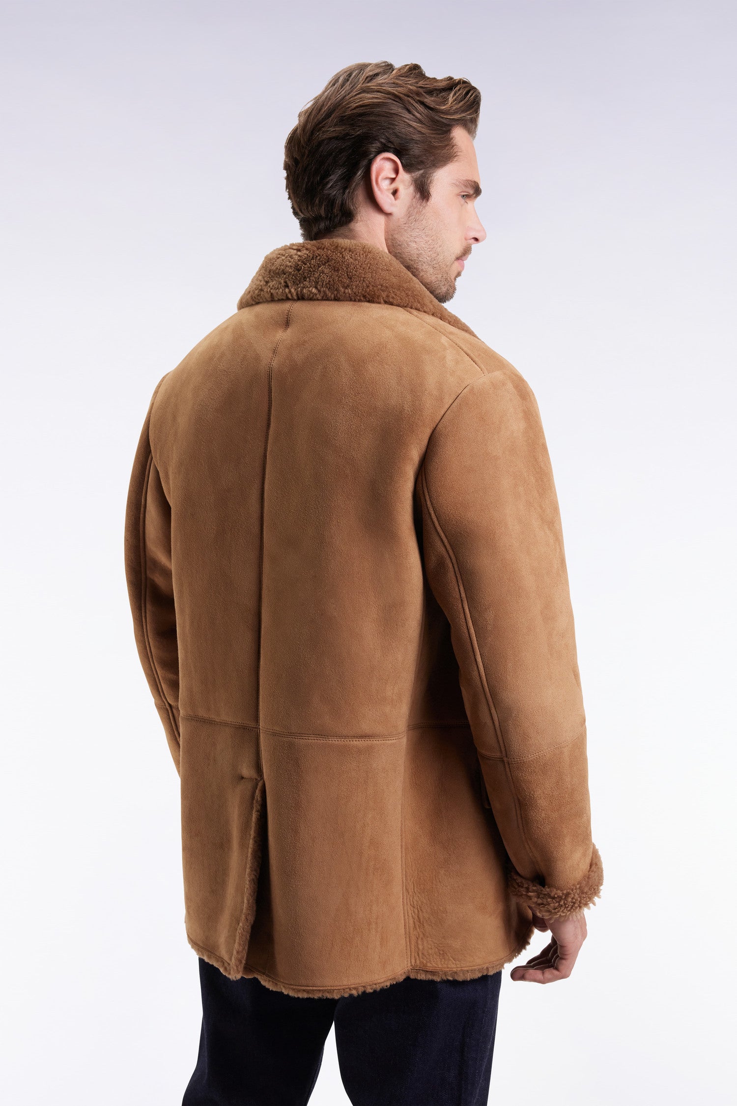 An exceptional piece crafted from genuine brown shearling, this shearling coat embodies the raw elegance of our men's fashion collections. Unlined to preserve the suppleness and character of the material, this coat seduces with its natural warmth, clean-edged finish and structured fall. The double-breasted buttoning, piped pockets and embossed leather patch on the sleeve reveal Eden Park's expertise and attention to detail. A timeless investment, designed to patina with style over the years.
