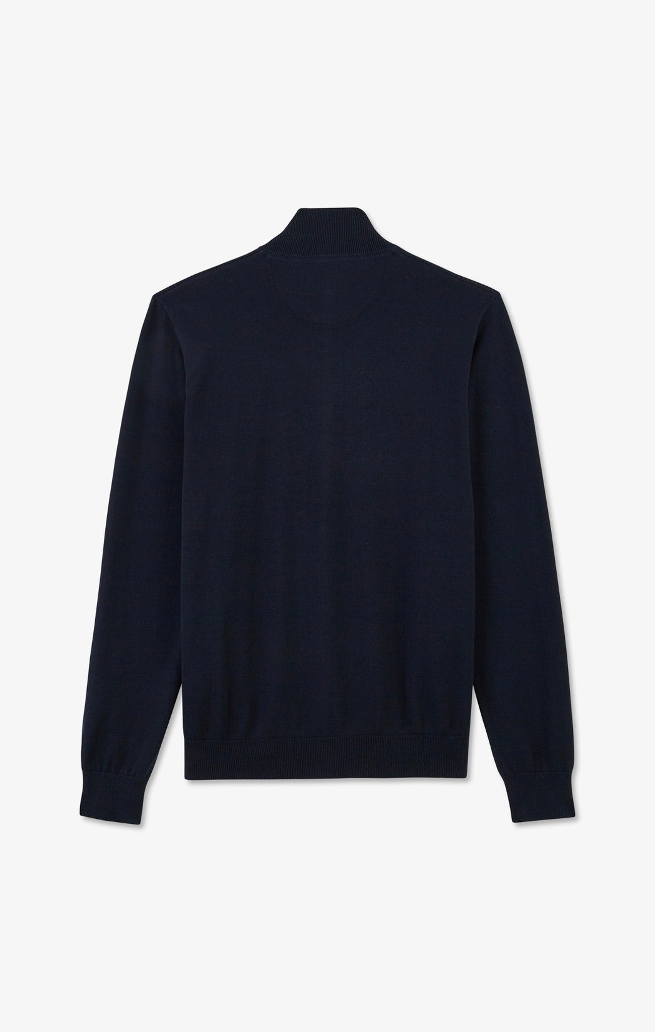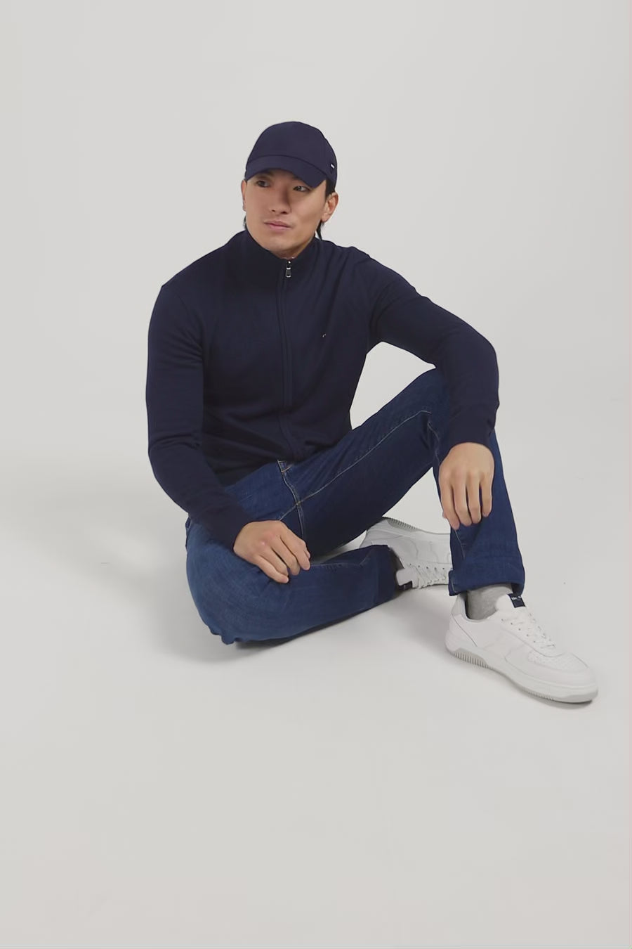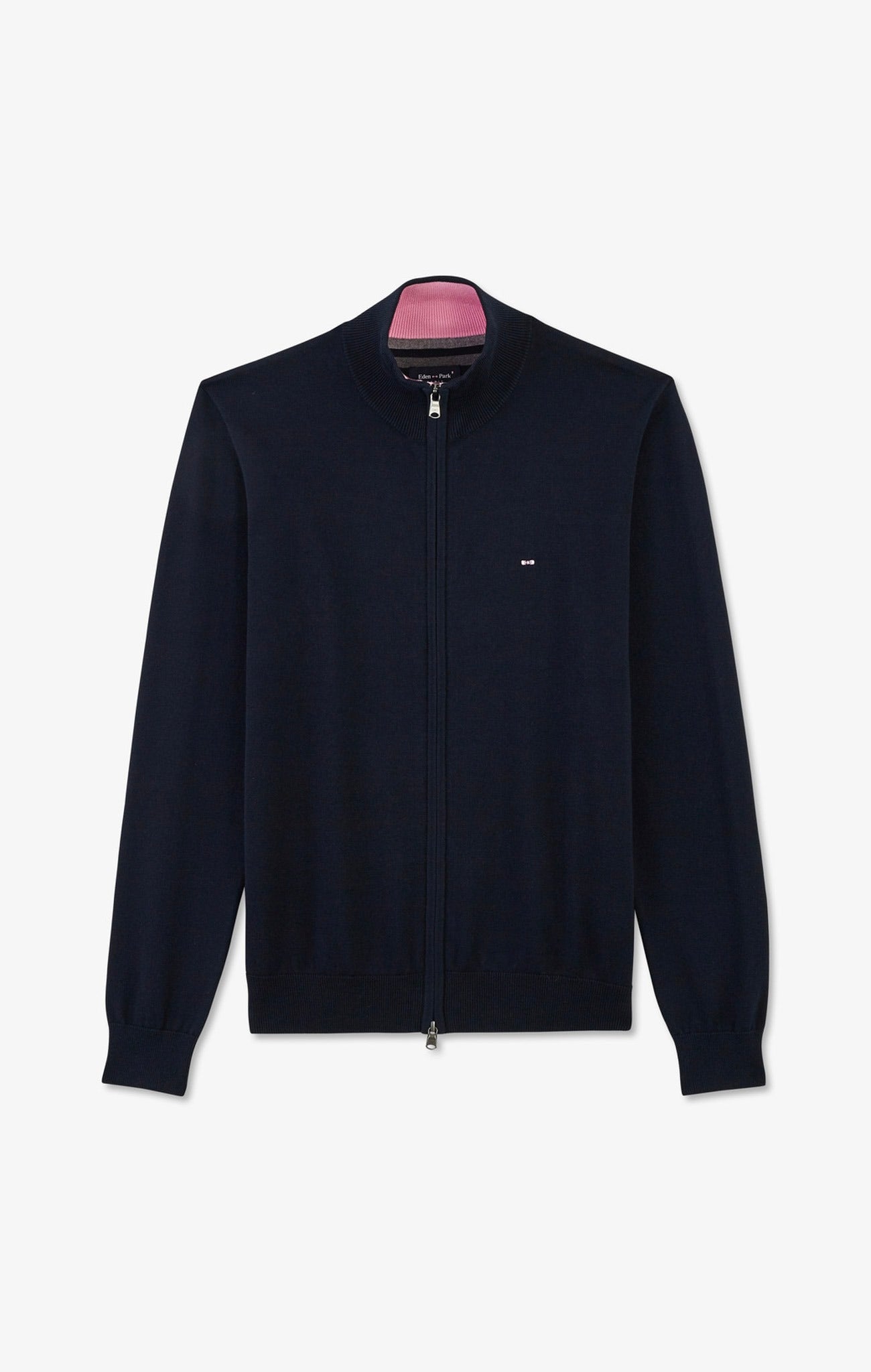 Understatement and a sporty design characterise this zip cardigan with an enveloping collar. Crafted in soft cotton jersey, this chic, comfortable piece is a natural-born winner. In the heart of winter, warm up this timeless classic with a solid wool coat and ribbed beanie.