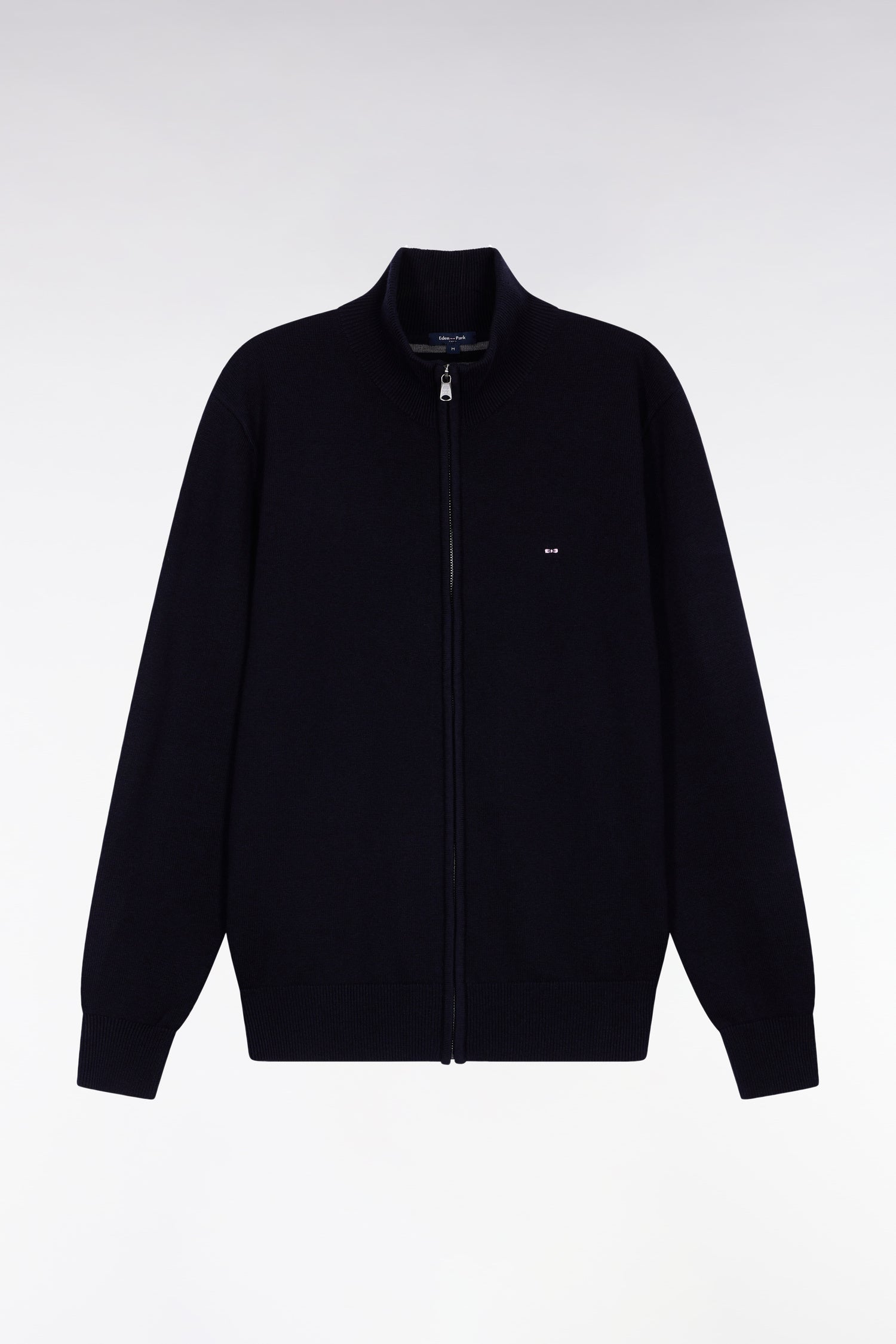 Zipped cardigan in wool and navy cotton, straight cut