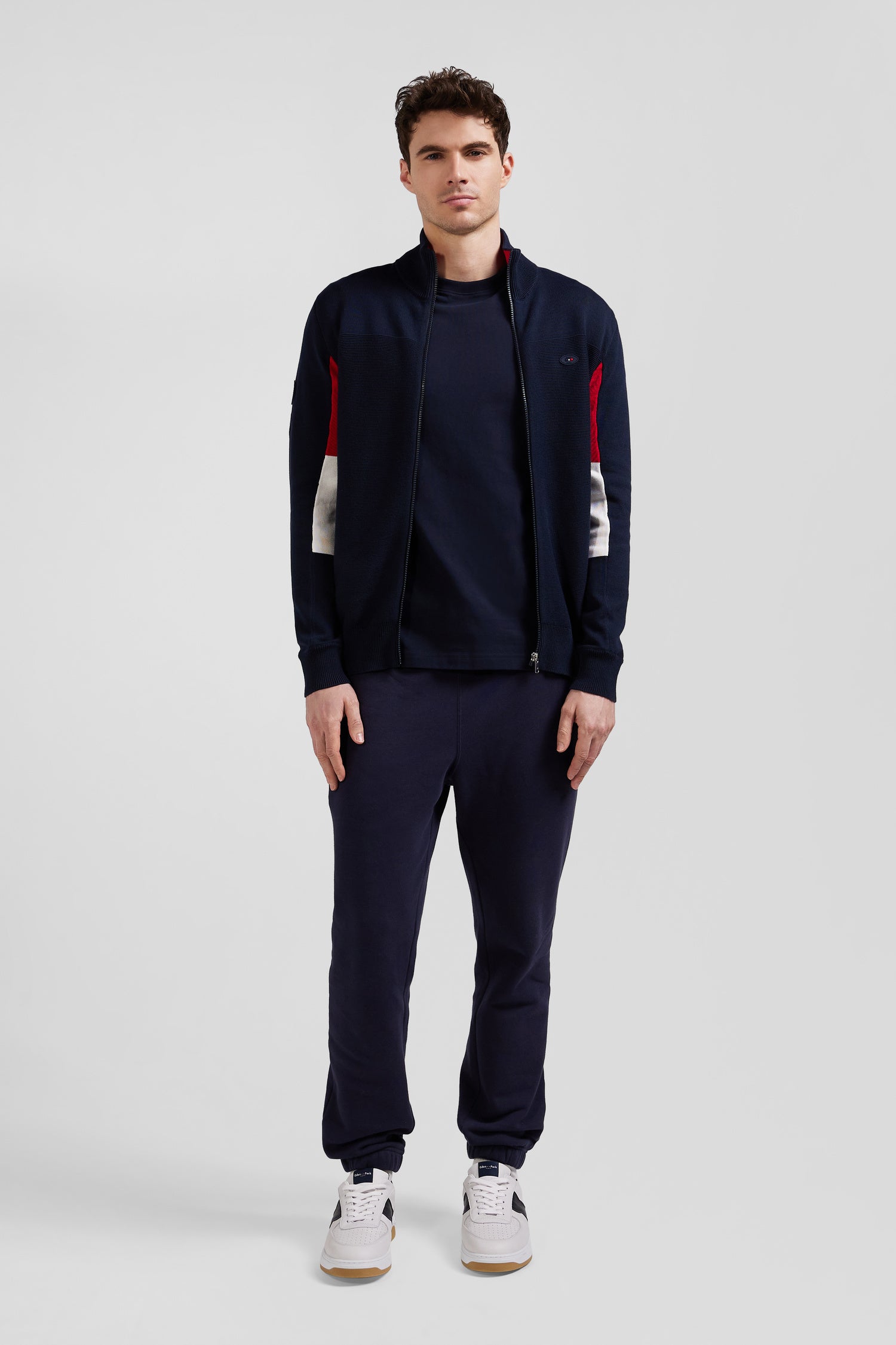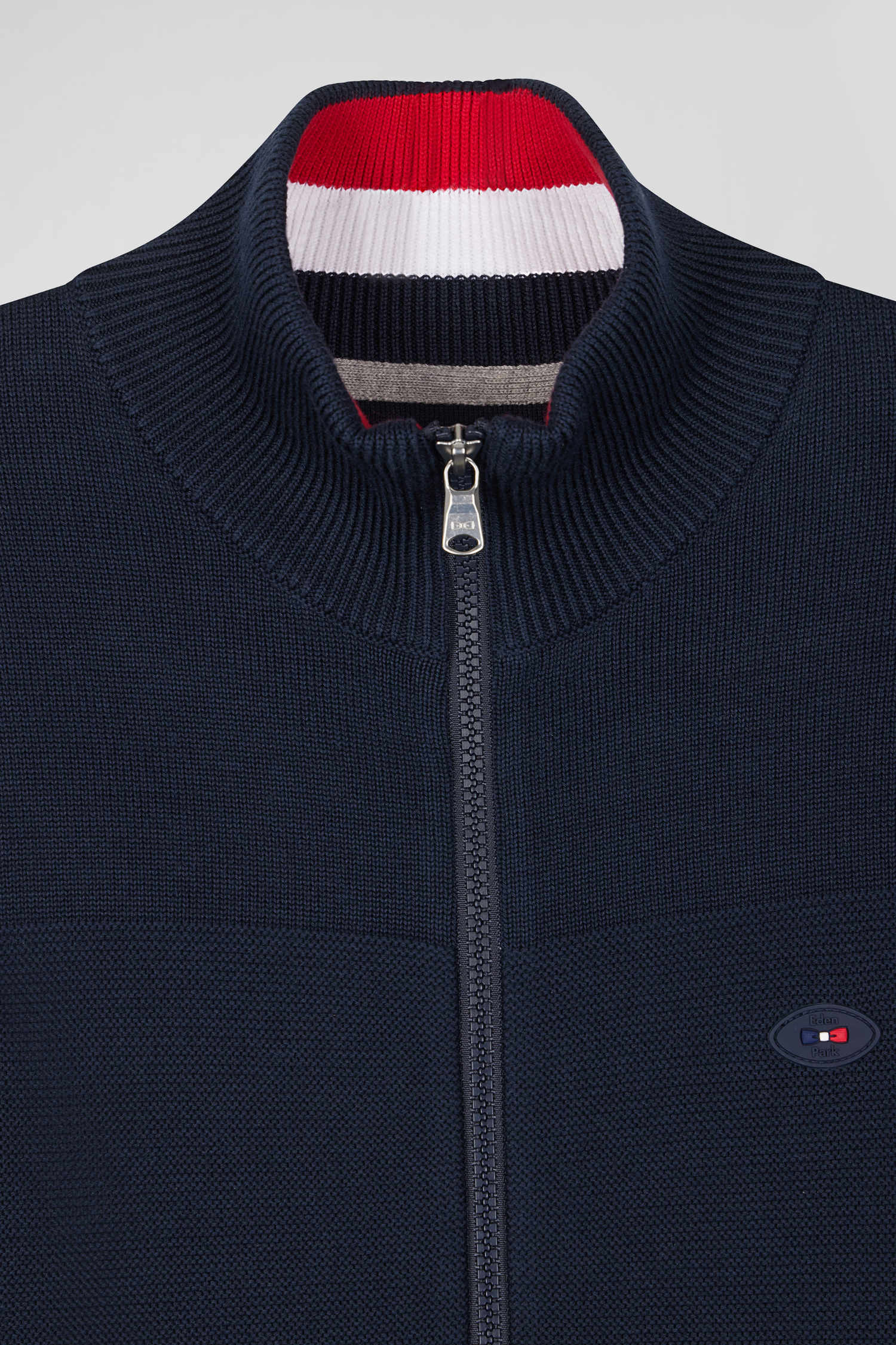 Express your passion for rugby in style with this high-neck zipped cardigan, proudly featuring tricolored undersleeves matching the collar, echoing the colors of the XV de France. This garment, rich in details such as gum crests and symbolic embroidery, elegantly fuses sporty style with Eden Park's signature French Flair elegance. This trendy cardigan with its meticulous finishing is an elegant tribute to the spirit of French rugby.