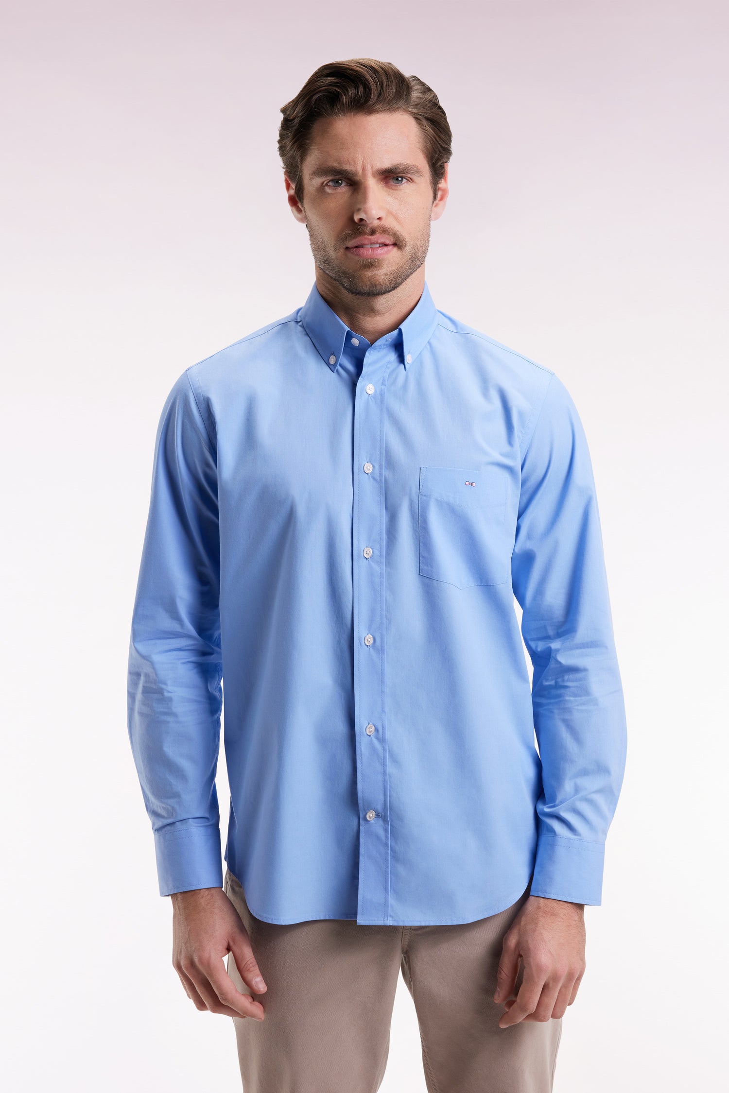 Behind its streamlined look, this elegant cotton poplin shirt hides a playful wink that Eden Park wardrobe insiders will recognize. The House emblem, the bow tie, is concealed in a micro-patterned print on the inside of the collar and worked into blue elbow patches. An elegant shirt with a straight cut, twisted with contrasting finishes that underline its French Flair spirit. This timeless, original model is available in sky, navy or white cotton, and always features a button-down collar for extra hold.