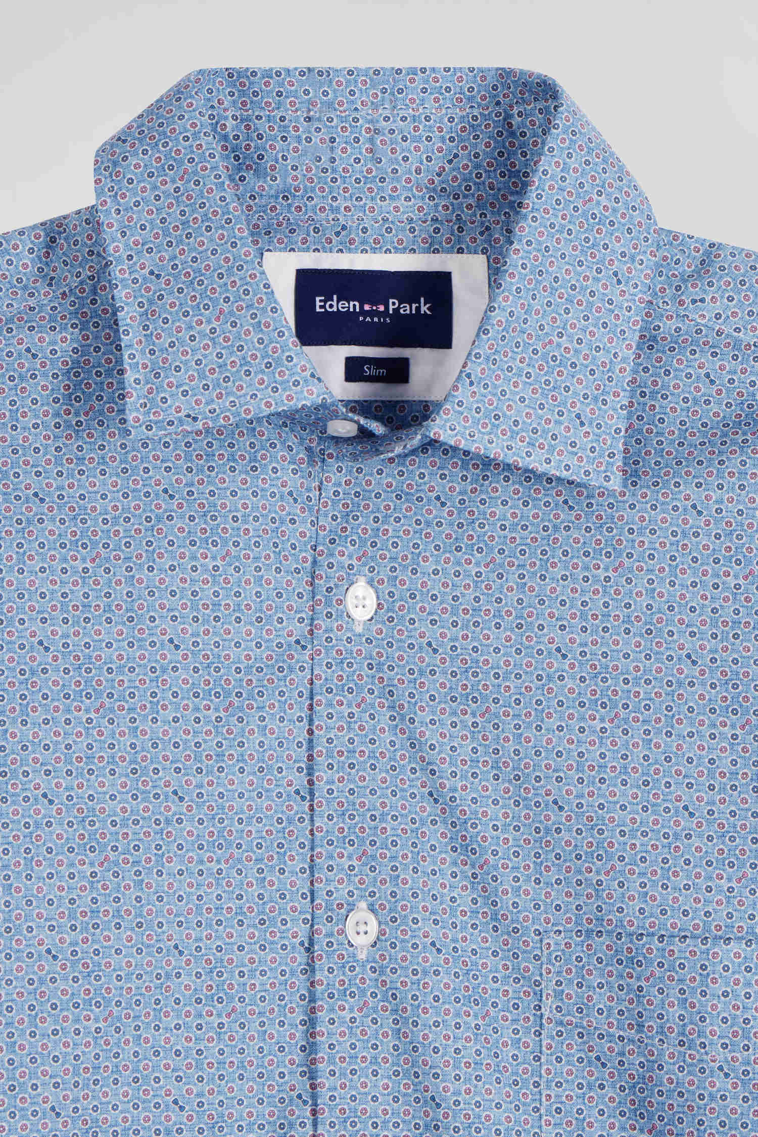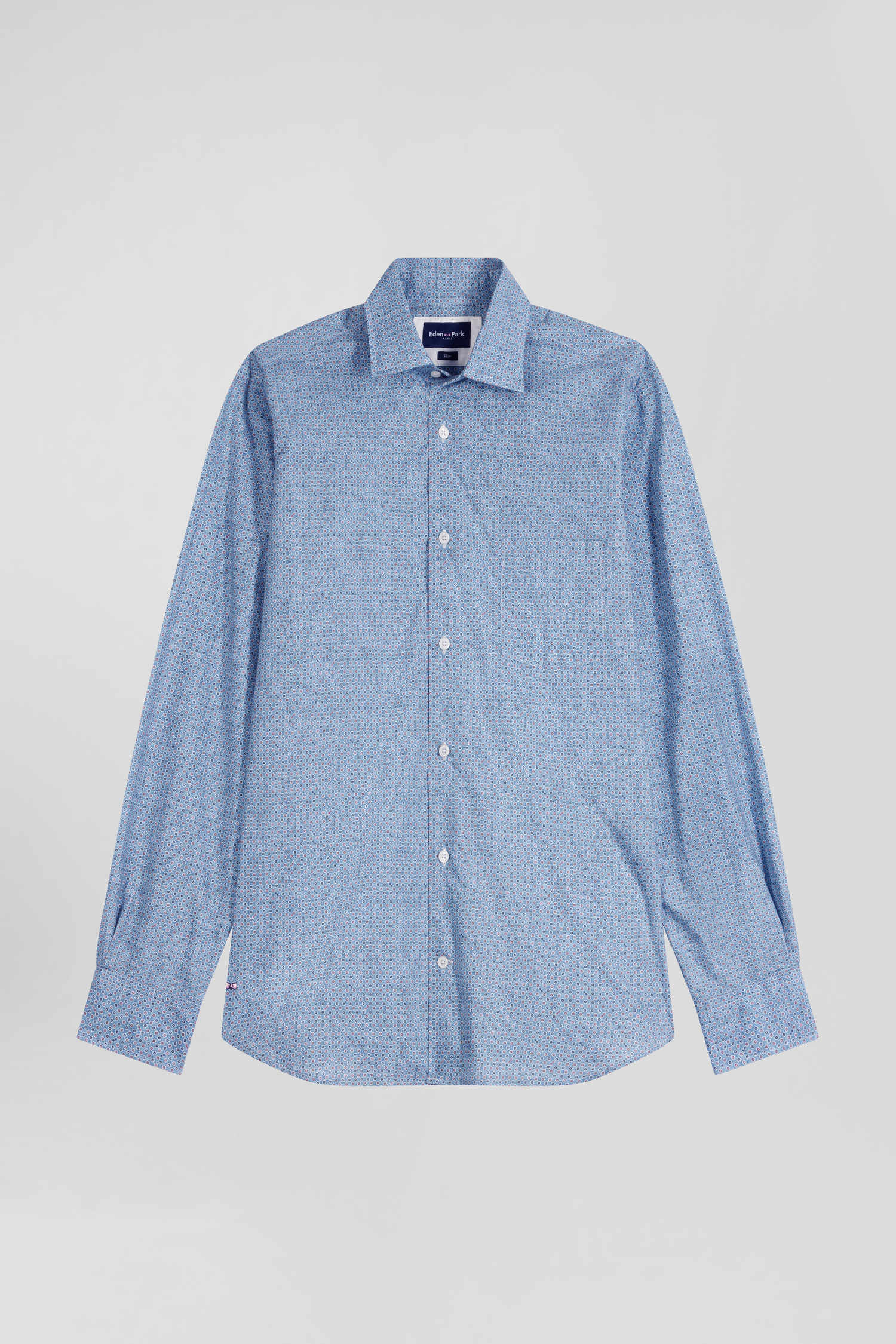 Opt for the understated elegance of this shirt in Italian cotton poplin, available in shades of pink or sky. It features a floral motif where you'll also recognize our iconic bow tie. The free point collar and patch chest pocket combine classic style and functionality, while the embroidered bow at the bottom of the piece subtly signals its place in our collection. This smart shirt with its slim, slightly fitted cut is perfect for a sophisticated look.