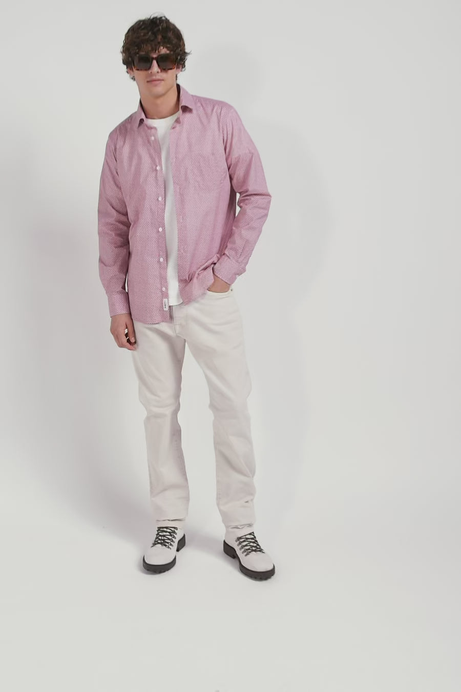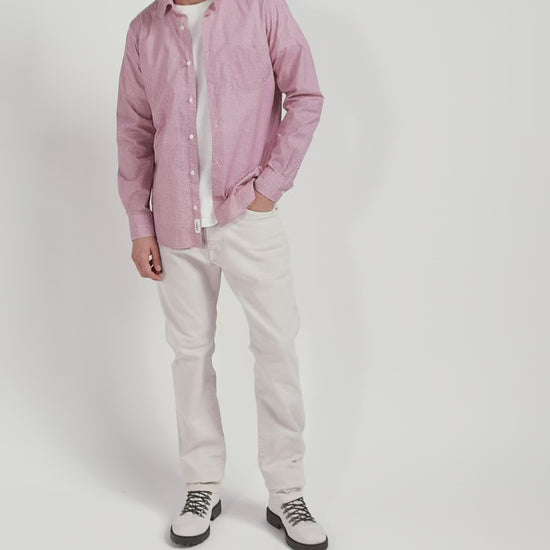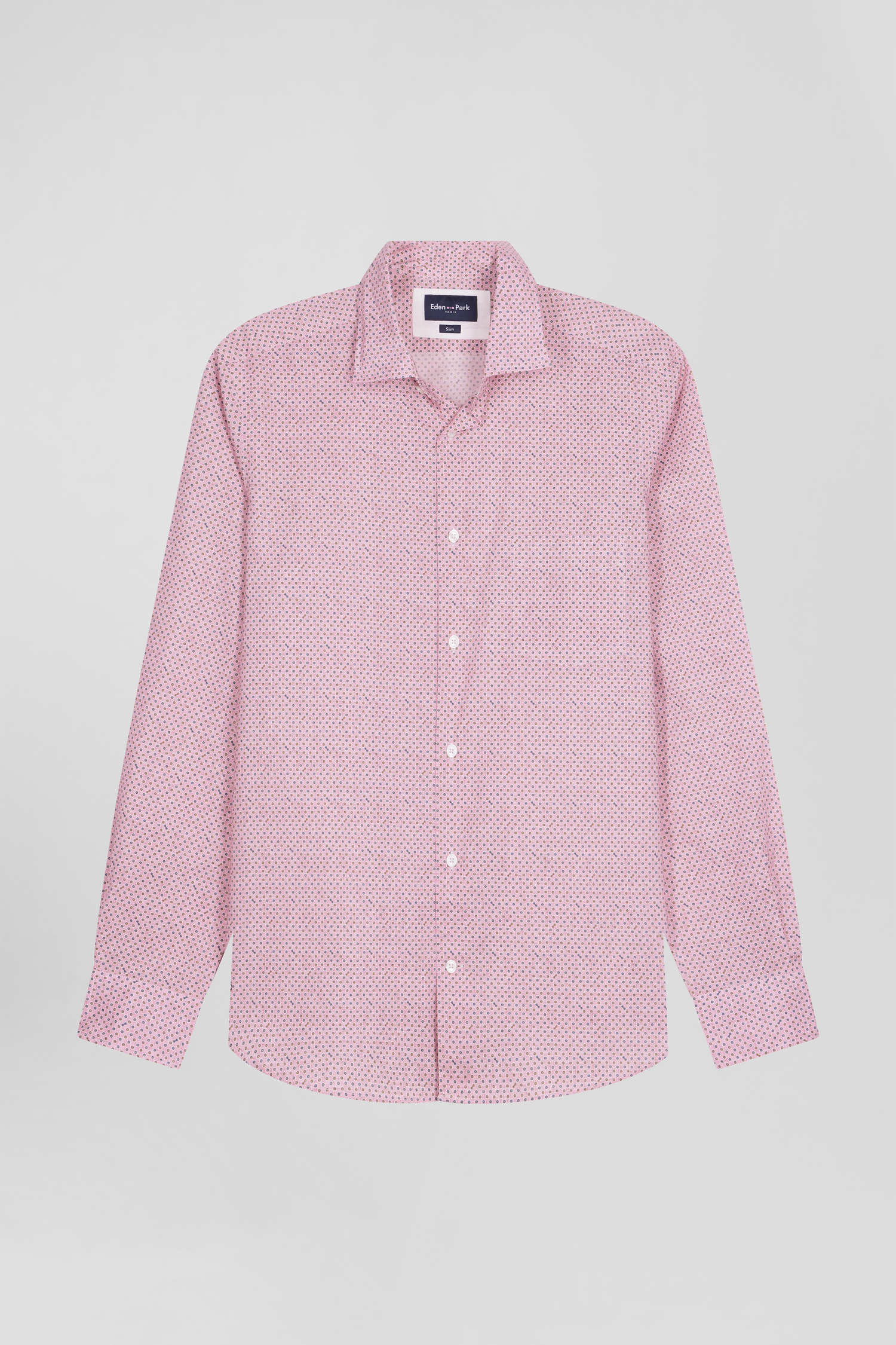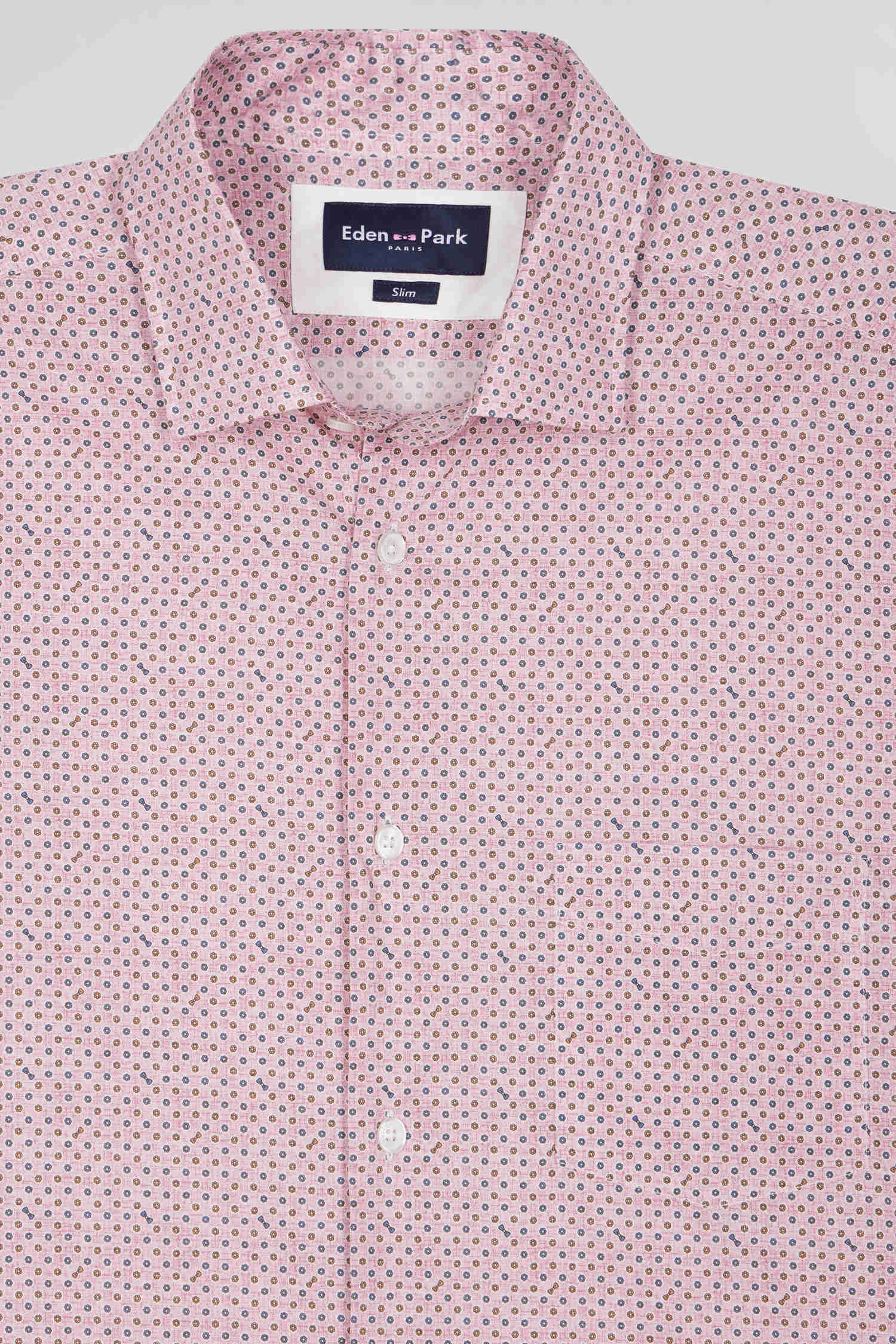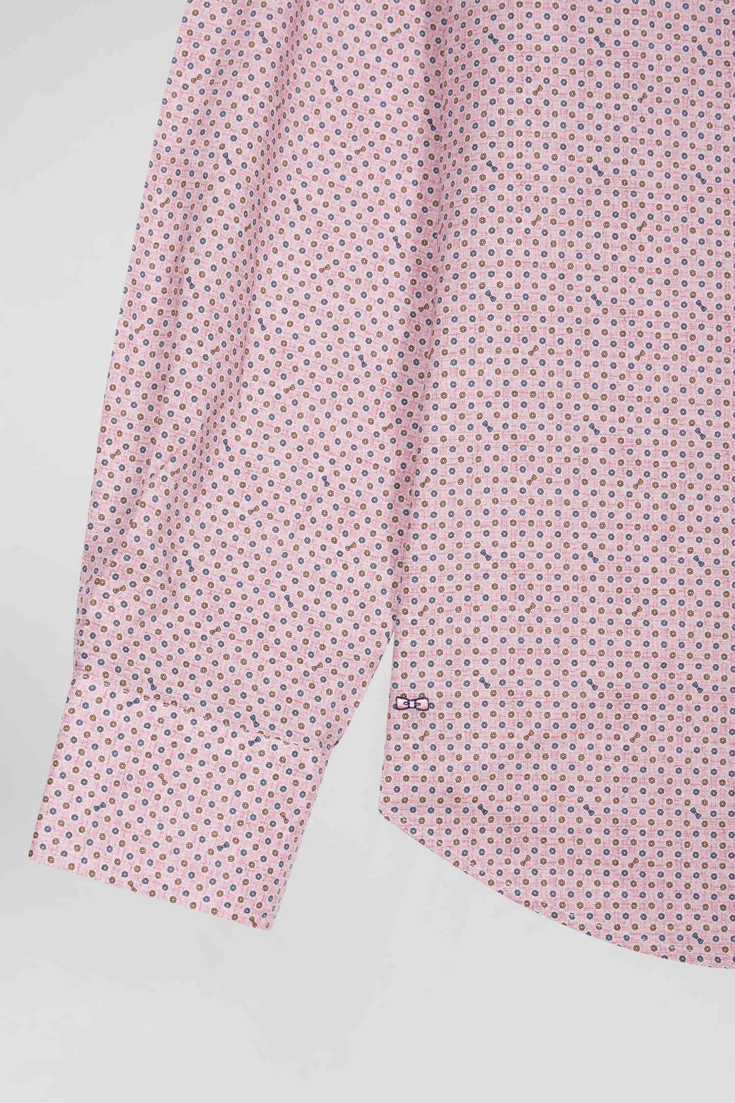 Opt for the understated elegance of this shirt in Italian cotton poplin, available in shades of pink or sky. It features a floral motif where you'll also recognize our iconic bow tie. The free-point collar and patch chest pocket combine classic style and functionality, while the embroidered bow at the bottom of the piece subtly signals its place in our collection. This smart shirt with its slim, slightly fitted cut is perfect for a sophisticated look.