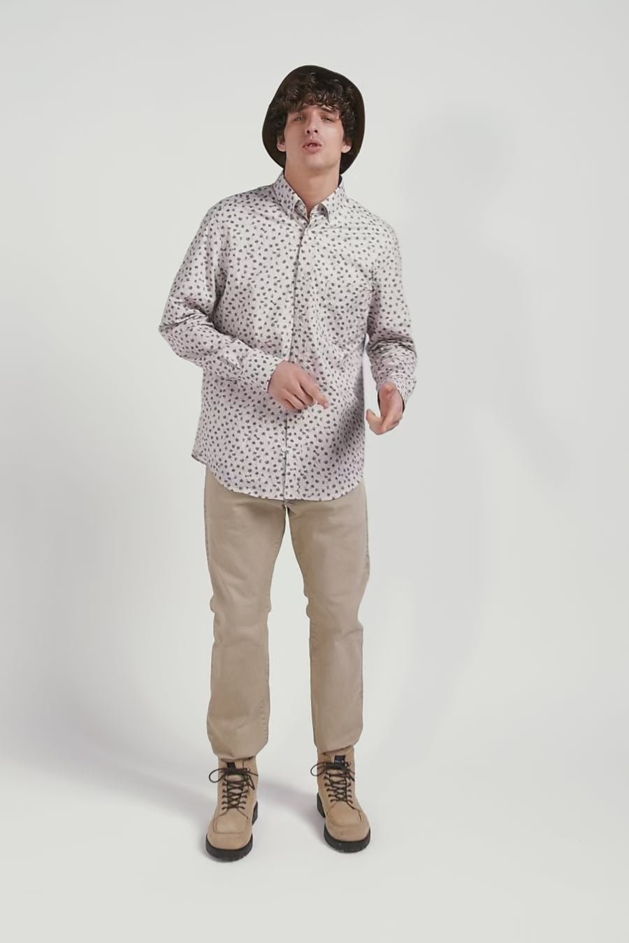 Regular beige cotton poplin shirt with microprint
