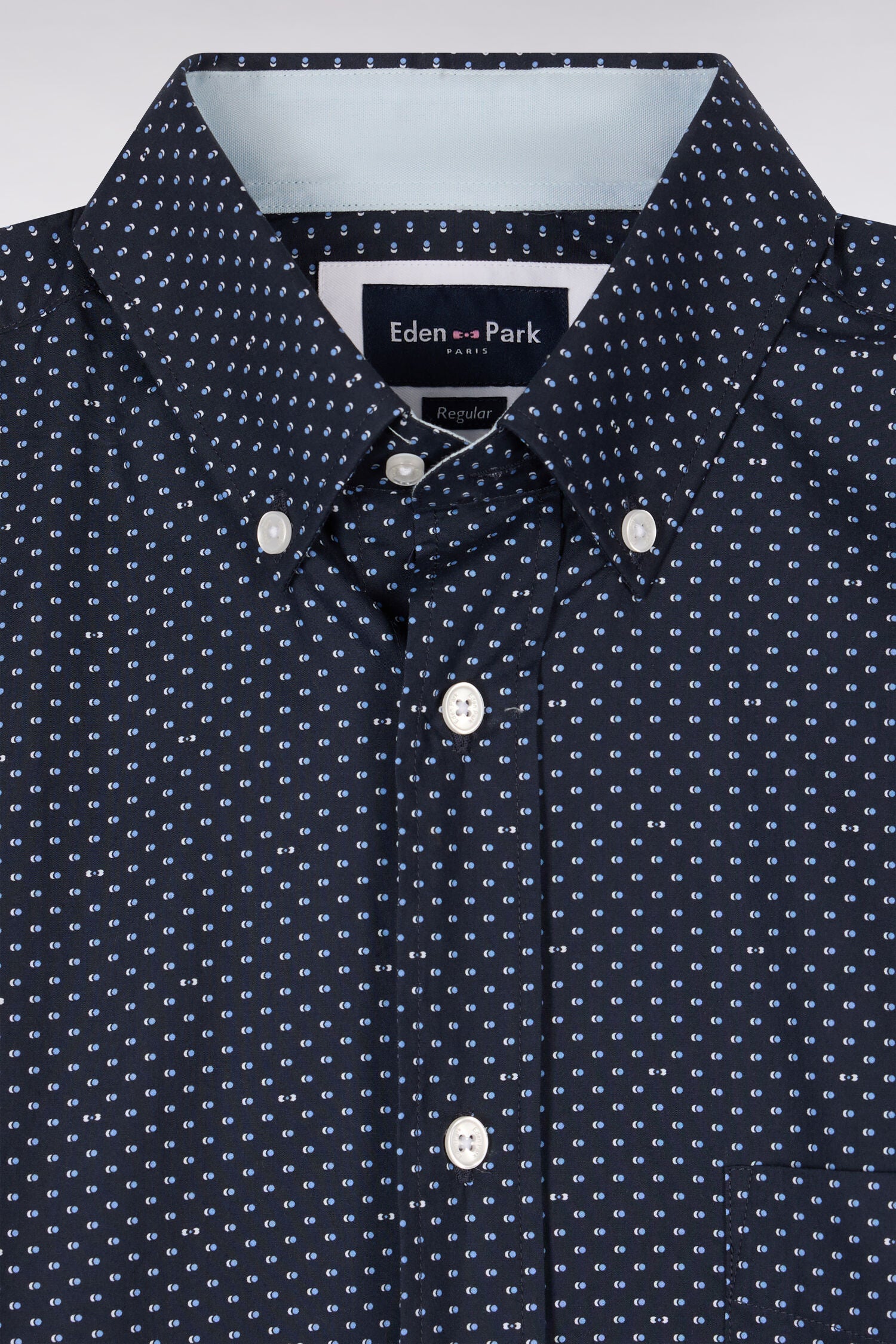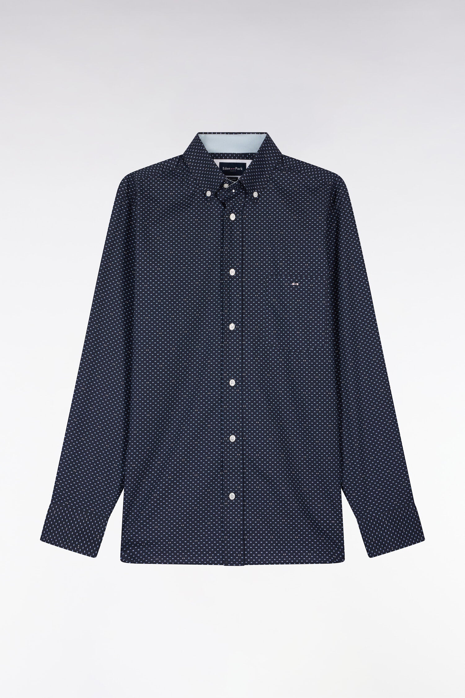 Tissée dans une douce popeline de coton, cette chemise masculine marine à poche plaquée est dotée d'un micromotif graphique qui illuminera les tenues les plus simples. Son col à pointes boutonnées met en valeur le port de tête tandis que sa coupe droite aux bords arrondis permet de la glisser sans effort dans un jean ou un chino. Un modèle offert en coloris ciel ou en rose, deux coloris signature de nos collections de mode.
