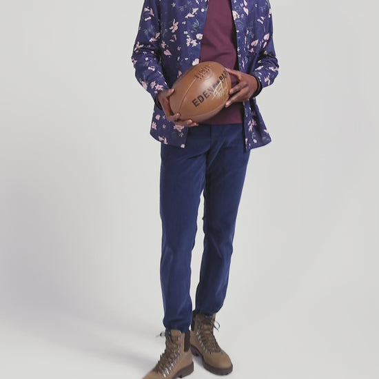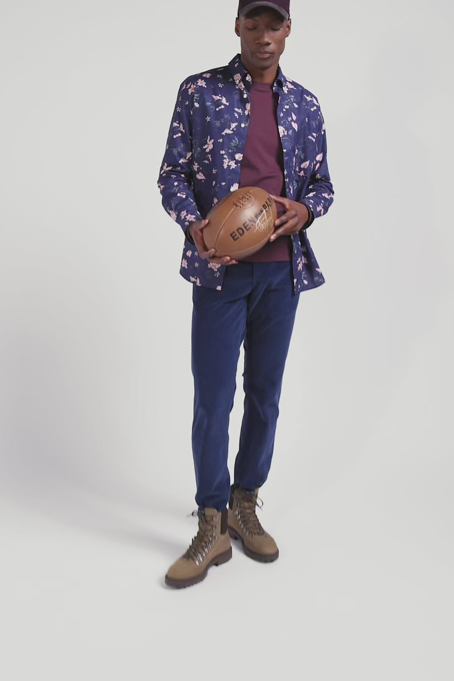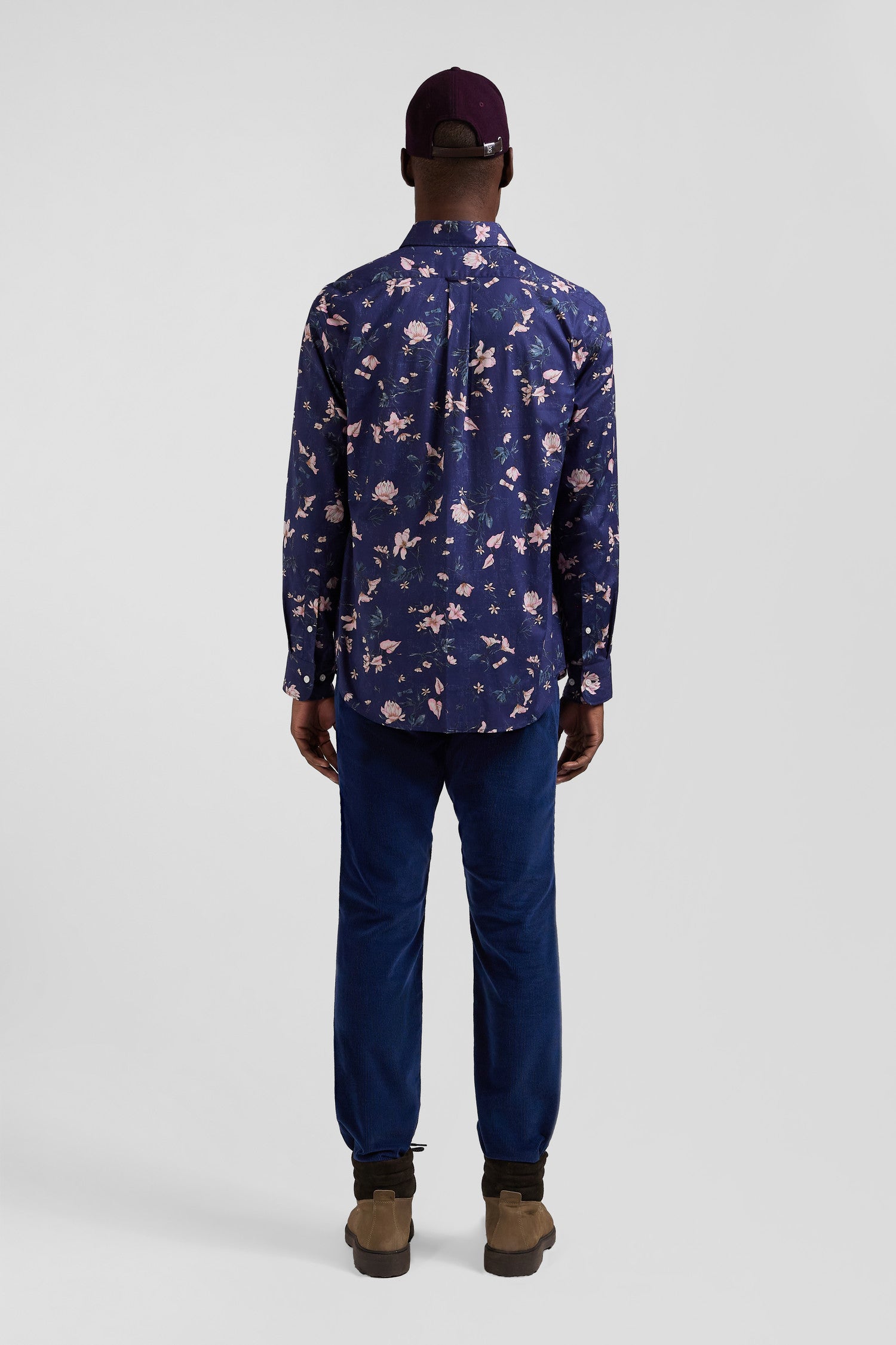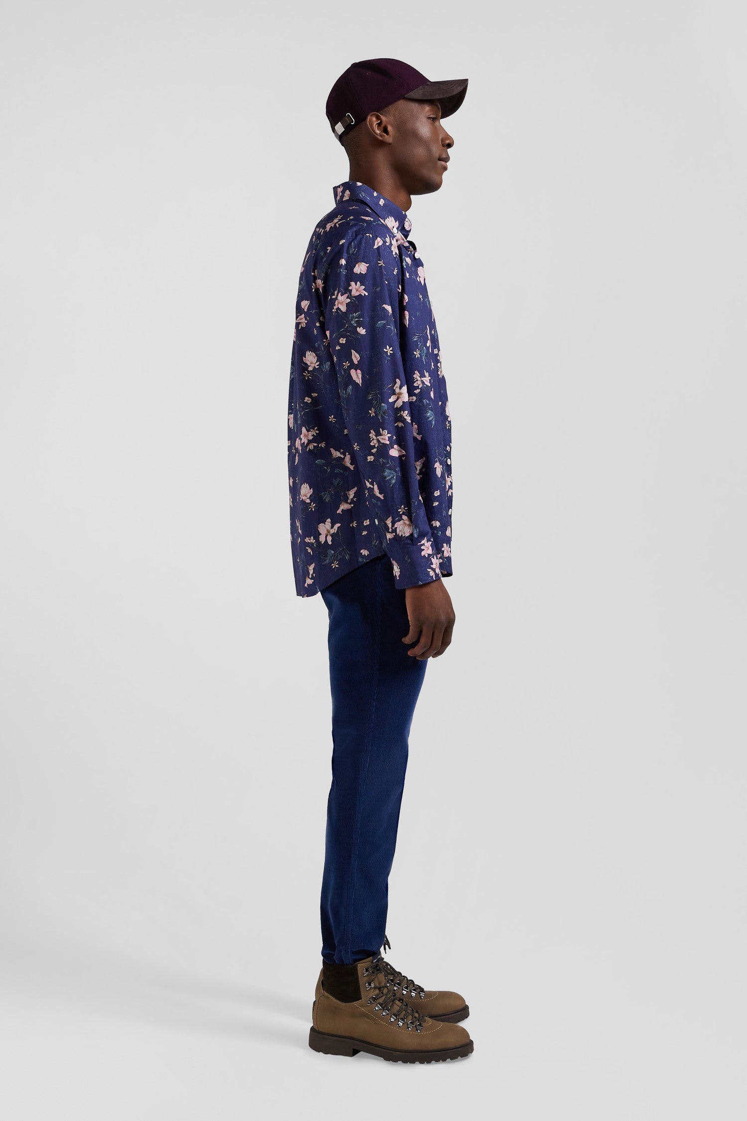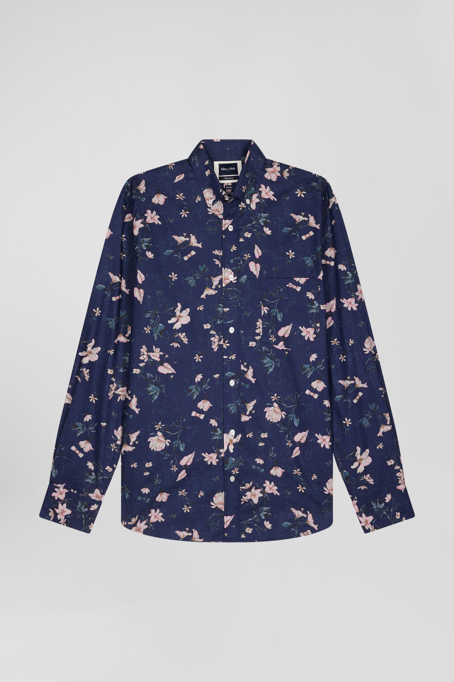 Discover our shirt in Pima cotton poplin, a premium sustainable cotton precisely woven to offer softness and comfort. Adorned with a floral print exclusive to our Maison, this vibrantly designed piece adds a touch of bold elegance to your wardrobe. This navy men's shirt features a button-down point collar, highlighting a modern silhouette accentuated by its straight cut.