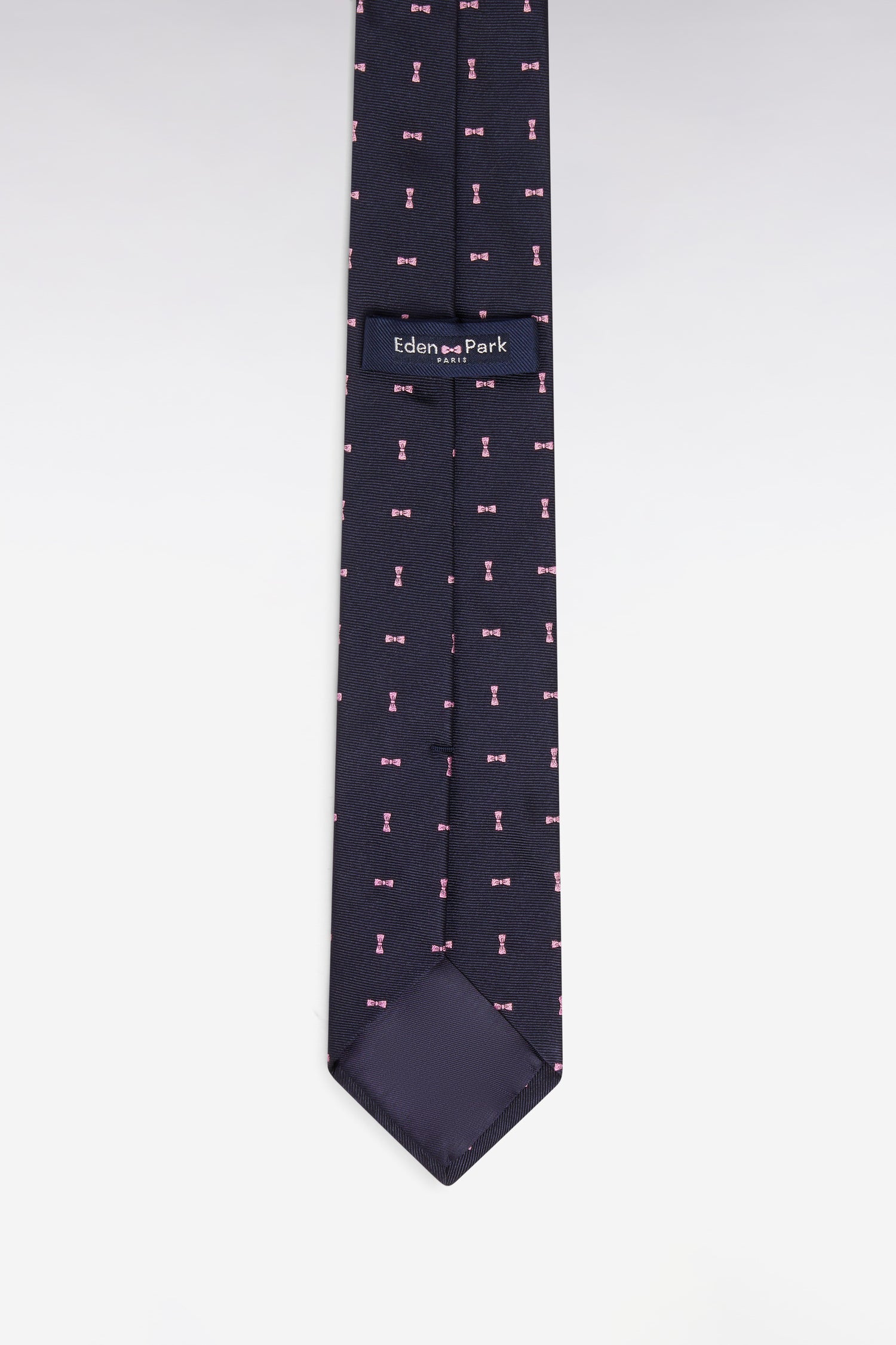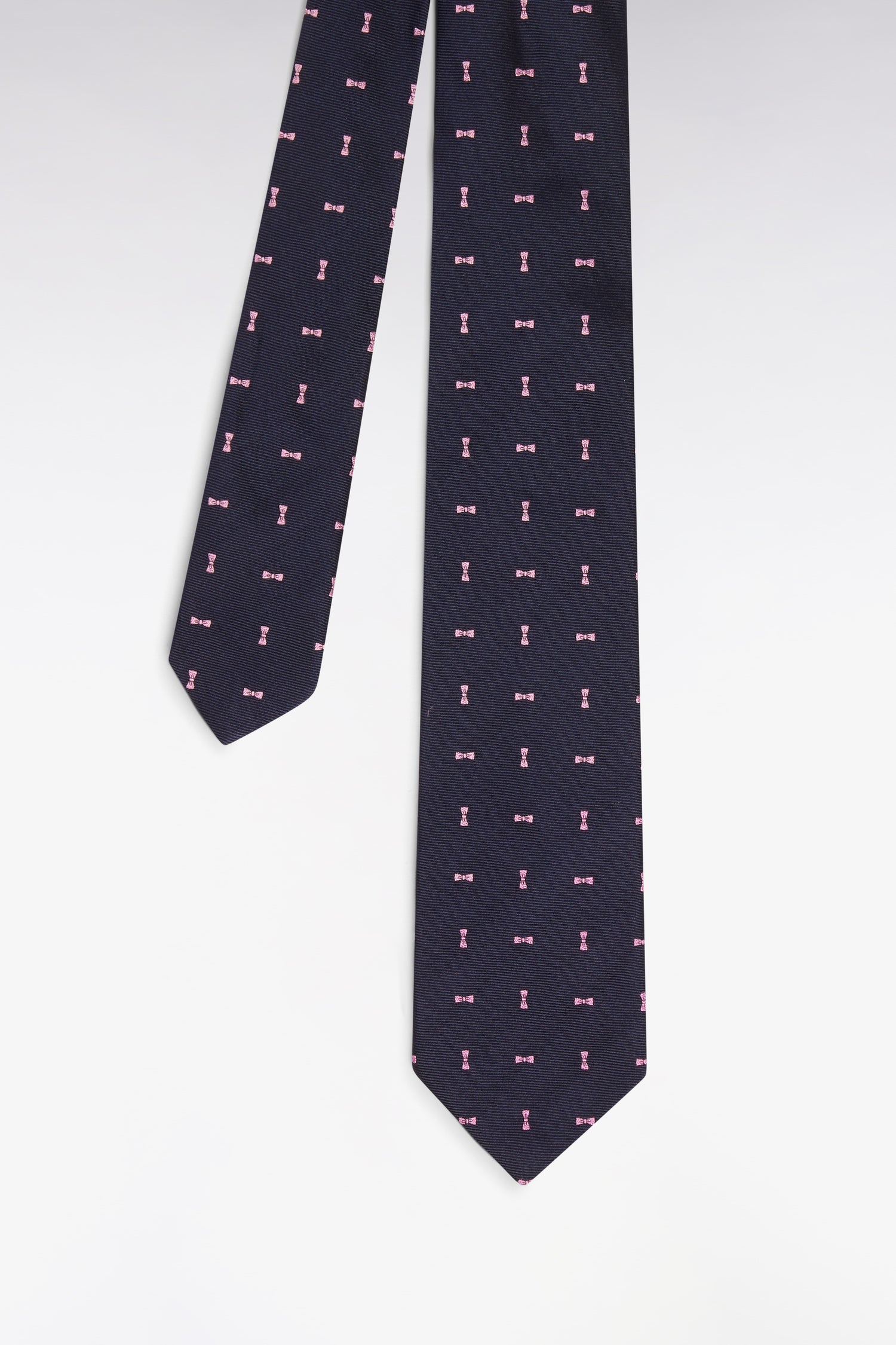 Cravate en soie marine à micromotifs nœuds papillon rose
