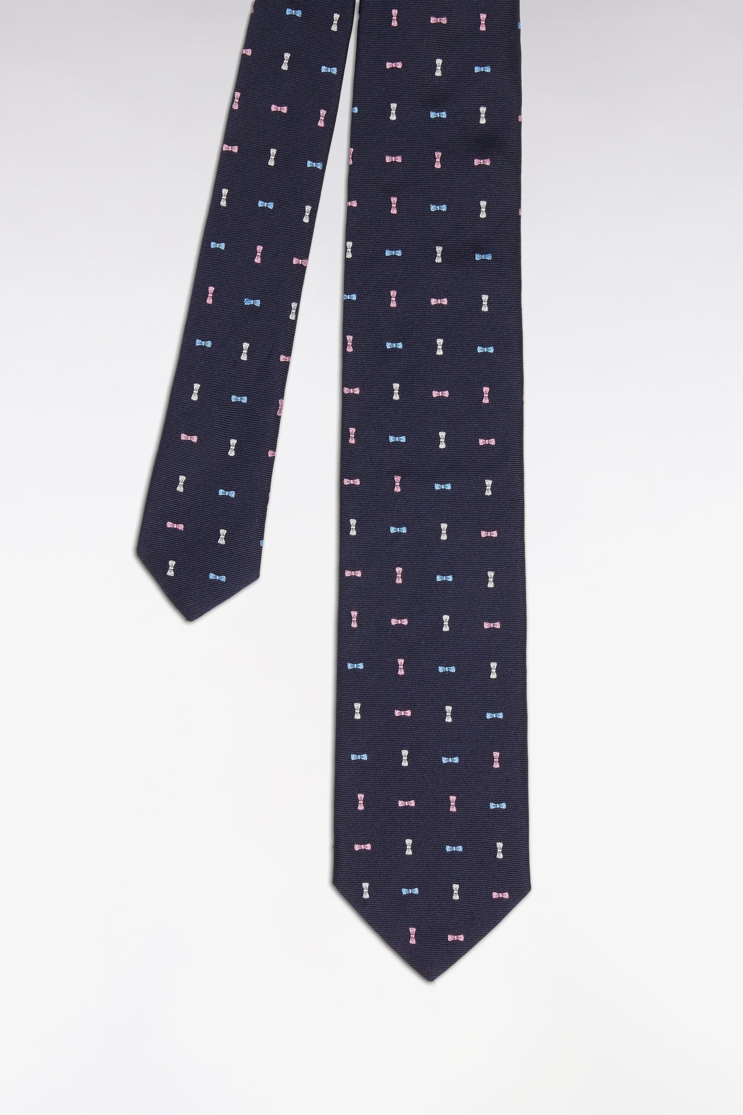 Cravate en soie marine à micromotifs nœuds papillon tricolores