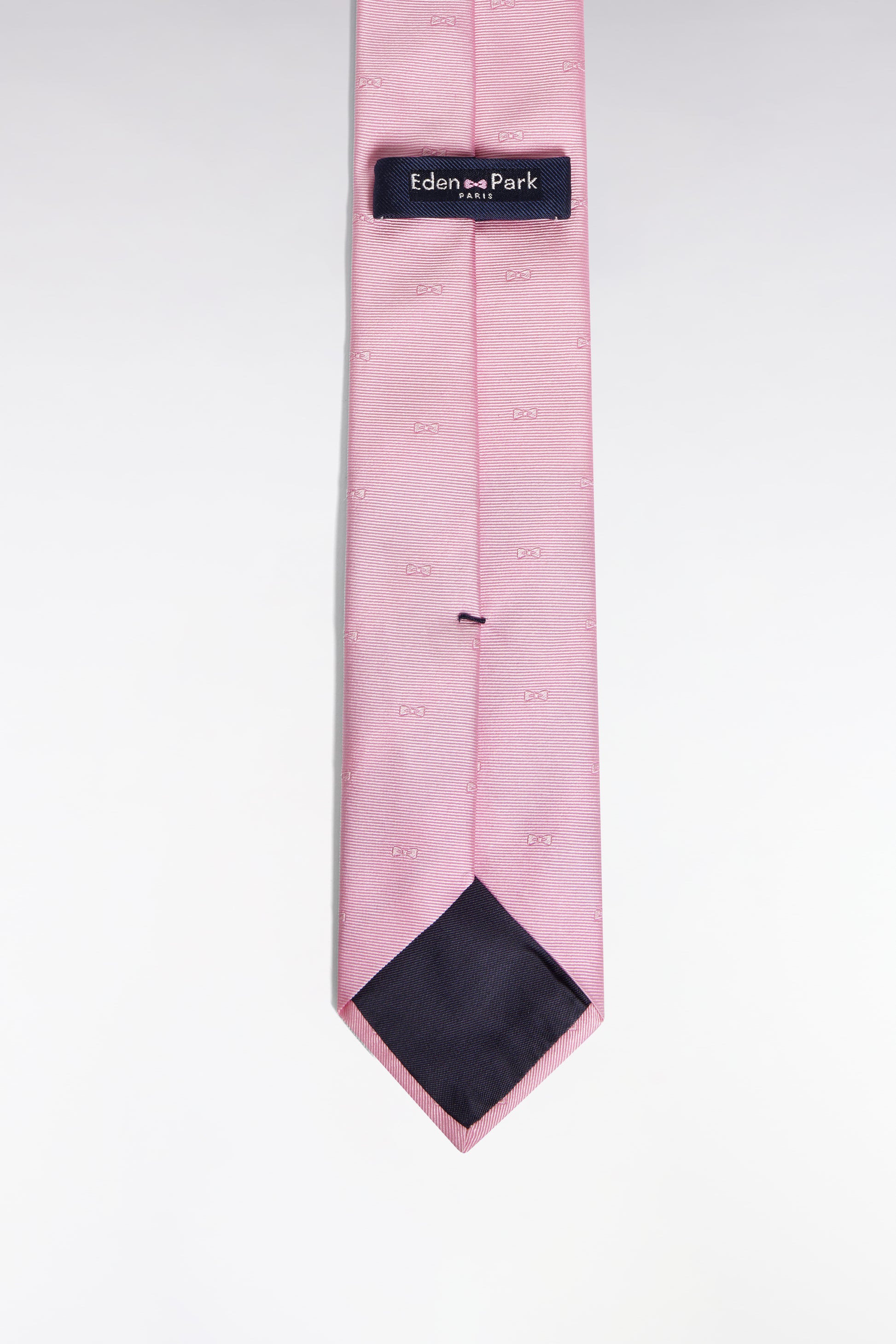 As refined as it is discreet, this silk tie seduces with its tone-on-tone jacquard pattern composed of bow ties, the iconic emblem of our house. In navy or pink, this tie adds an elegant graphic touch to a suit or plain shirt.